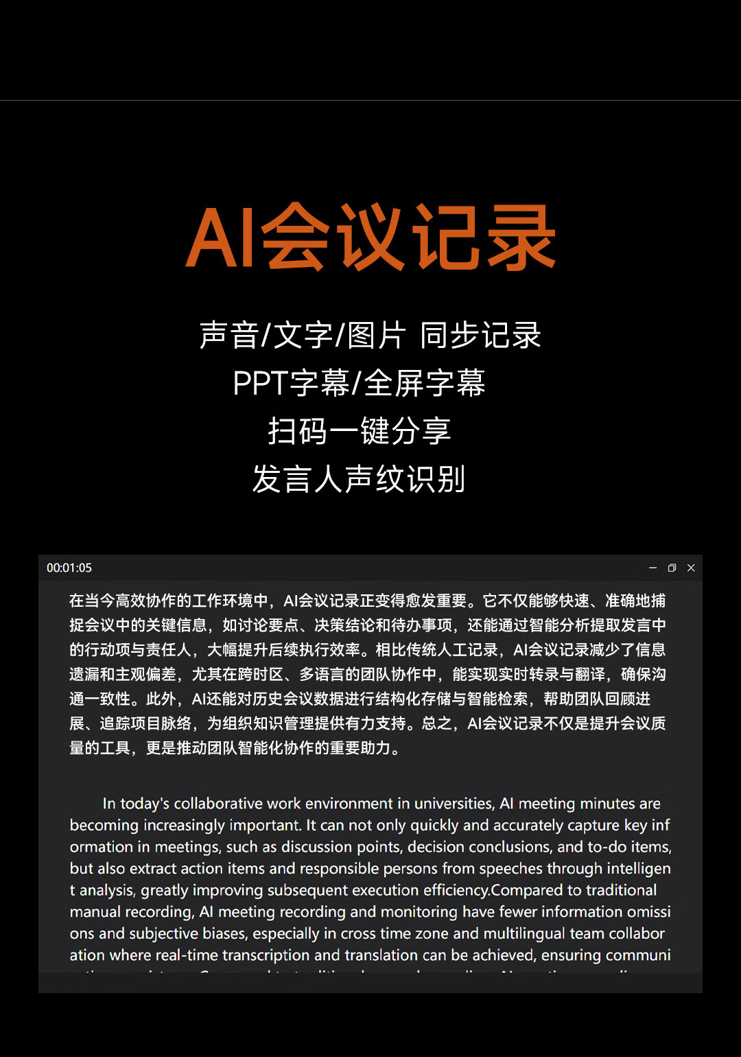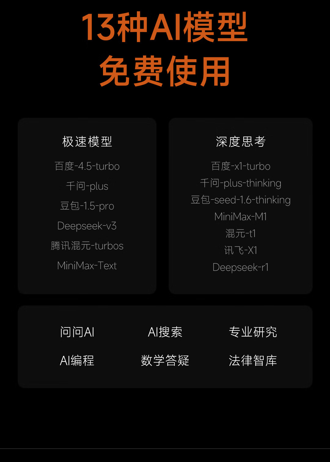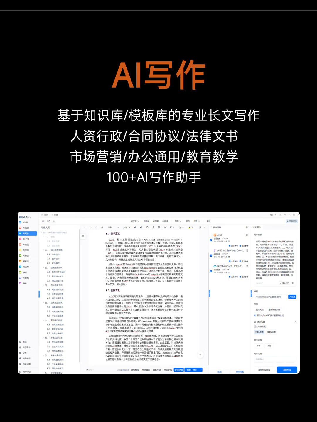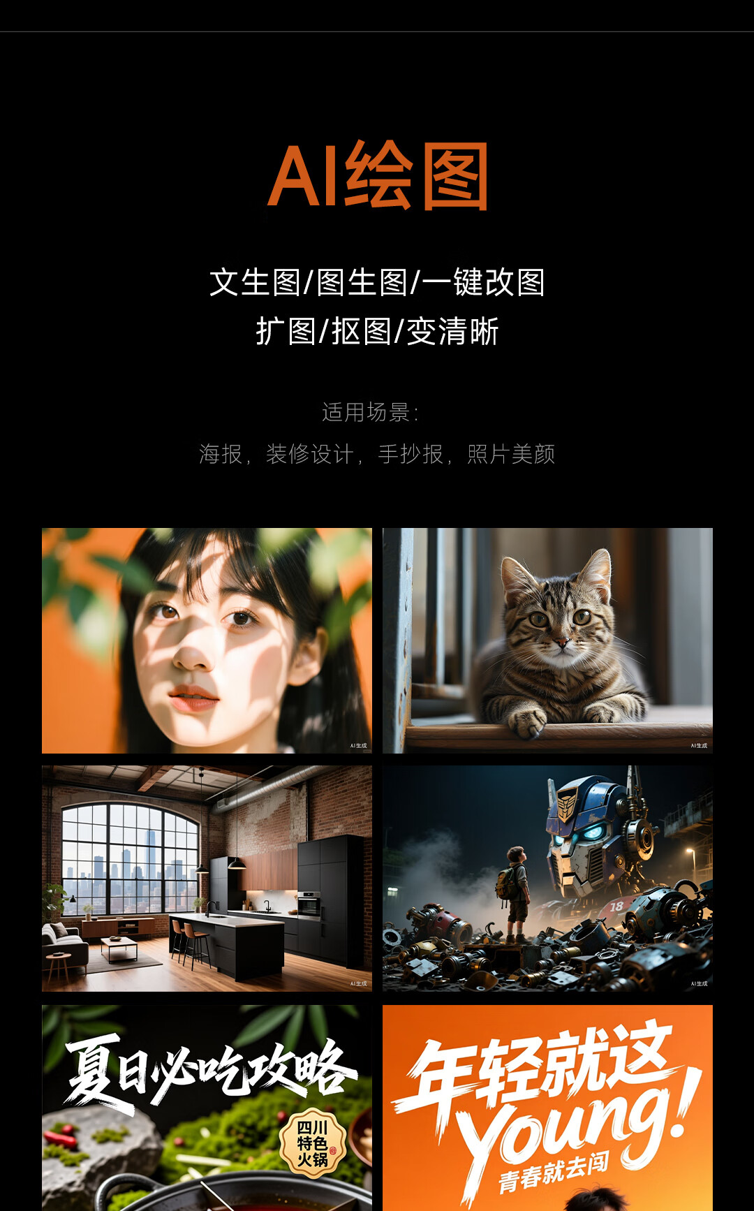 搭载Deepseek-R1模型6大通用模型+;AI制作视频 可语音或是文字下指令 轻松做视频;AI绘图4.2绘准确的图片 功能更强大 ;实时翻译 会议记录 语音识别 写作 表格;APP终身免费下载 更新 多系统兼容