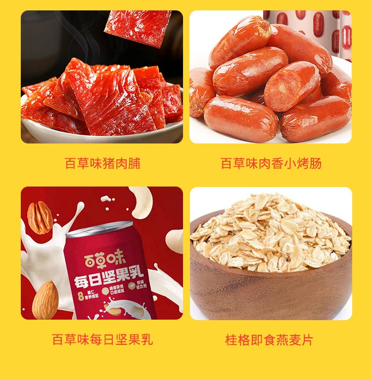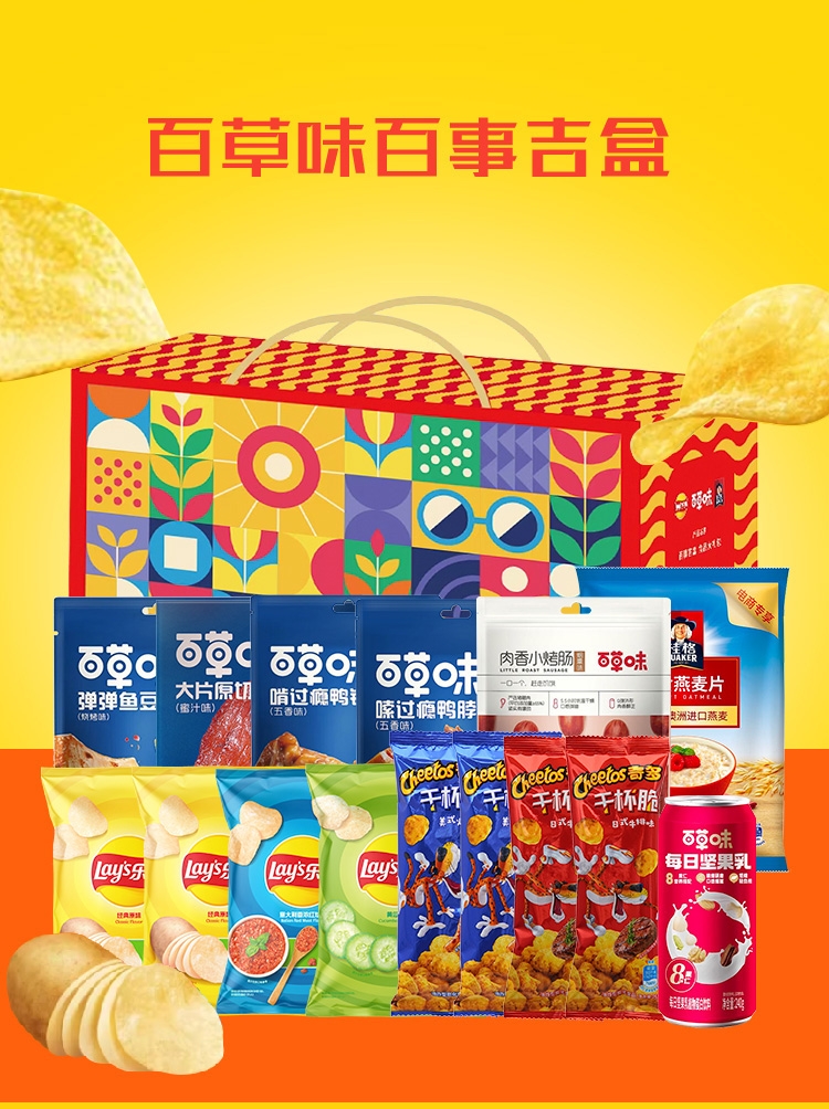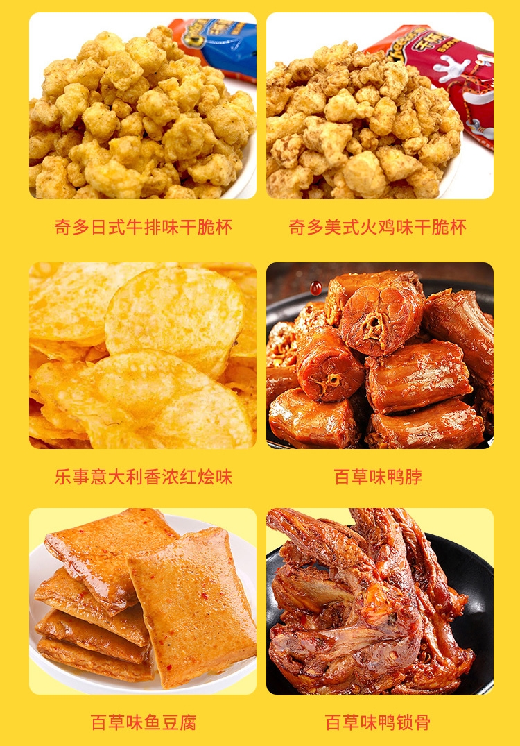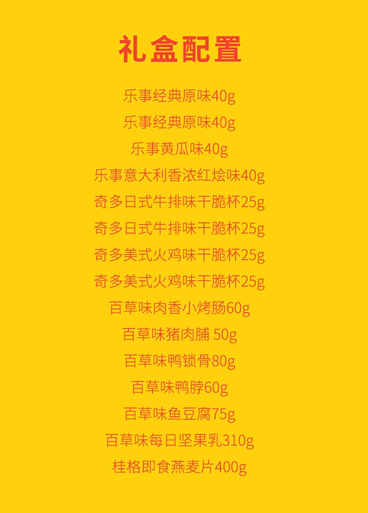 配置清单:乐事经典原味40g 乐事经典原味40g 乐事黄瓜味40g 乐事意大利香浓红烩味40g 奇多日式牛排味干脆杯25g 奇多日式牛排味干脆杯25g 奇多美式火鸡味干脆杯25g 奇多美式火鸡味干脆杯25g 百草味肉香小烤肠60g 百草味猪肉脯 50g 百草味鸭锁骨80g 百草味鸭脖60g 百草味鱼豆腐75g 百草味每日坚果乳310g 桂格即食燕麦片400g