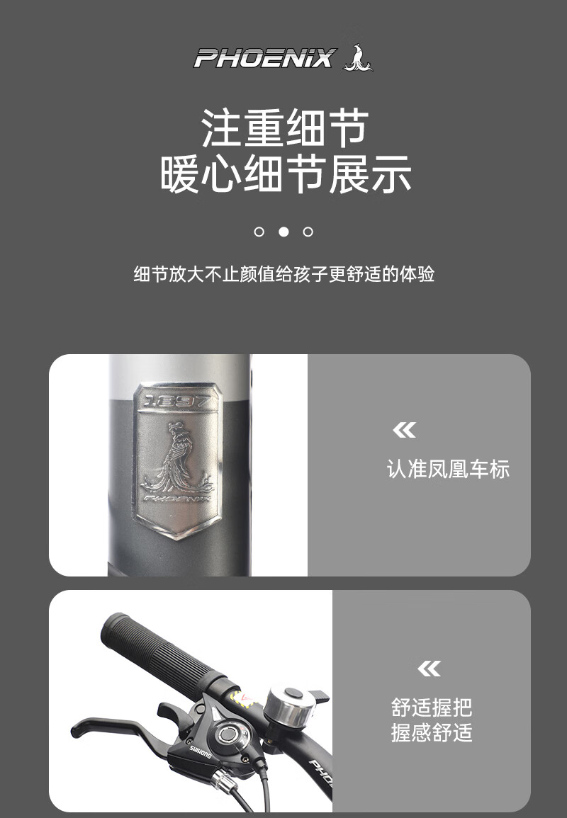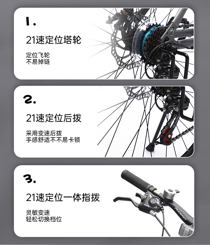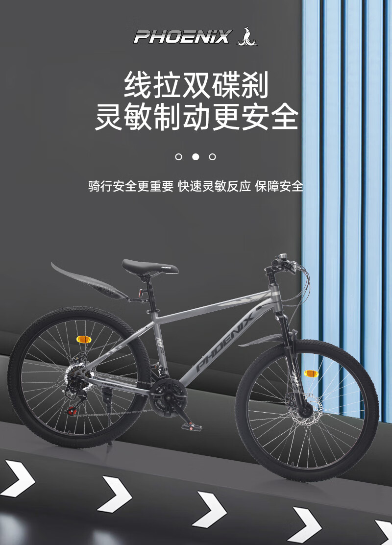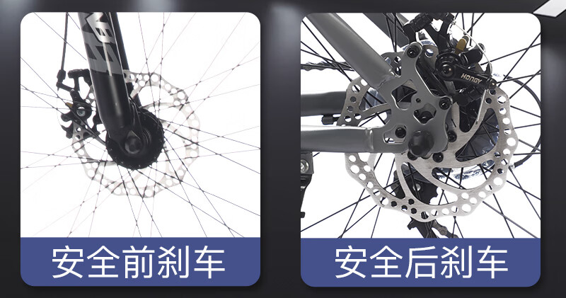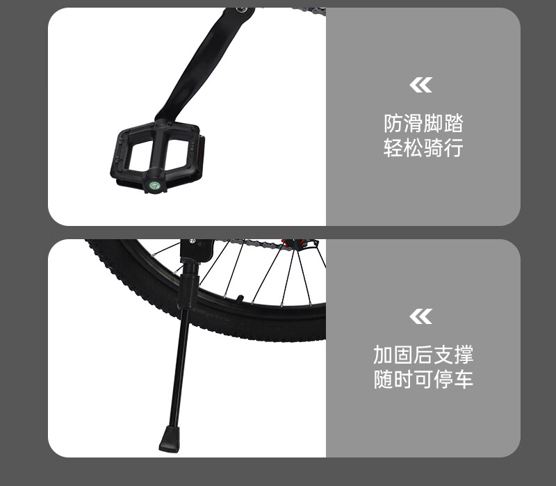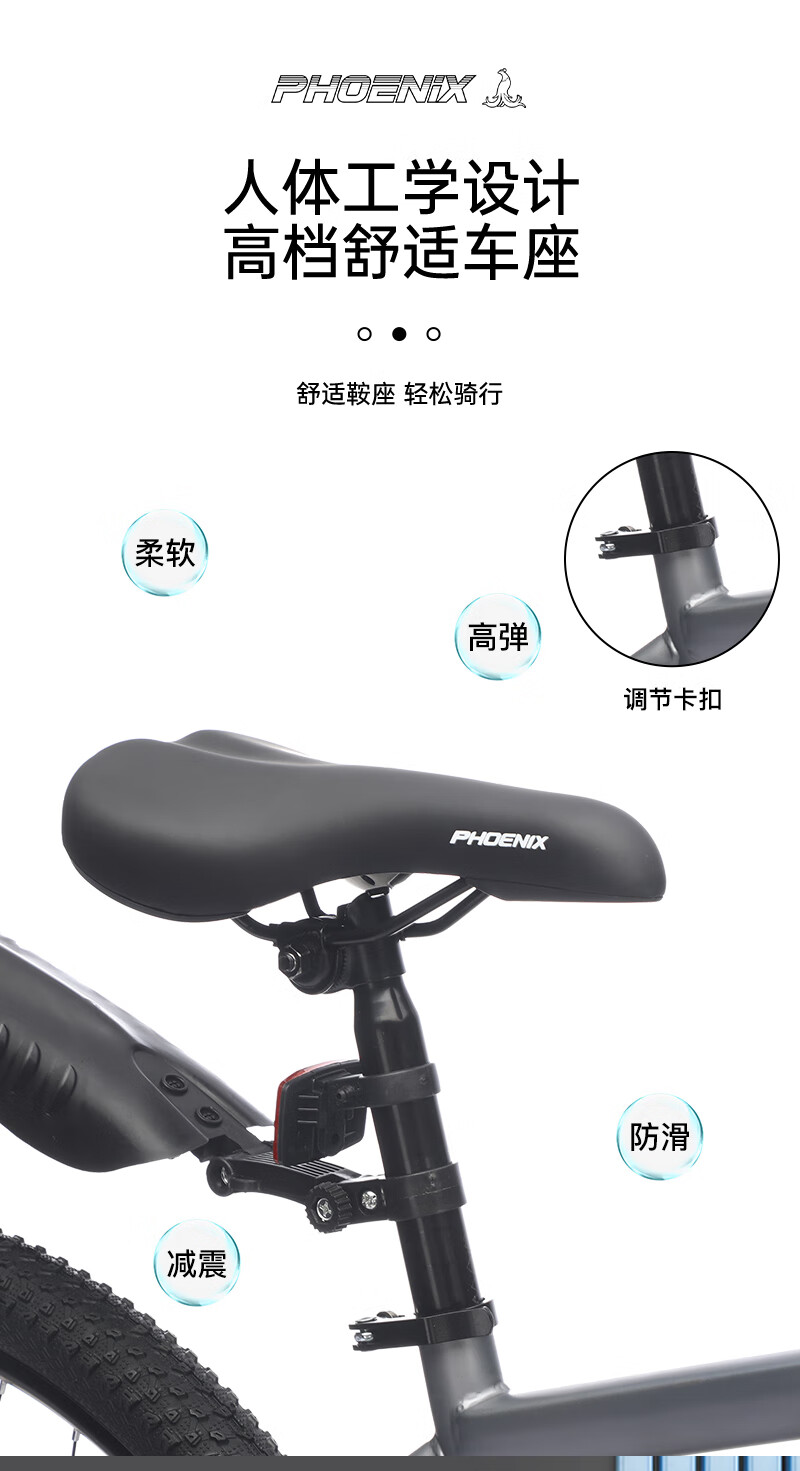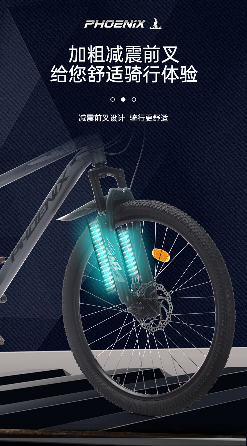 人体工学设计高档舒适车座;;减震前叉设计 骑行更舒适;;线拉双碟刹灵敏制动更安全;;加厚防滑轮胎,轻松通过多种路况,防滑纹理设计抓地强;加固一字横把 稳固前行; 灵敏变速系统,骑行多样乐