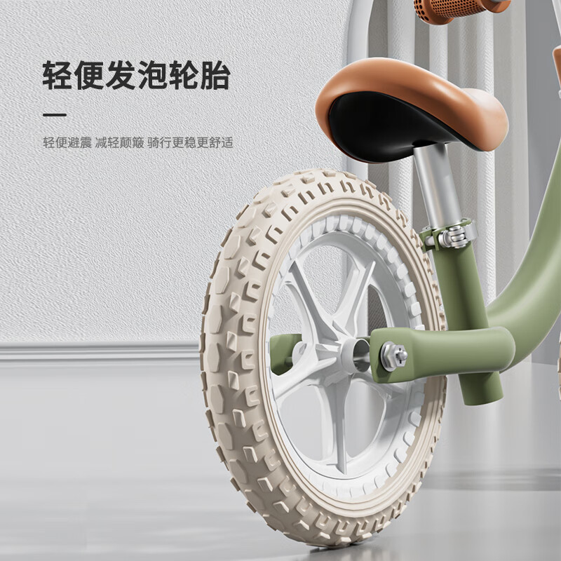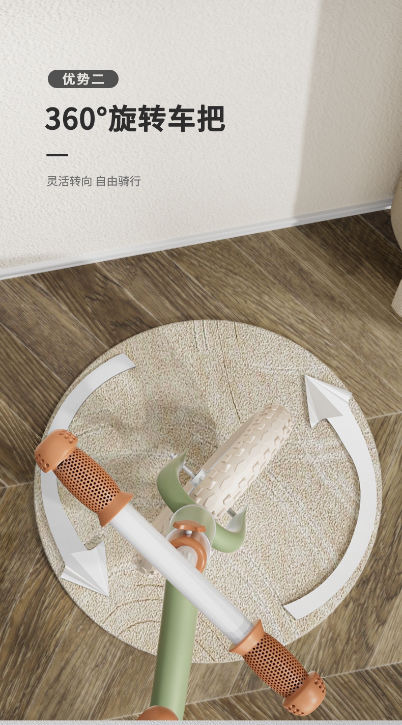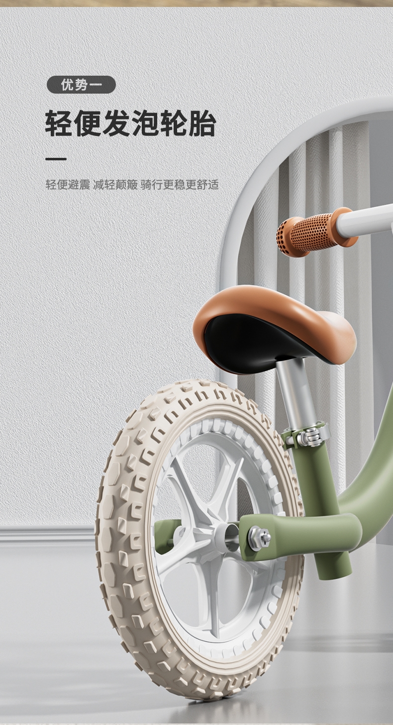 360°旋转车把,灵活转向自由骑行;轻便发泡轮胎,轻便避震减轻颠簸骑行更稳更舒适;尖锐无棱角圆滑顺畅,整车打磨,让骑行更安全