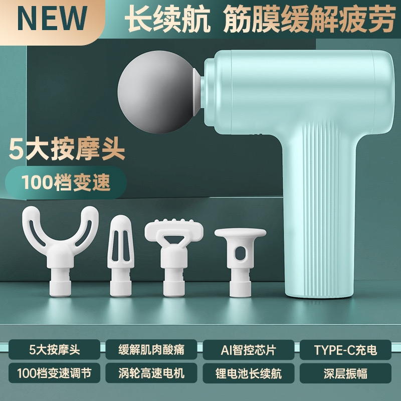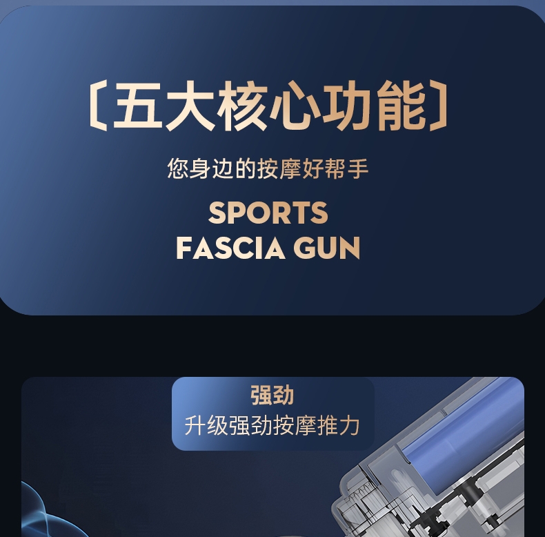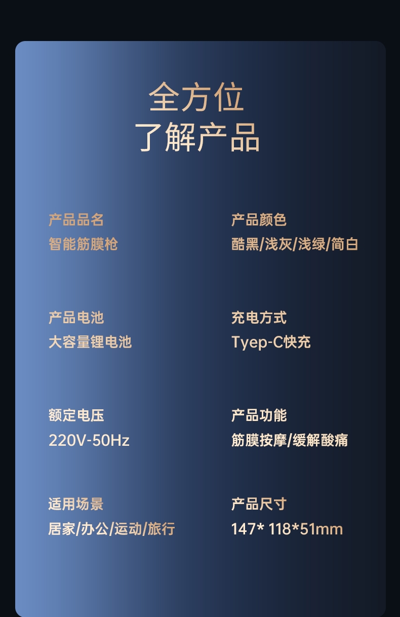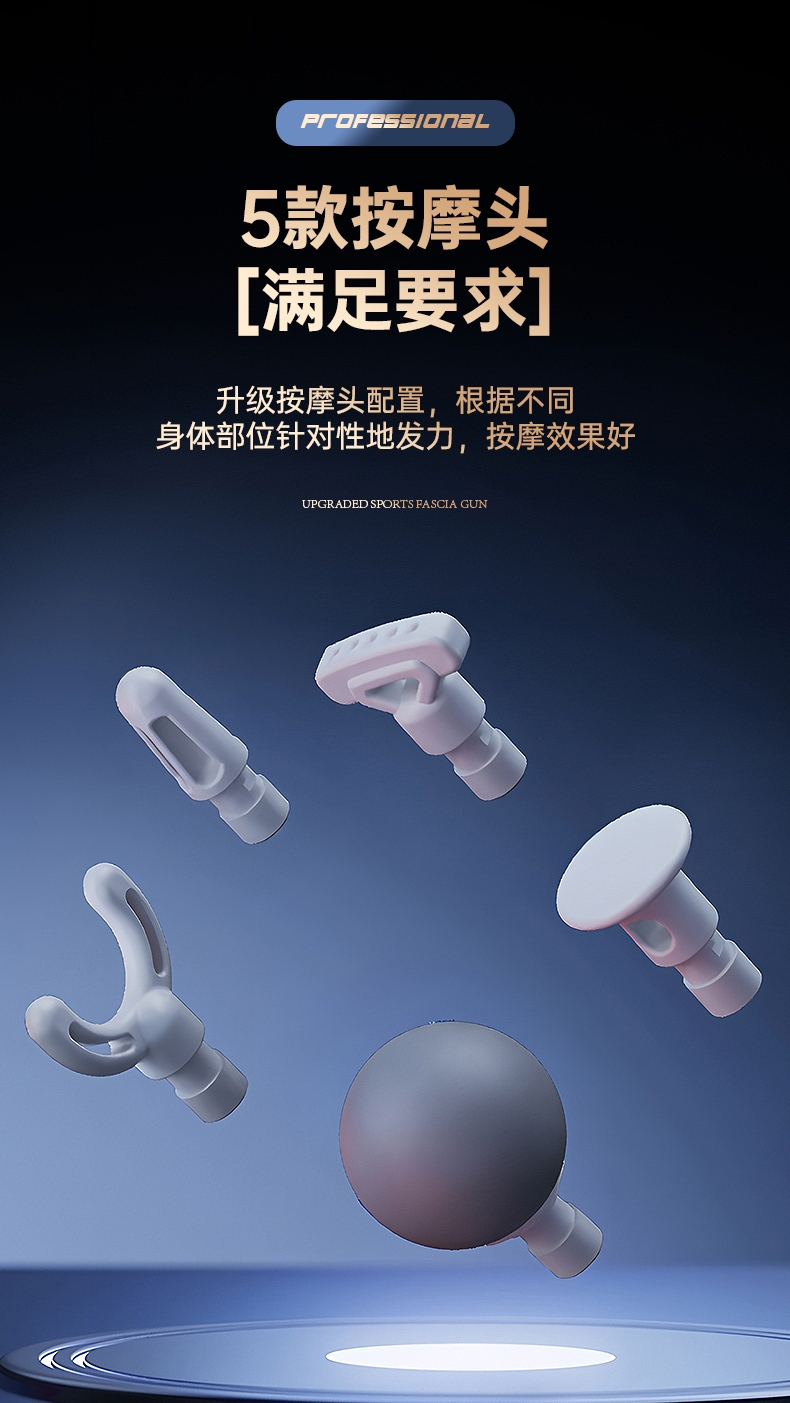 产品包装:筋膜枪+按摩头*5+充电线+说明书+彩盒