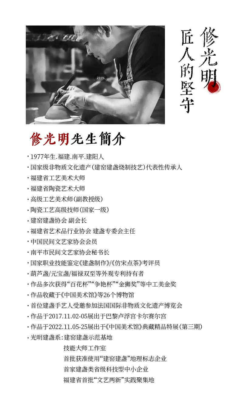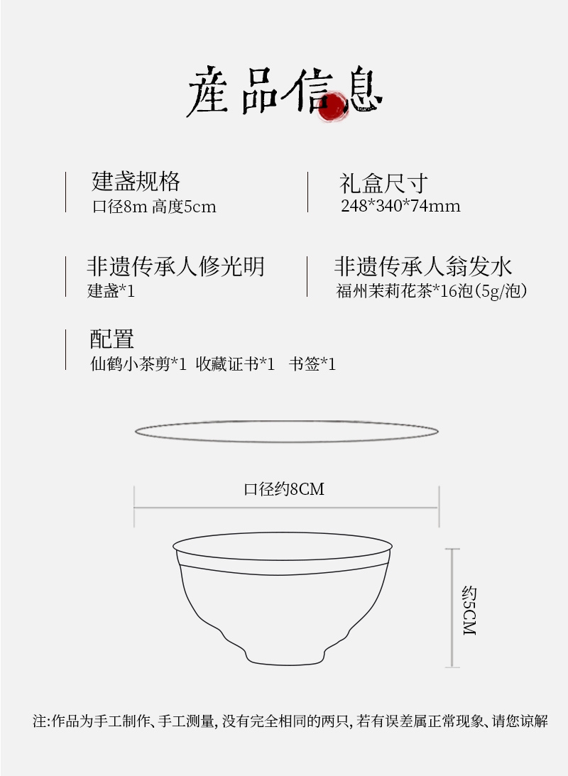 配置清单:非遗传承人修光明建盏*1(两款建盏任选)福州茉莉花茶5g*16泡(省级非遗传承人翁发水老师制) 仙鹤茶剪*1、 书签*1、扉页*1