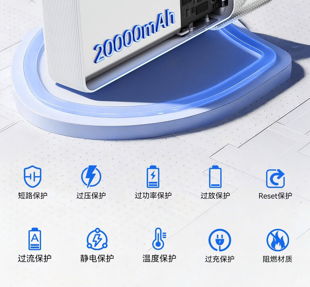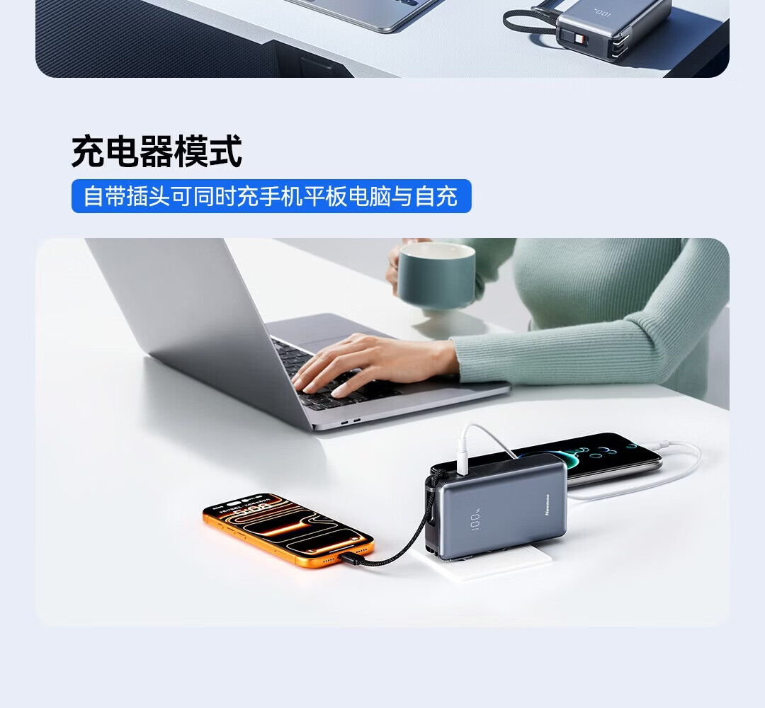 功能:多U口输出,双向快充,自带数据线