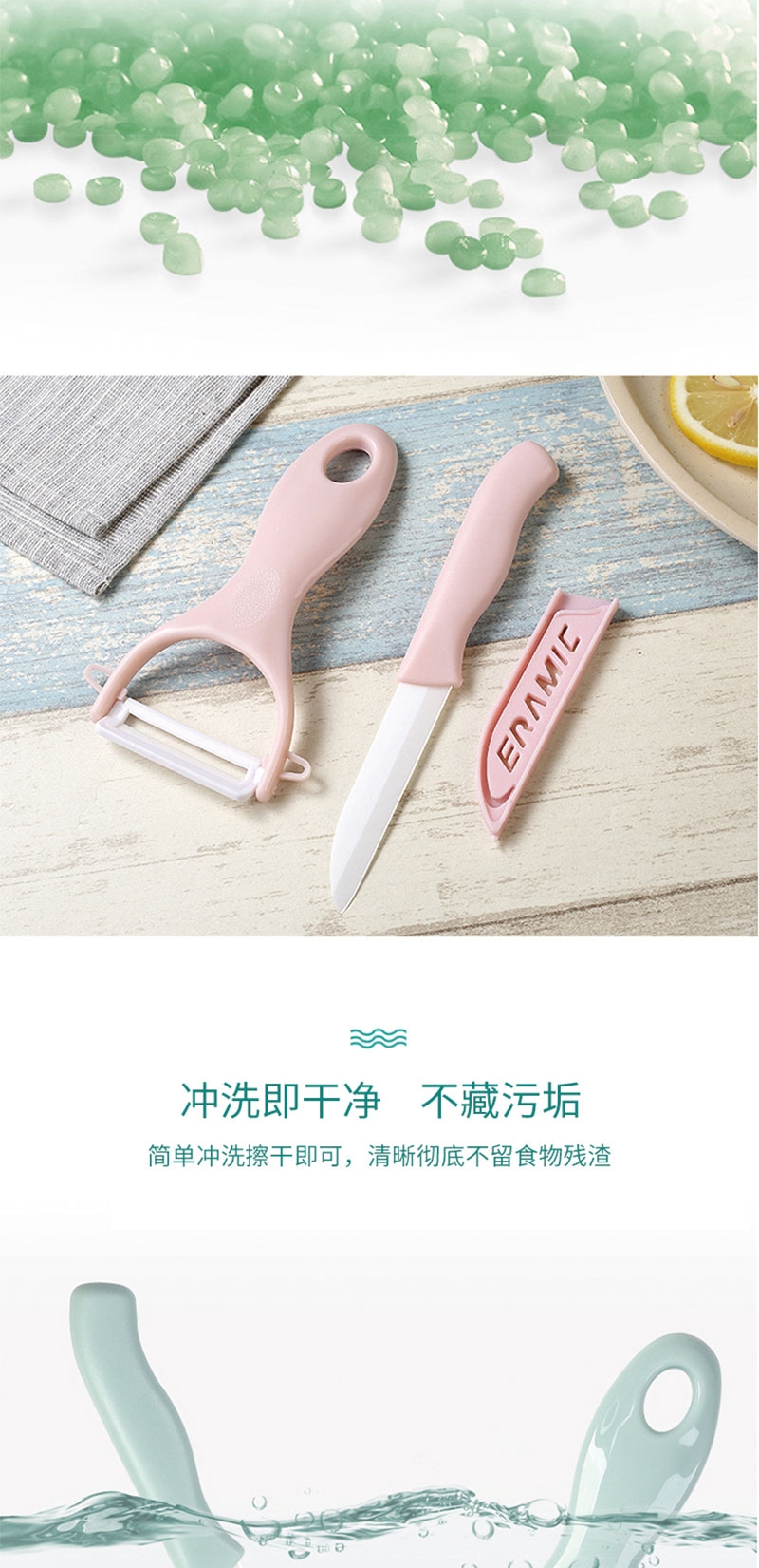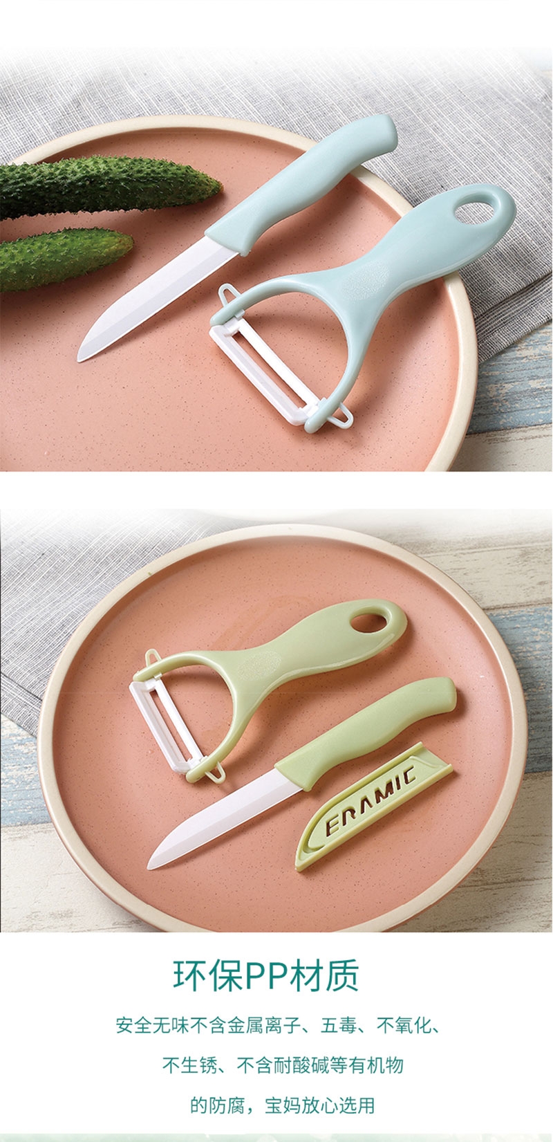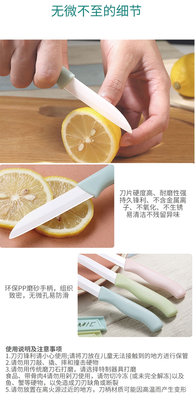 刀刃锋利不生锈:陶瓷刀切口干净;削皮器贴合果蔬弧度,削皮又快又薄;水果刀切果肉、削皮器去果皮,从削皮到切块一步到位