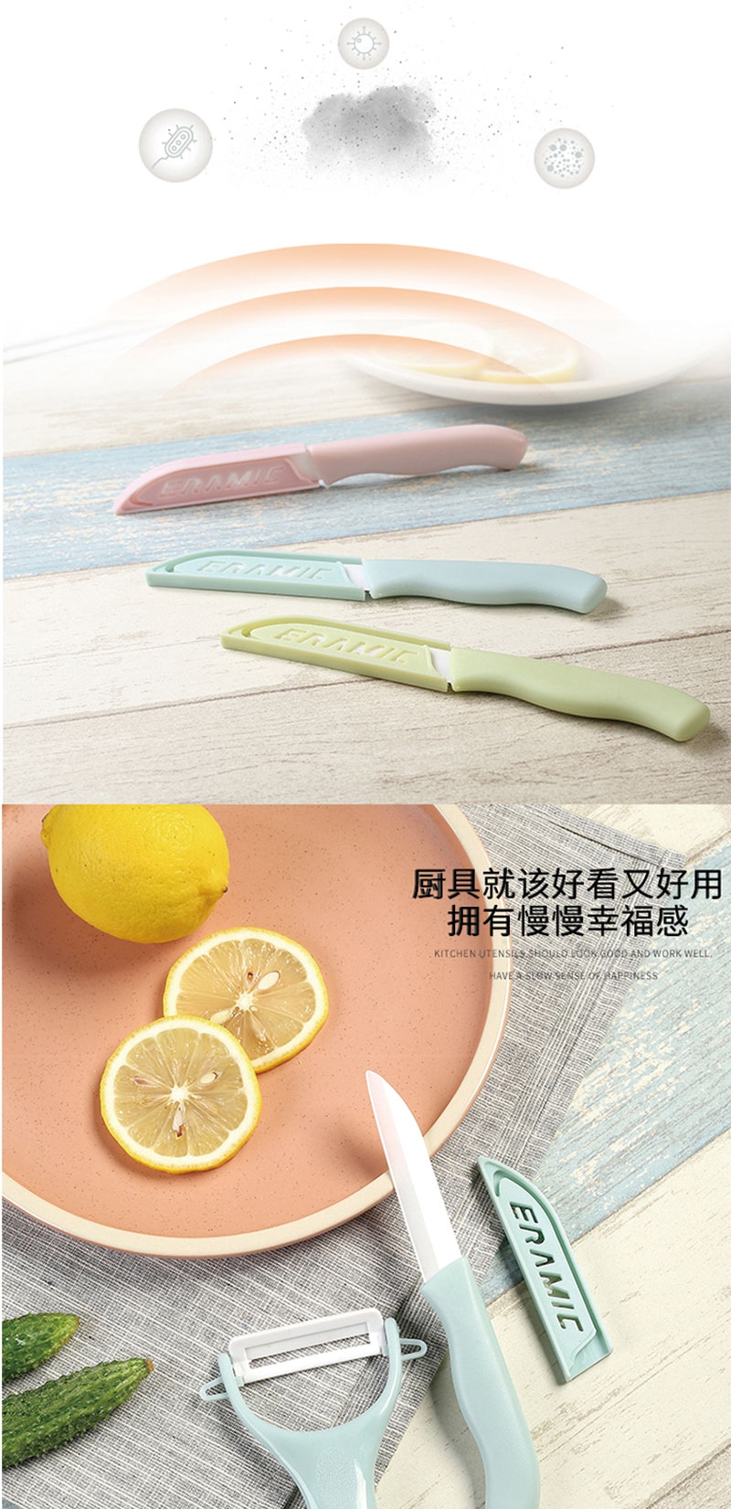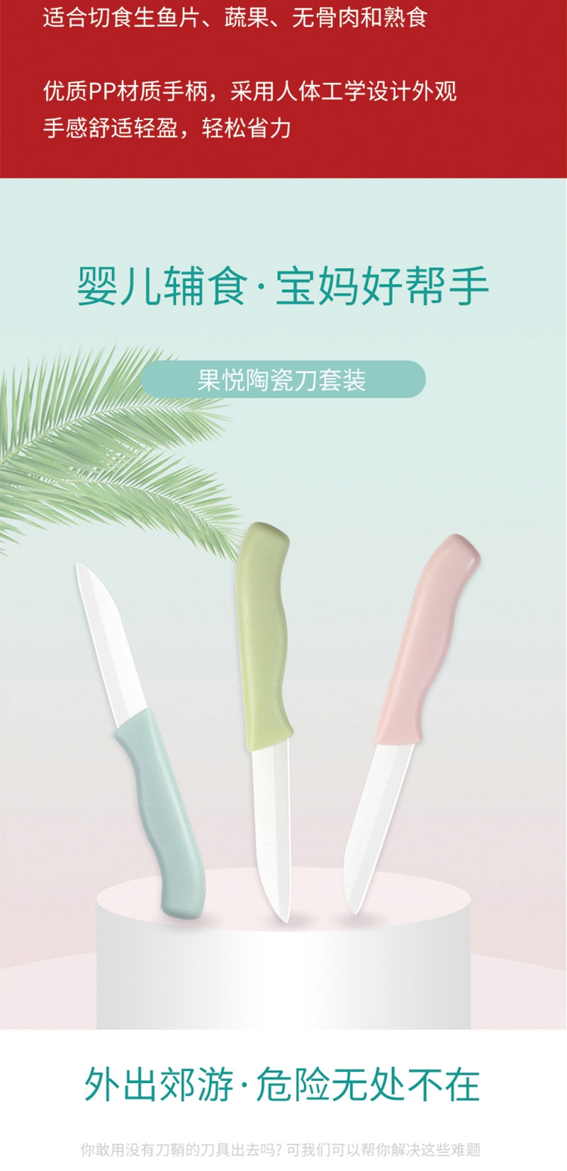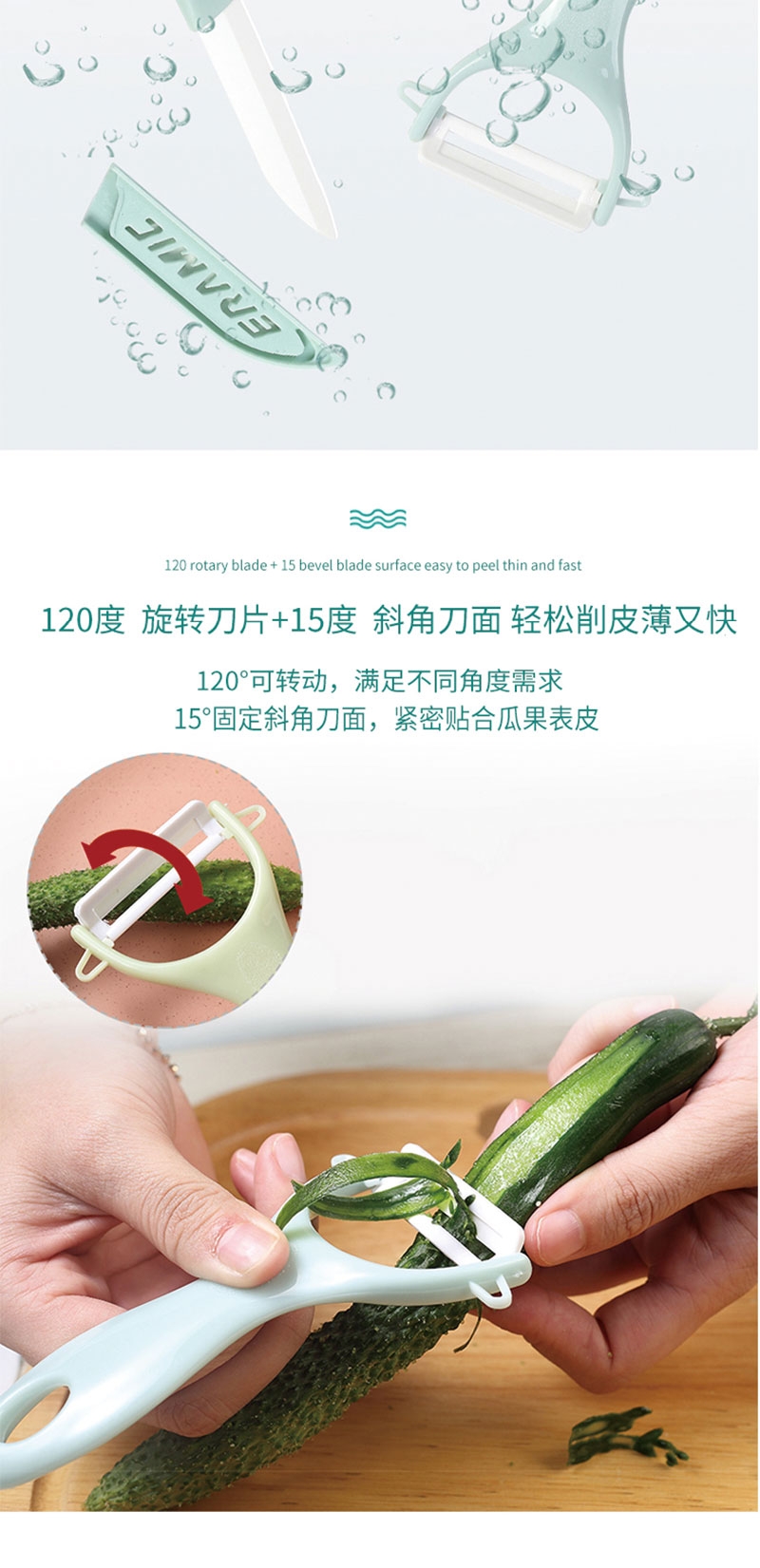 刀刃锋利不生锈:陶瓷刀切口干净;削皮器贴合果蔬弧度,削皮又快又薄;水果刀切果肉、削皮器去果皮,从削皮到切块一步到位