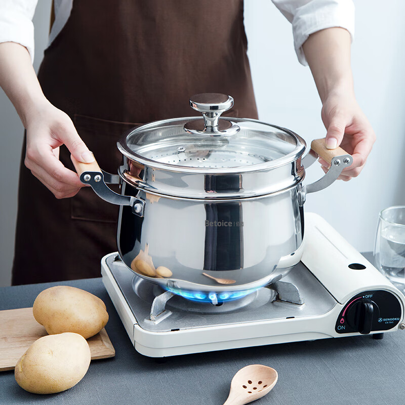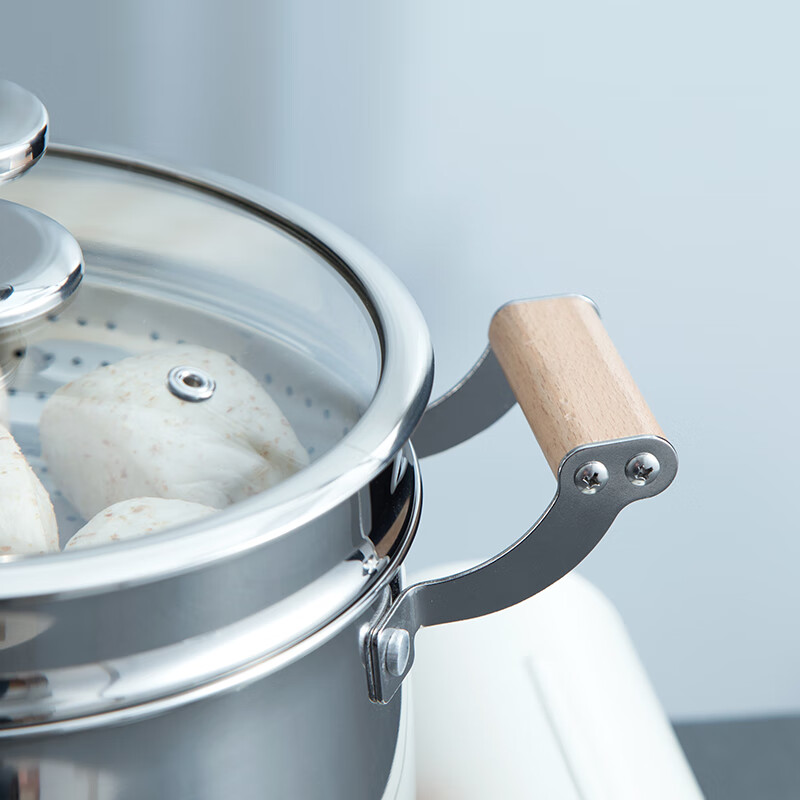 锅身材质为304不锈钢,安全健康,坚固耐用;;蒸格打孔均匀,边缘打磨光滑,不易伤手,使用安全;人性化高强度钢化玻璃锅盖,烹饪美味一目了然;木质手柄,隔热防烫,使用舒适;不挑炉灶,电磁炉、燃气灶均可使用