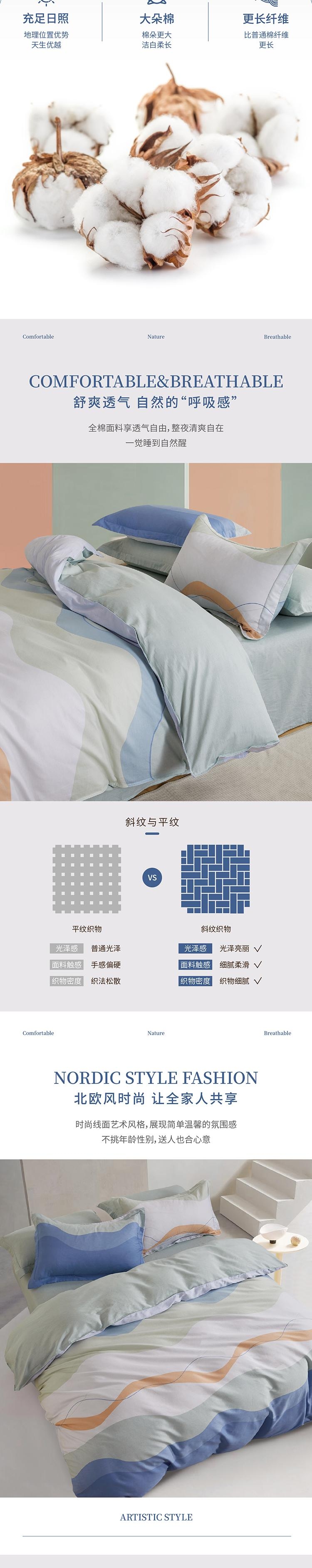 100%棉织造,触感柔软,极为亲肤;具有良好的透气性和吸湿性,令人感觉舒适;它还具有防菌抗螨的作用,用起来更安心、更健康
