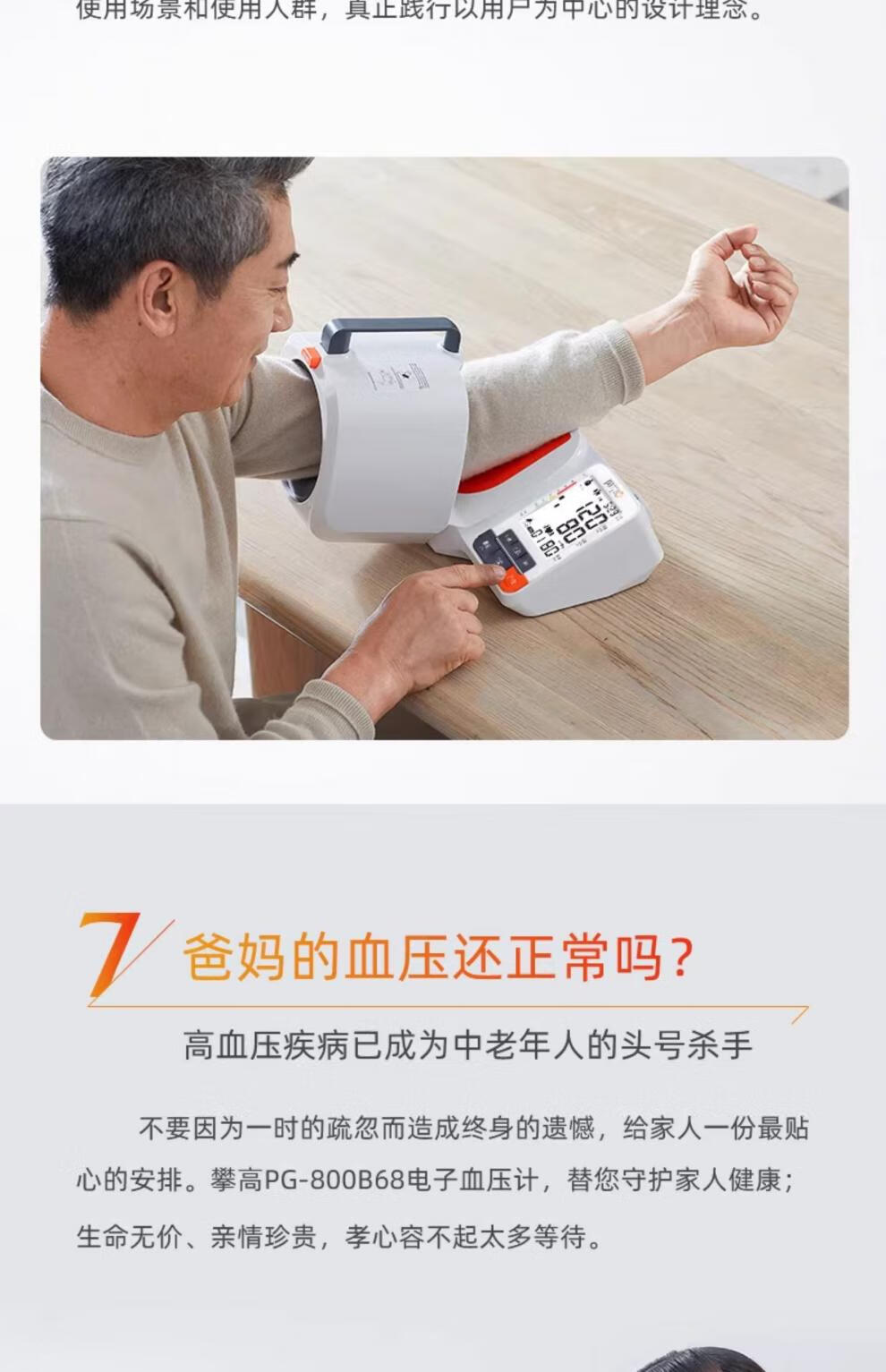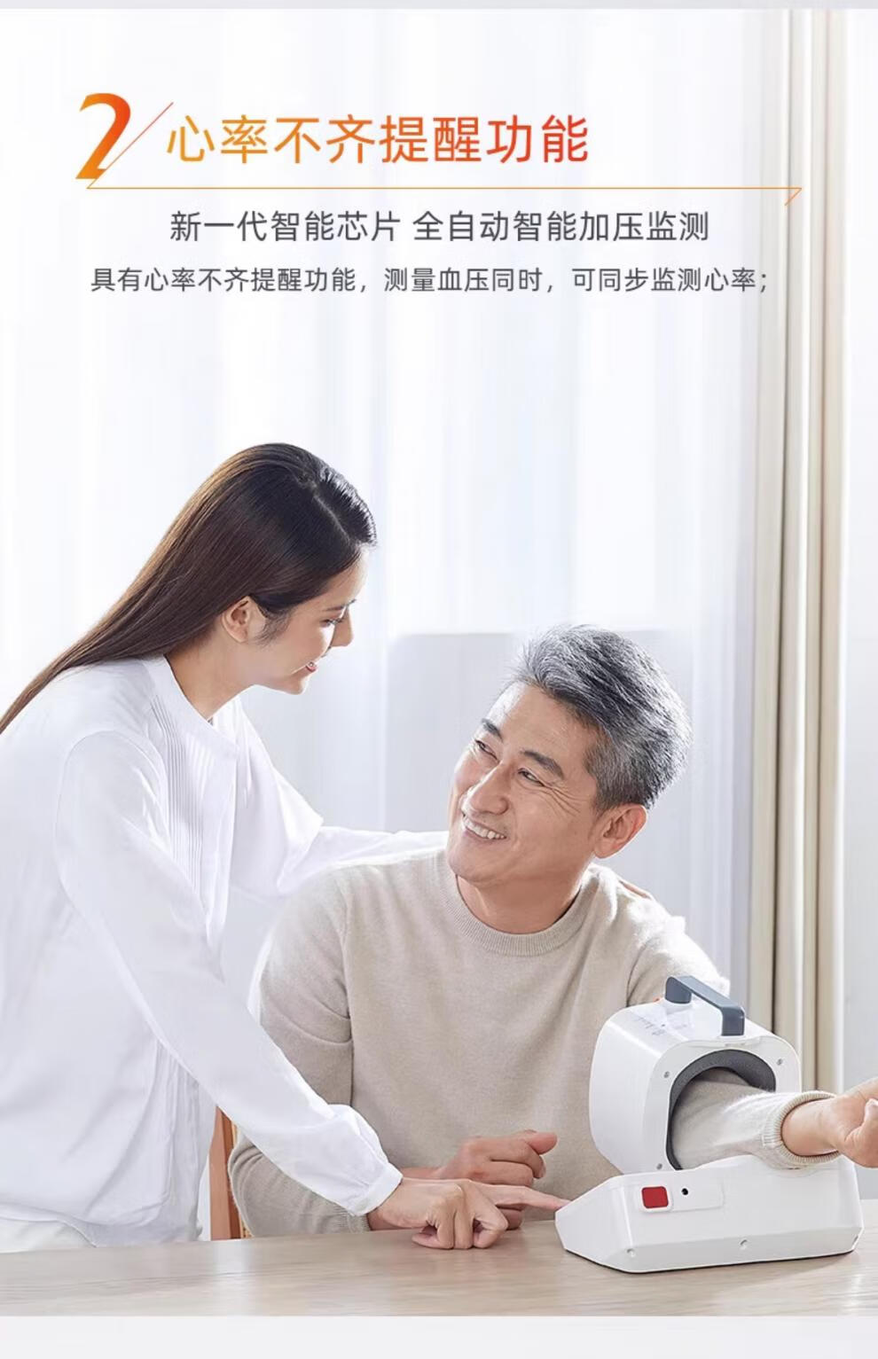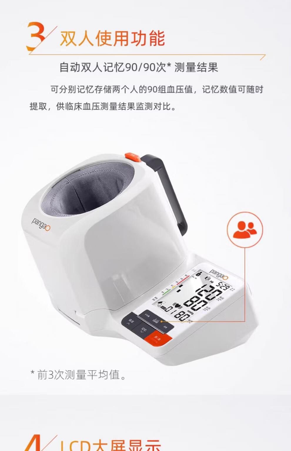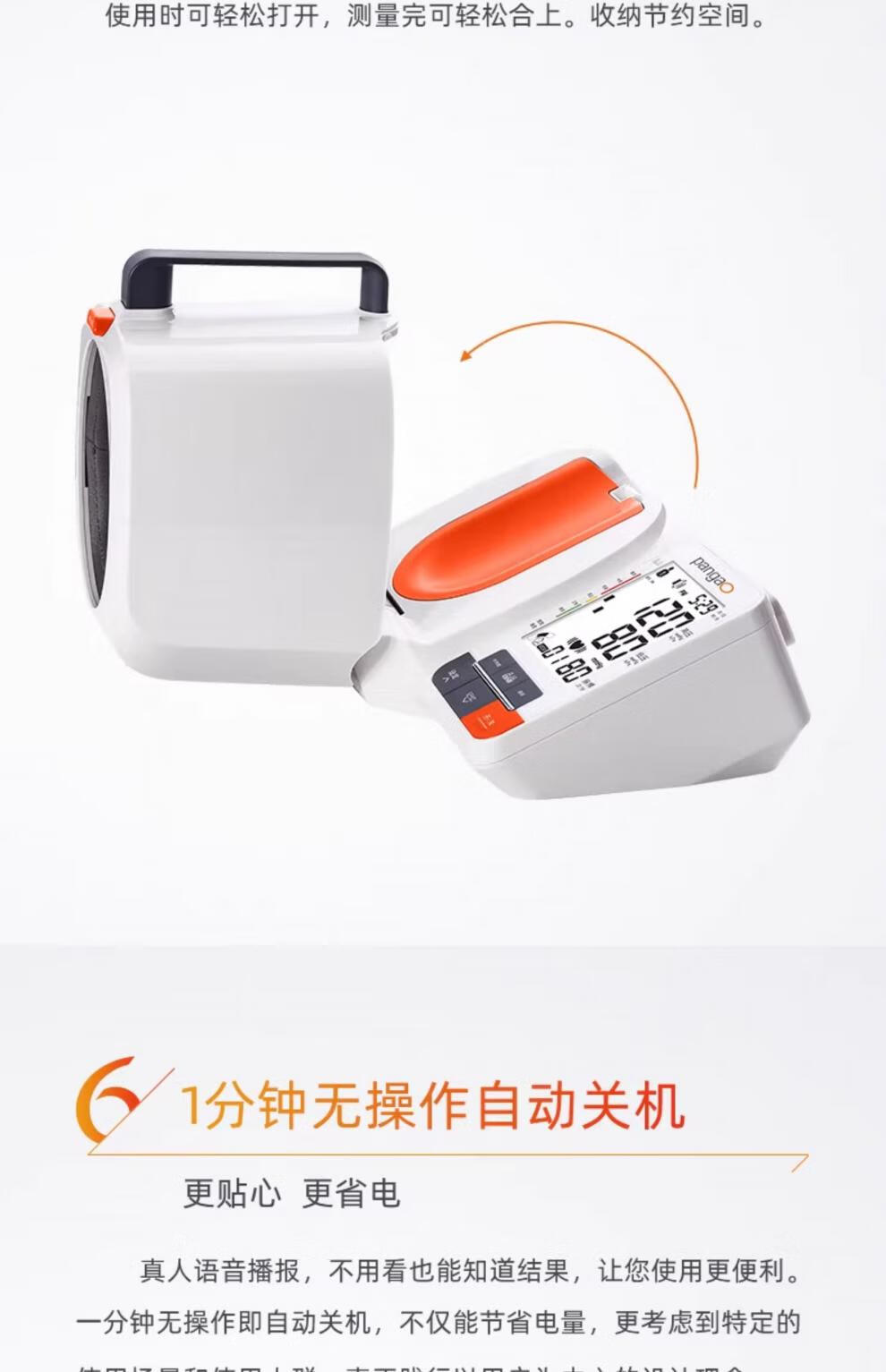 臂筒式设计,免绑袖带,无须协助;可动式臂筒,自由调节角度,确保测压更精准;高清大屏,字号大且清晰,看得不费力