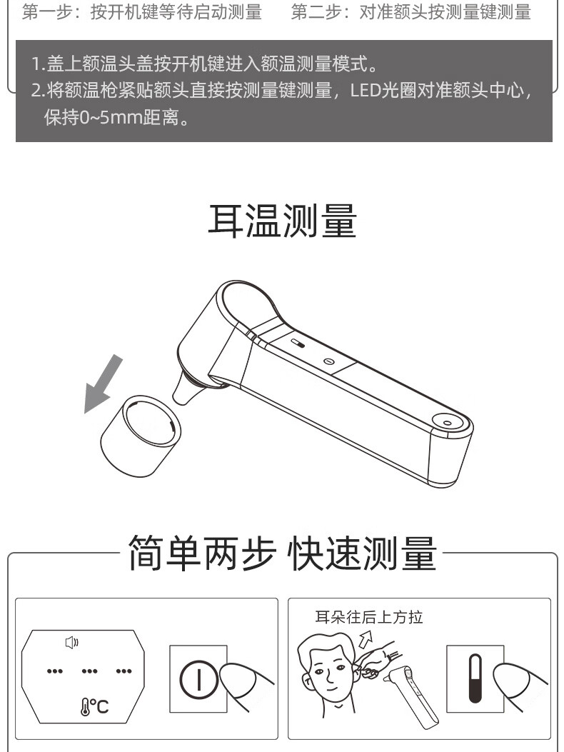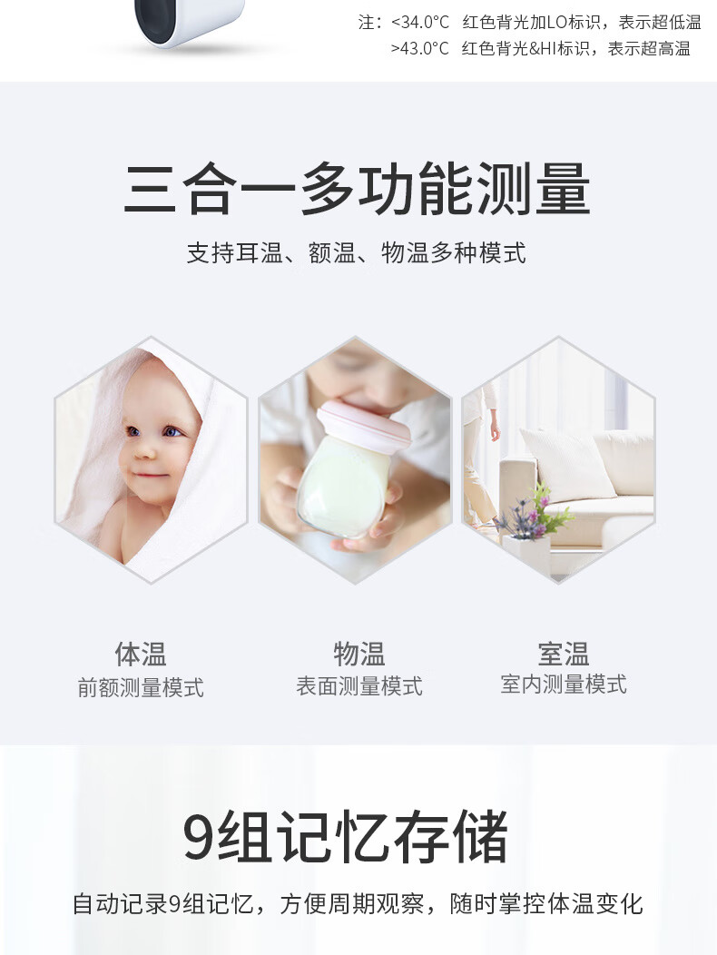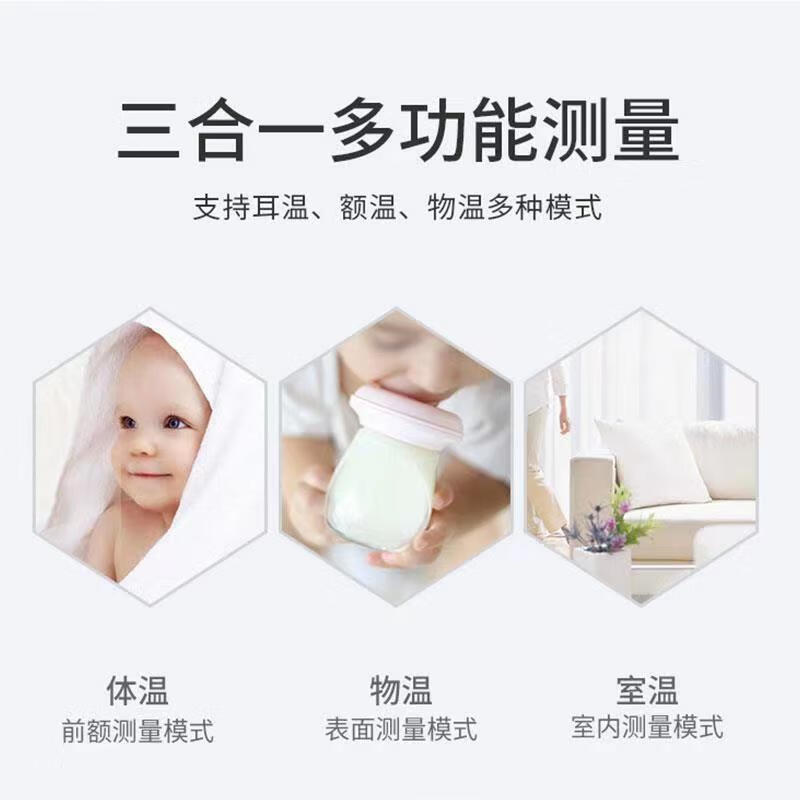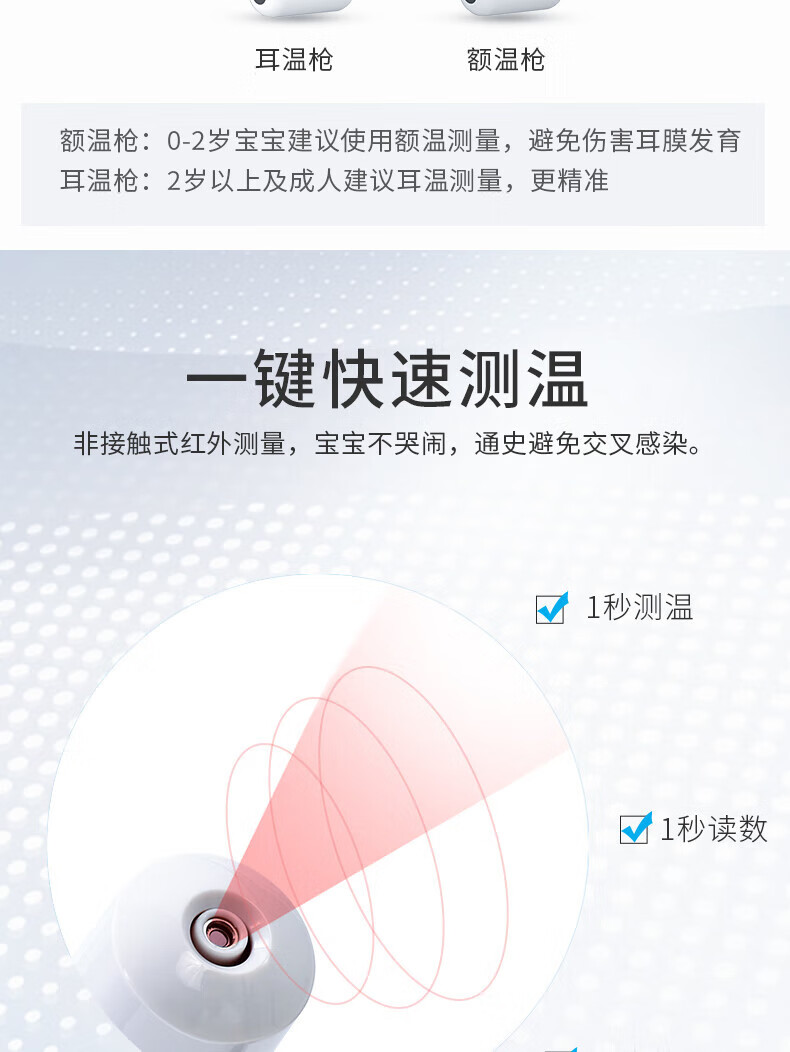 耳温、额温两用,区分测量更准确;1秒快速测量:非接触式红外测量,1秒测温,精准测量;两个温度单位F/C自由切换