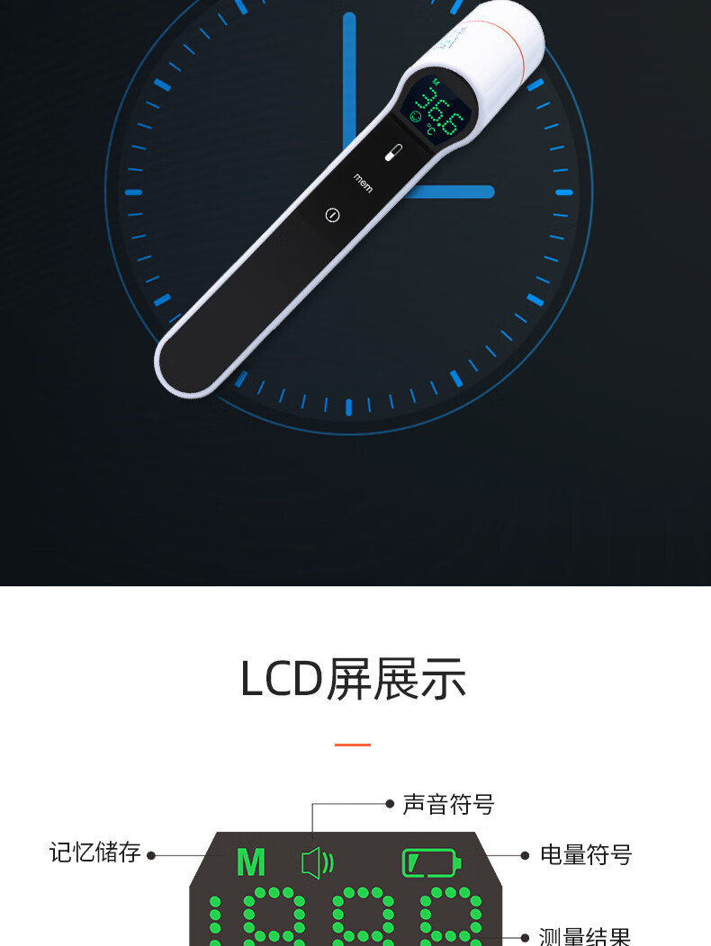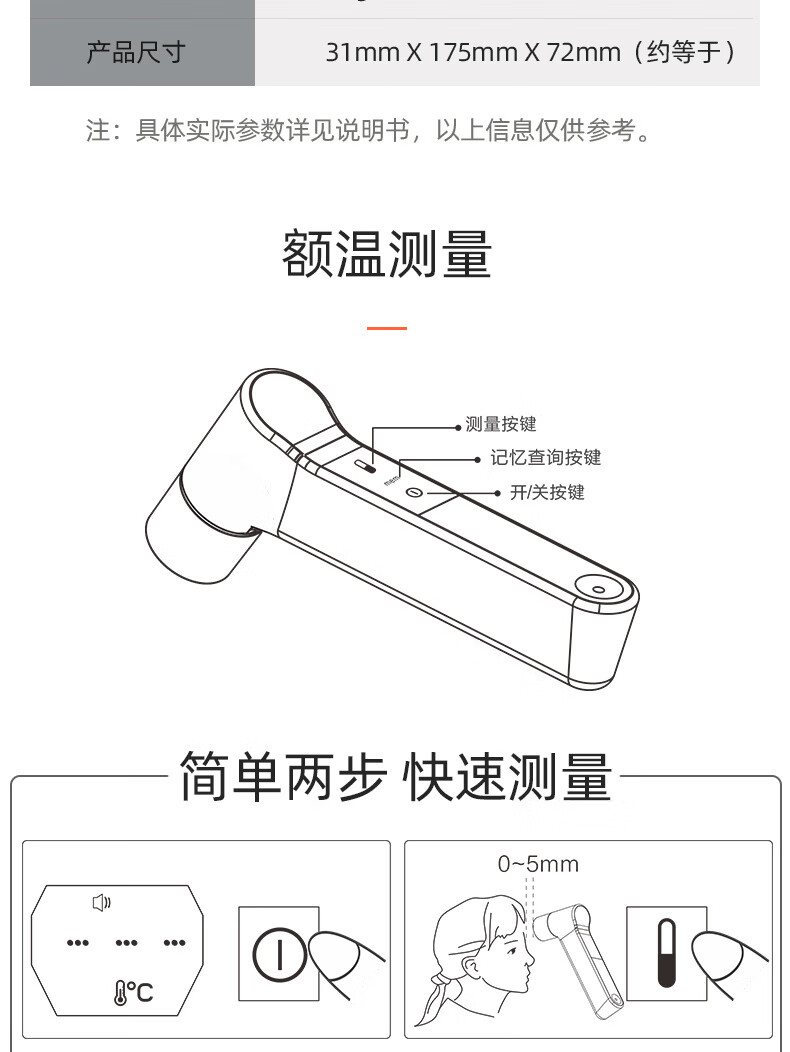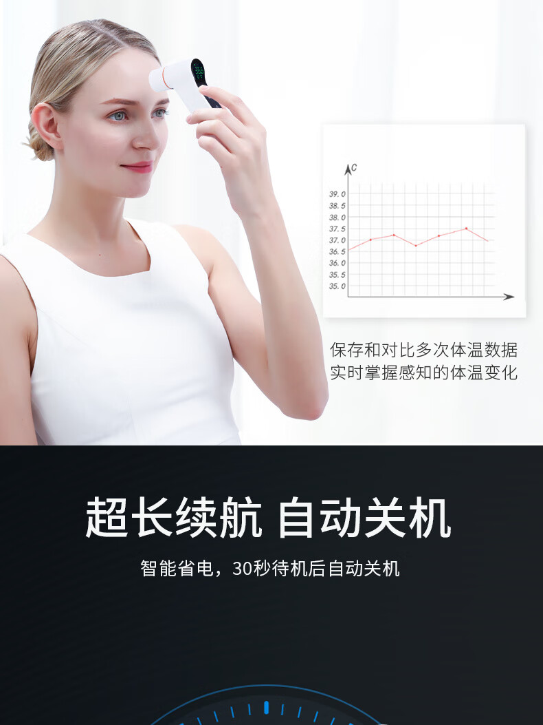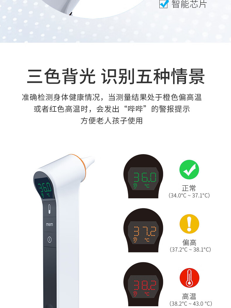 耳温、额温两用,区分测量更准确;1秒快速测量:非接触式红外测量,1秒测温,精准测量;两个温度单位F/C自由切换
