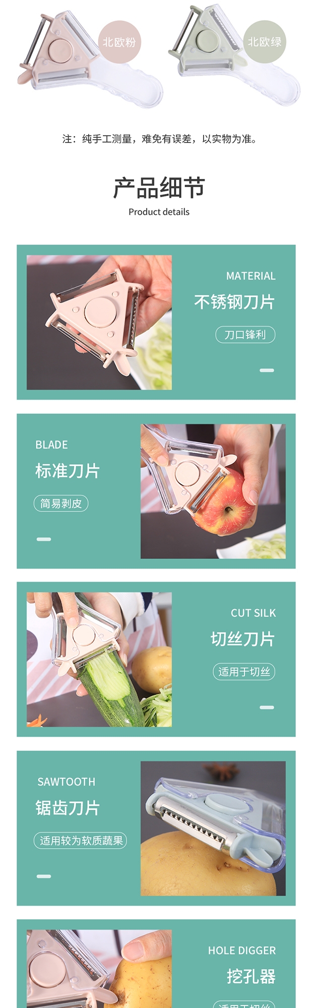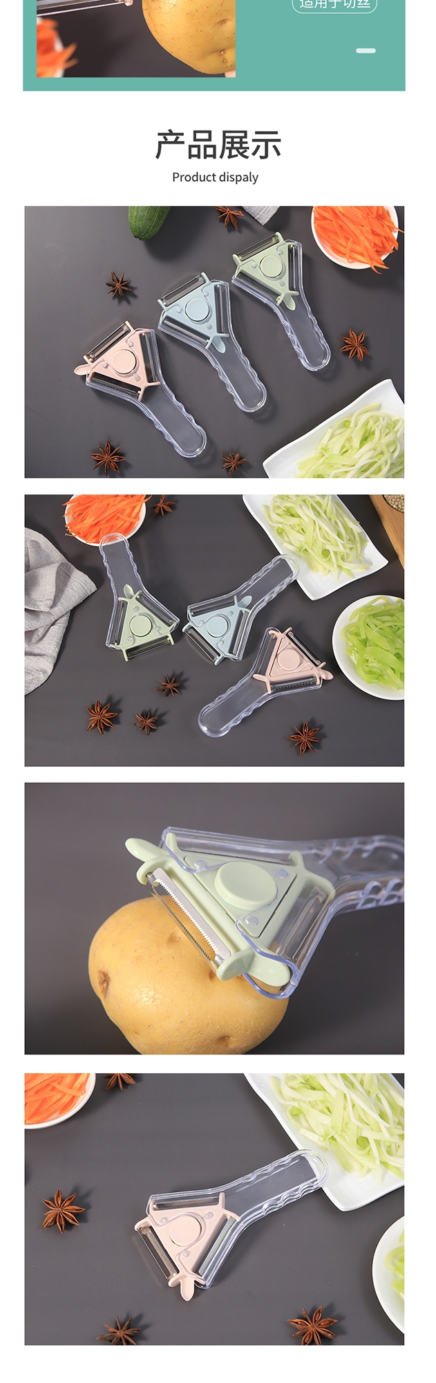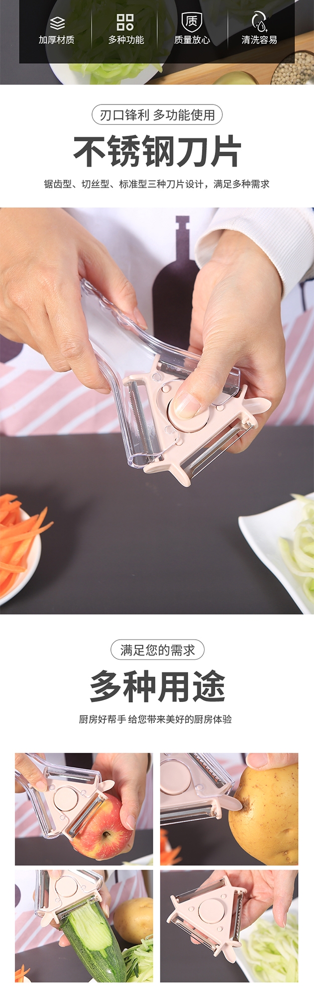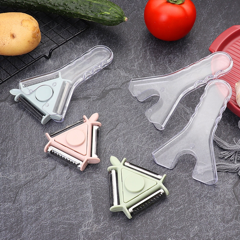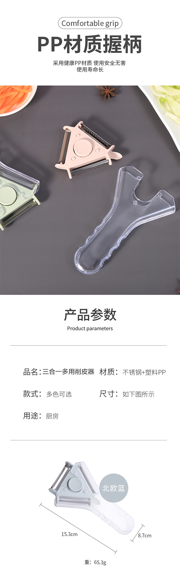 三款削皮器(适配不同果蔬曲面);透明防滑手柄 + 锋利刀片,握感稳、削皮快;小巧轻便好收纳,厨房随手拿不占地