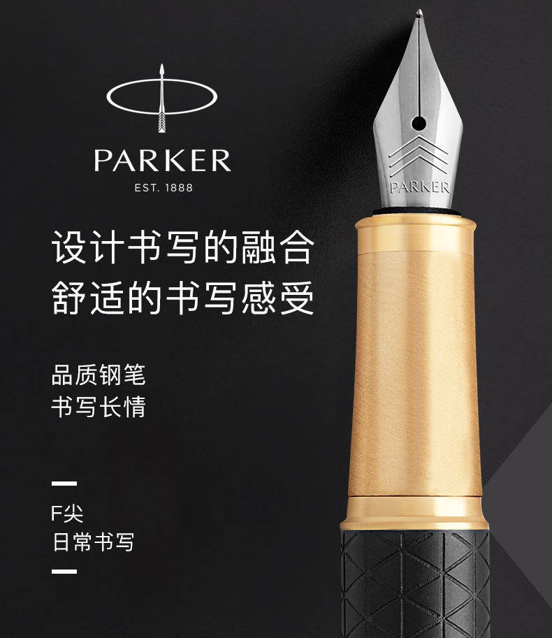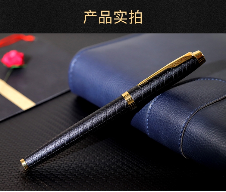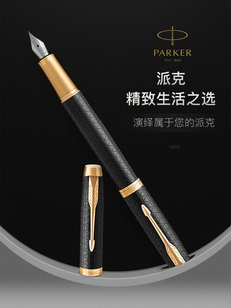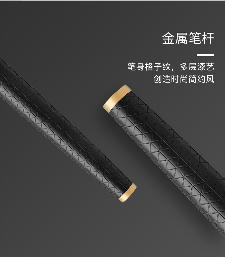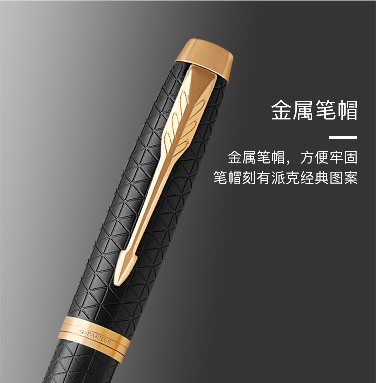 笔帽雕刻派克LOGO,三环金色笔环;铜质笔杆镀黑色漆,激光雕刻图案;金色笔冠,金色手握,绅士风格