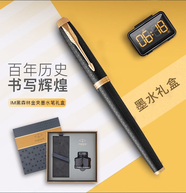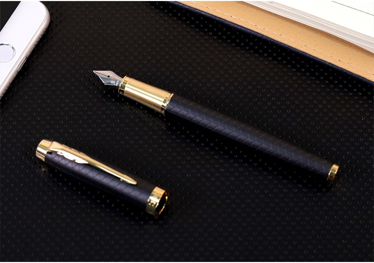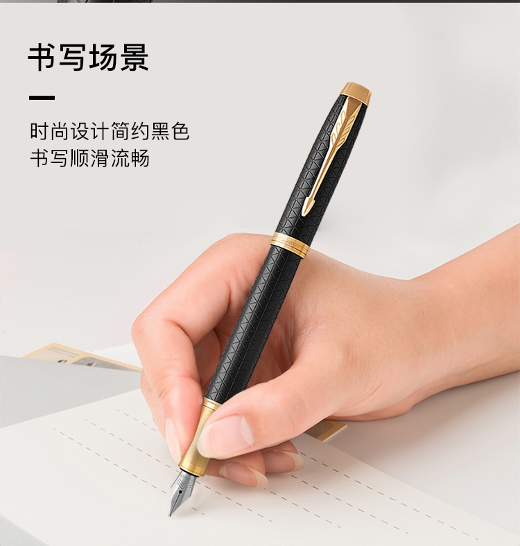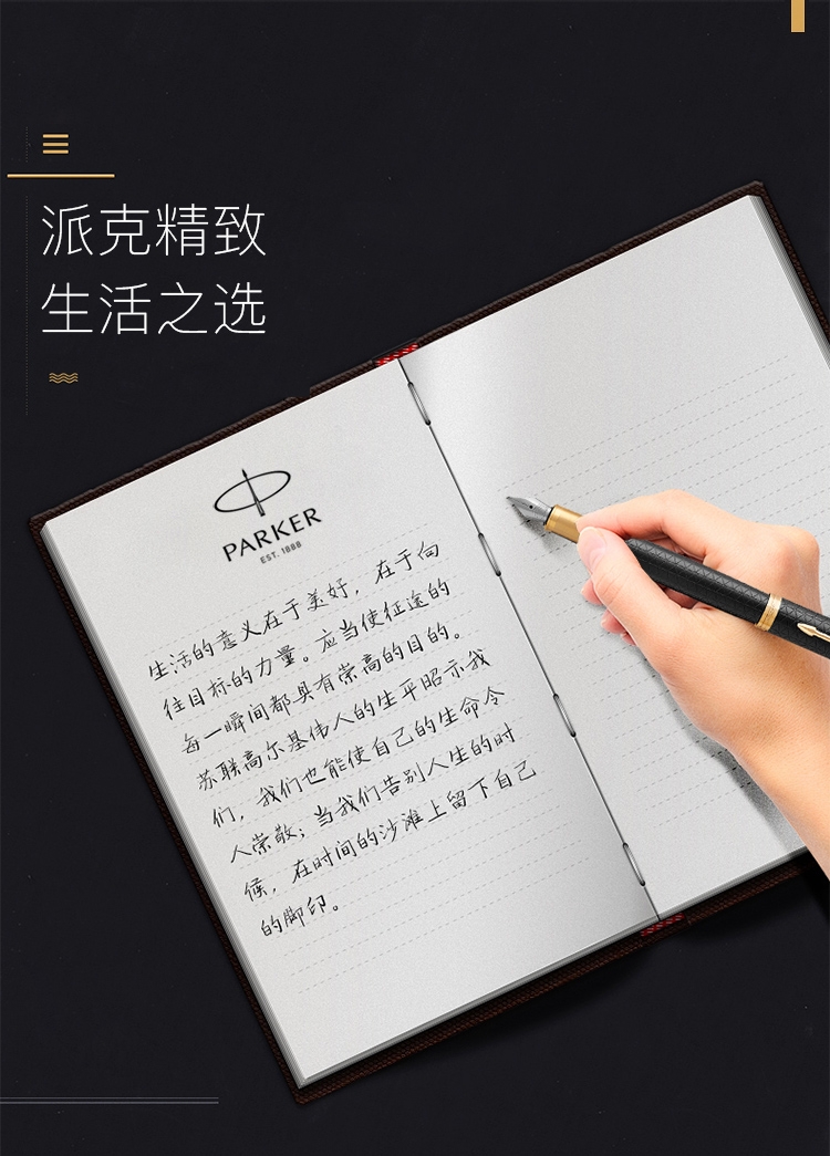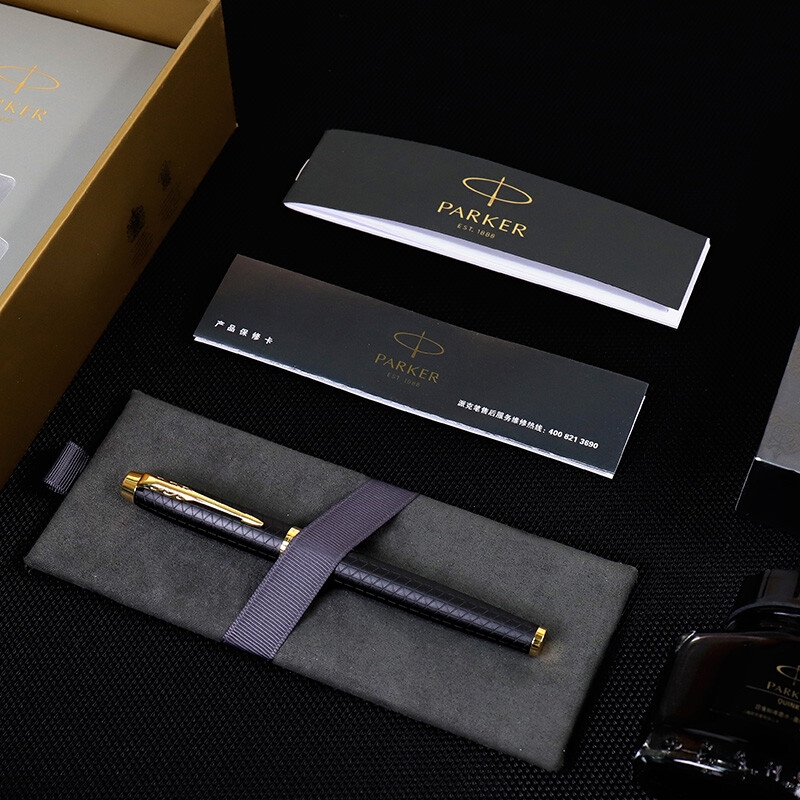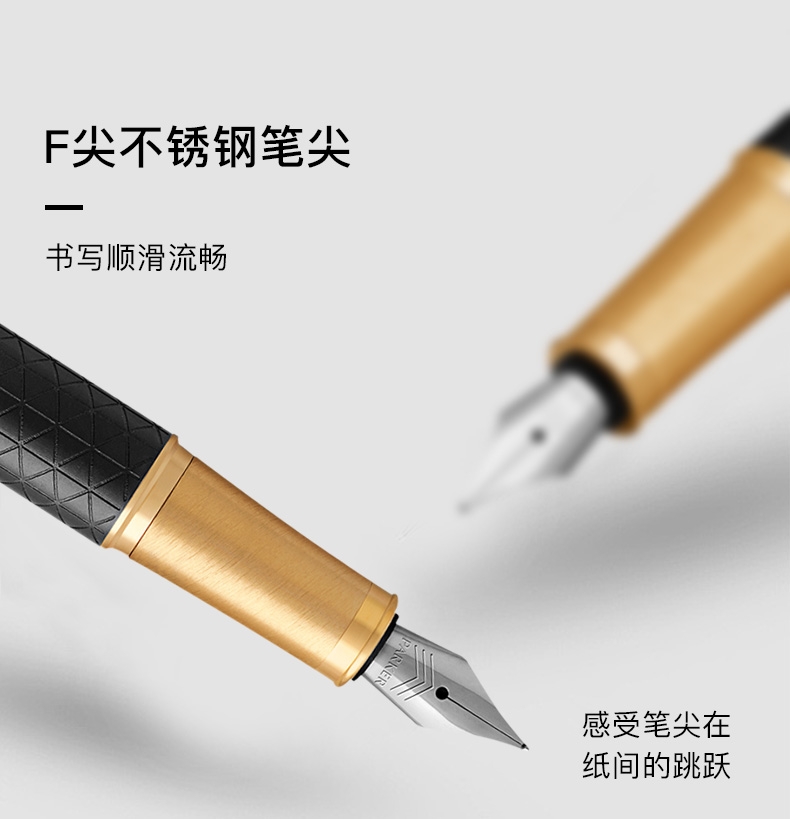 笔帽雕刻派克LOGO,三环金色笔环;铜质笔杆镀黑色漆,激光雕刻图案;金色笔冠,金色手握,绅士风格
