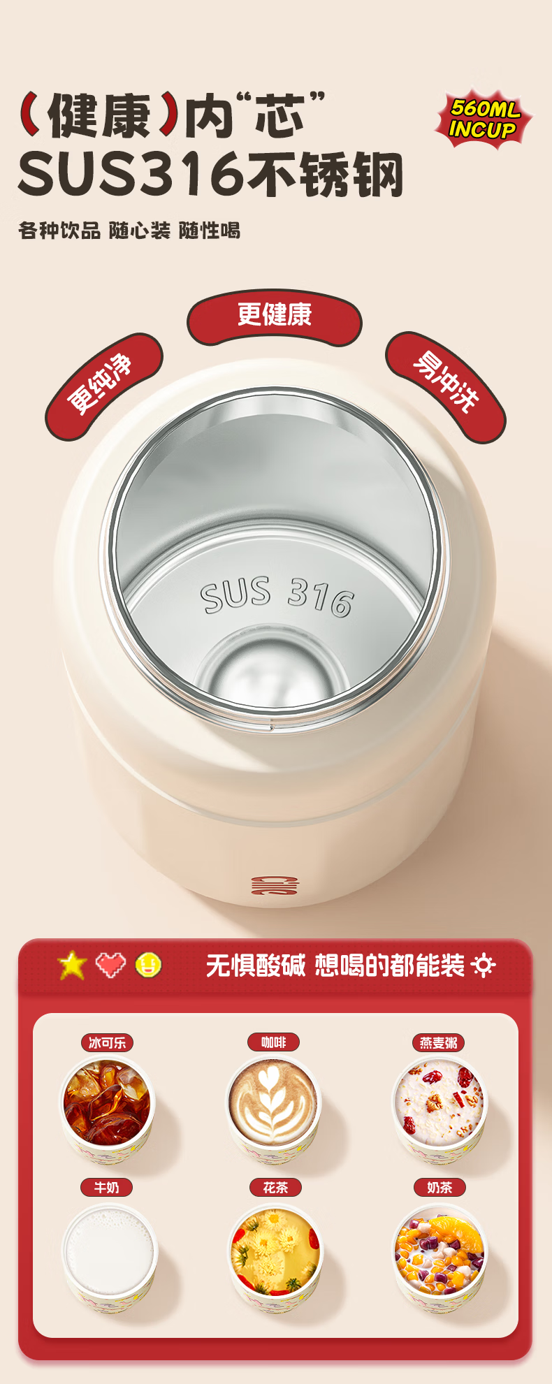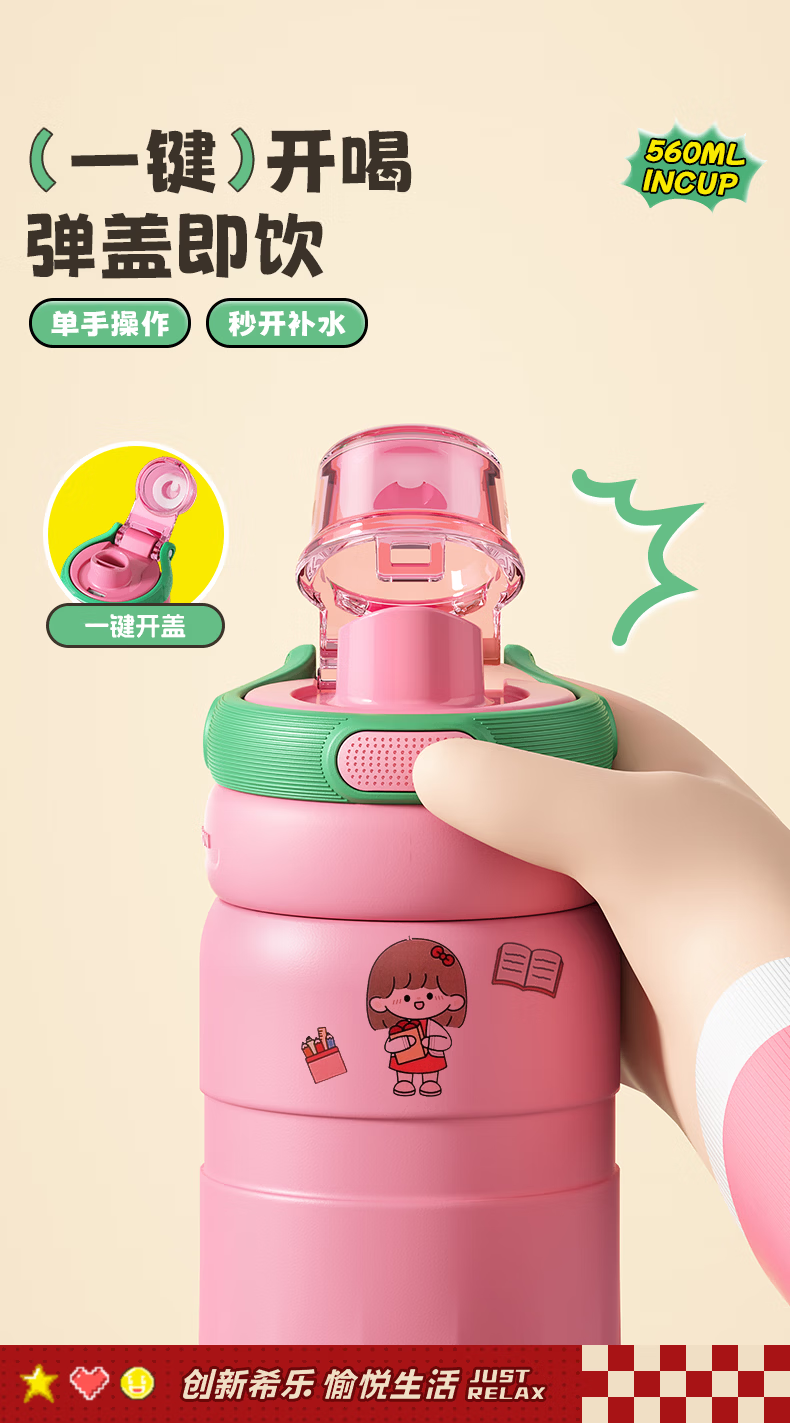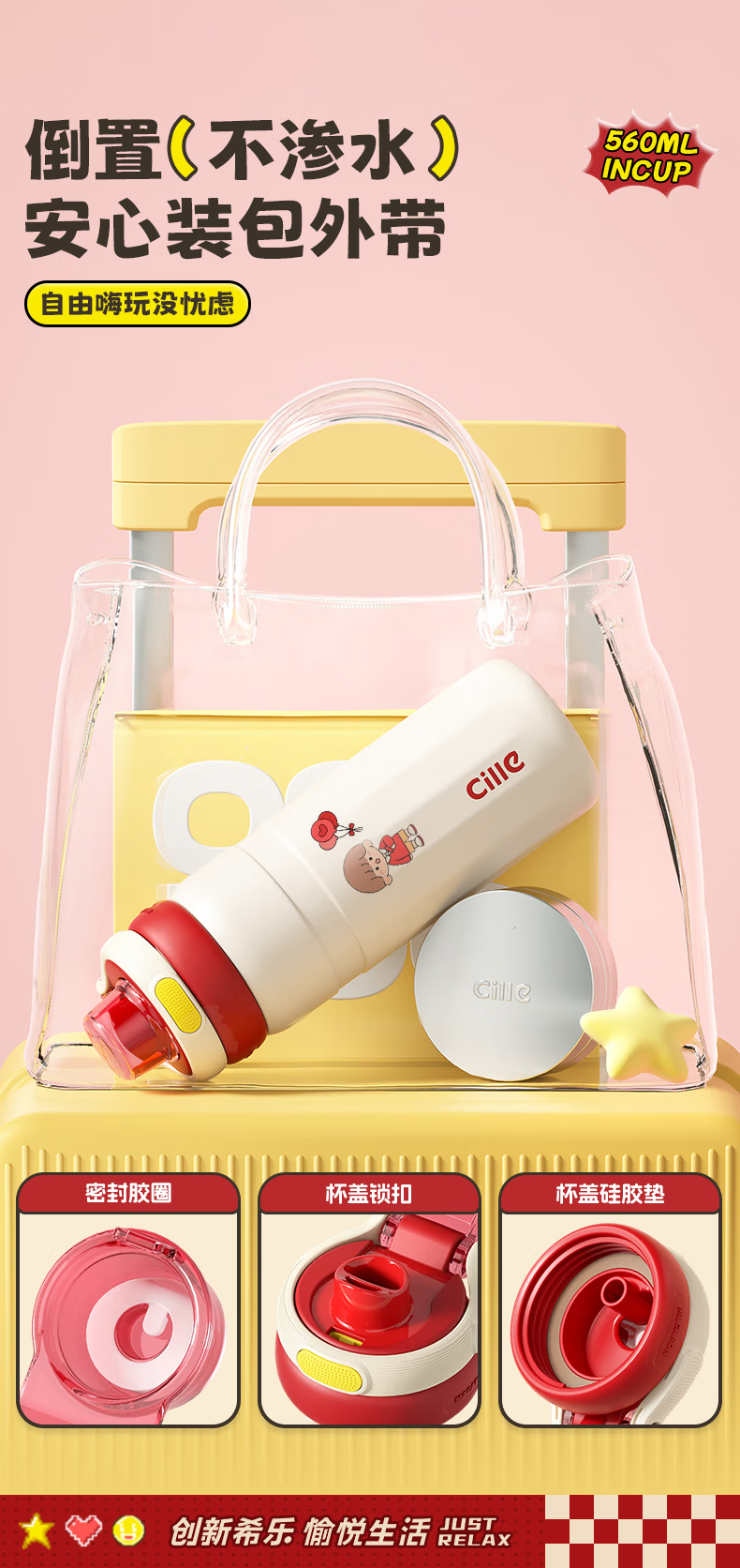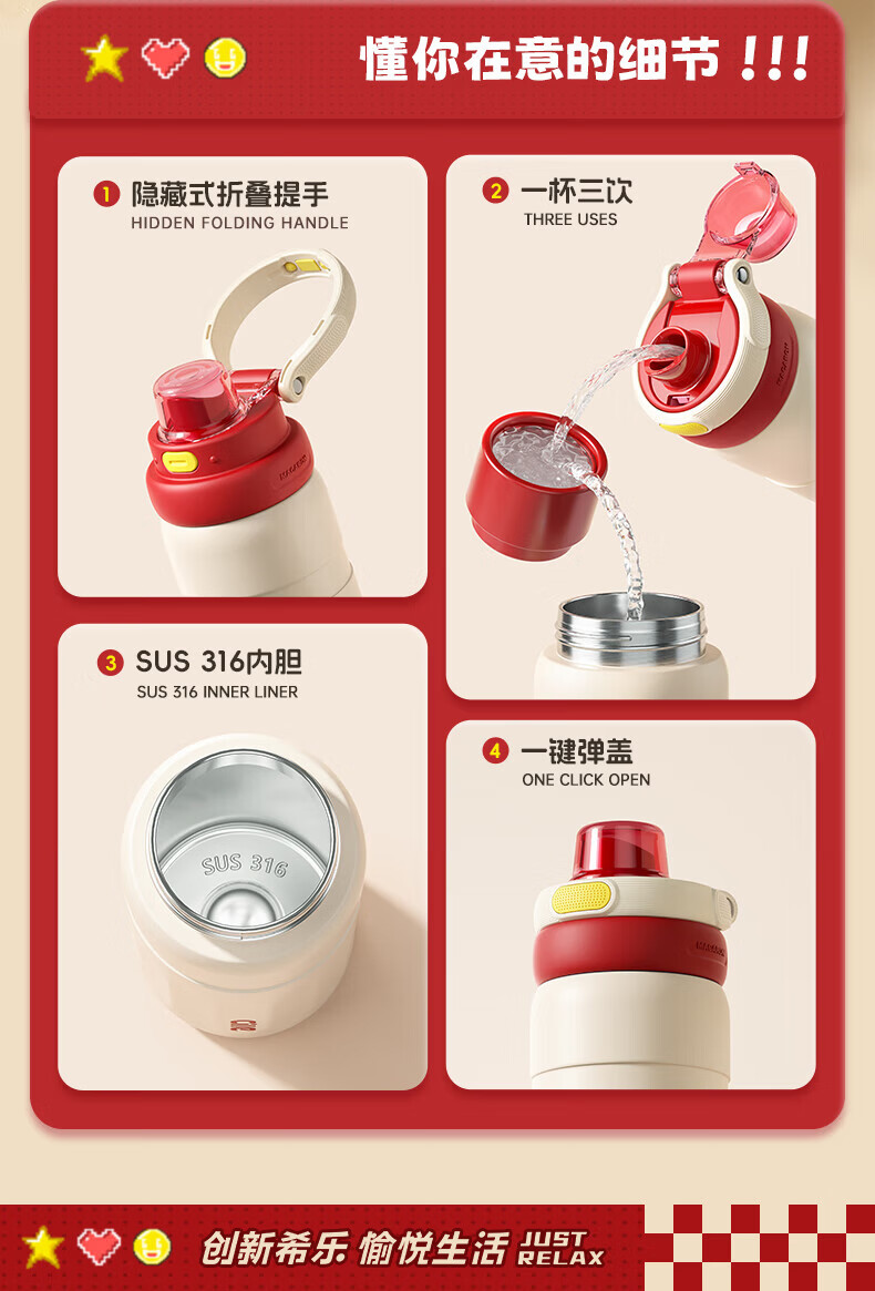 隐藏式折叠提手;一杯三饮;一键弹盖
