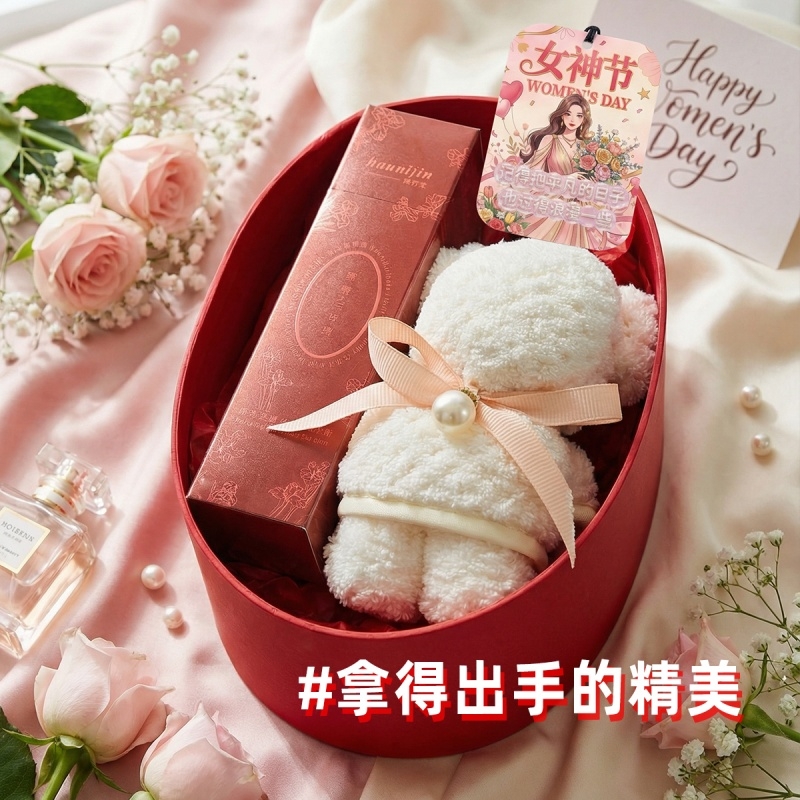 组合:小毛巾熊30*30cm、韩方莉香氛护手霜50克、女神节香片香挂