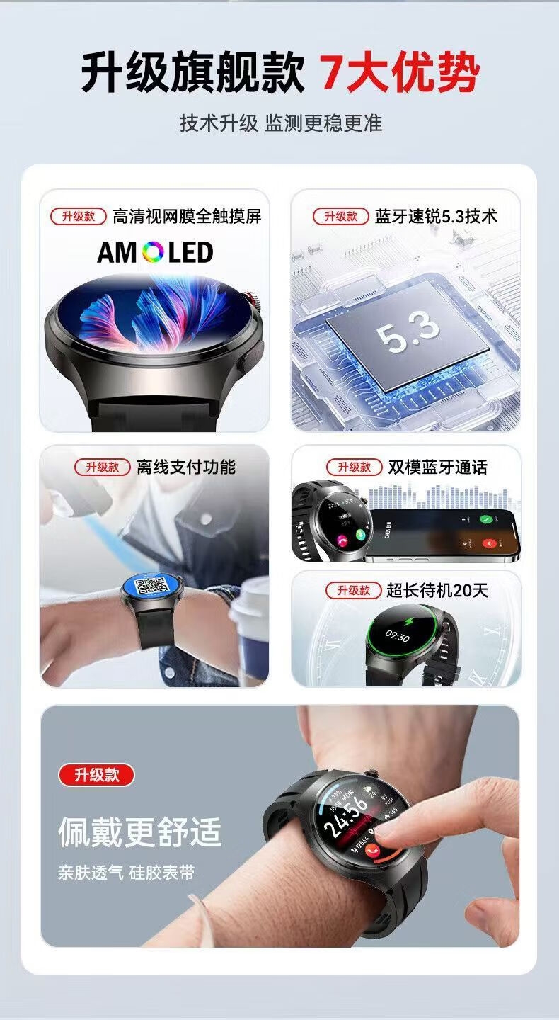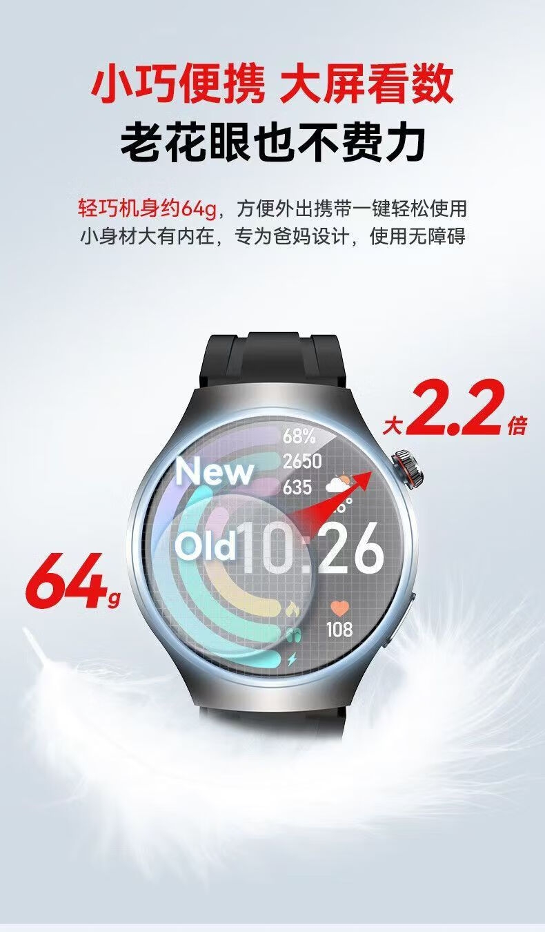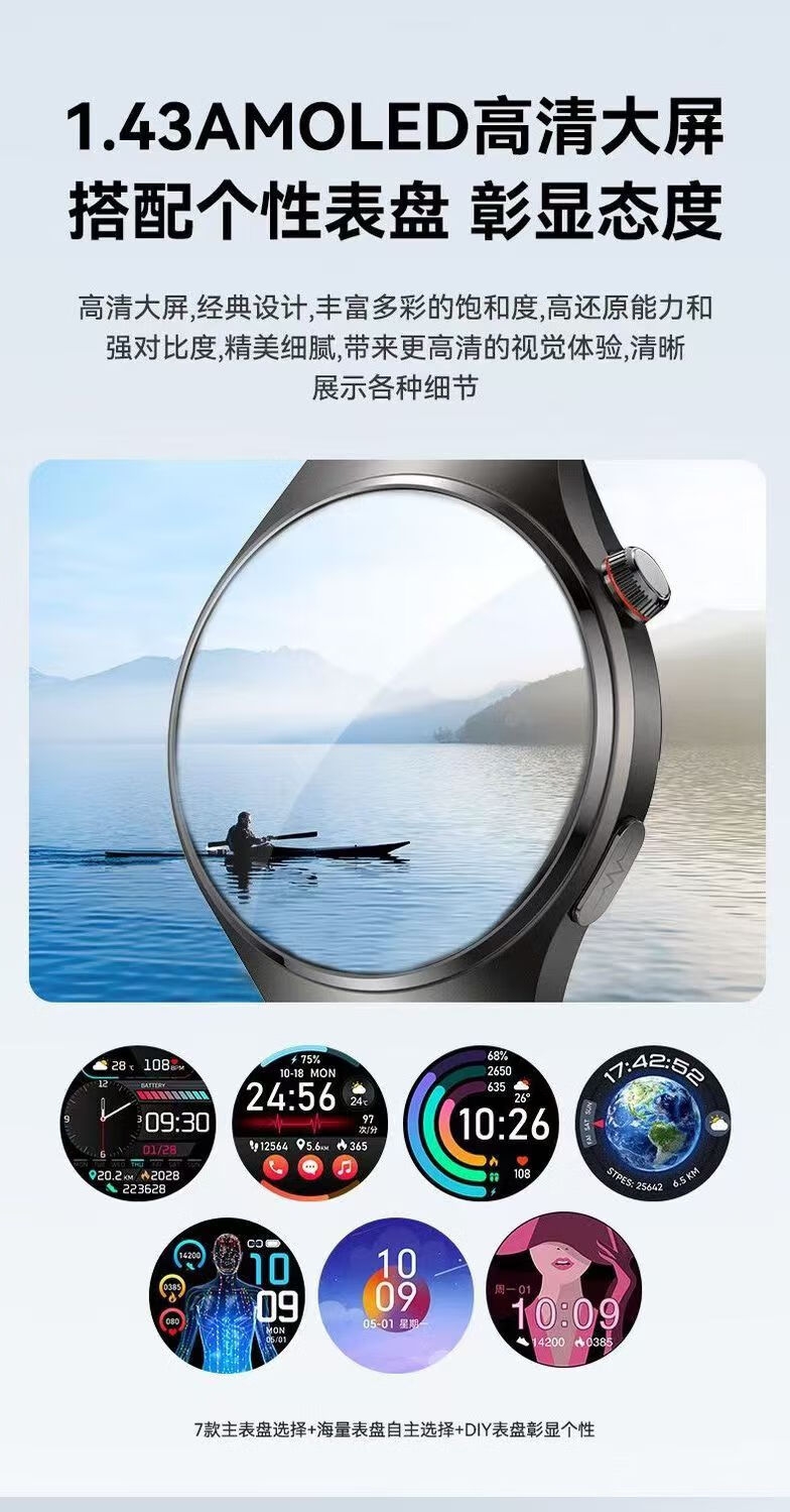 蓝牙连接 无线存储 历史数据一目了然;1.43AMOLED高清大屏搭配个性表盘 彰显态度;小巧便携 大屏看数 老花眼也不费力