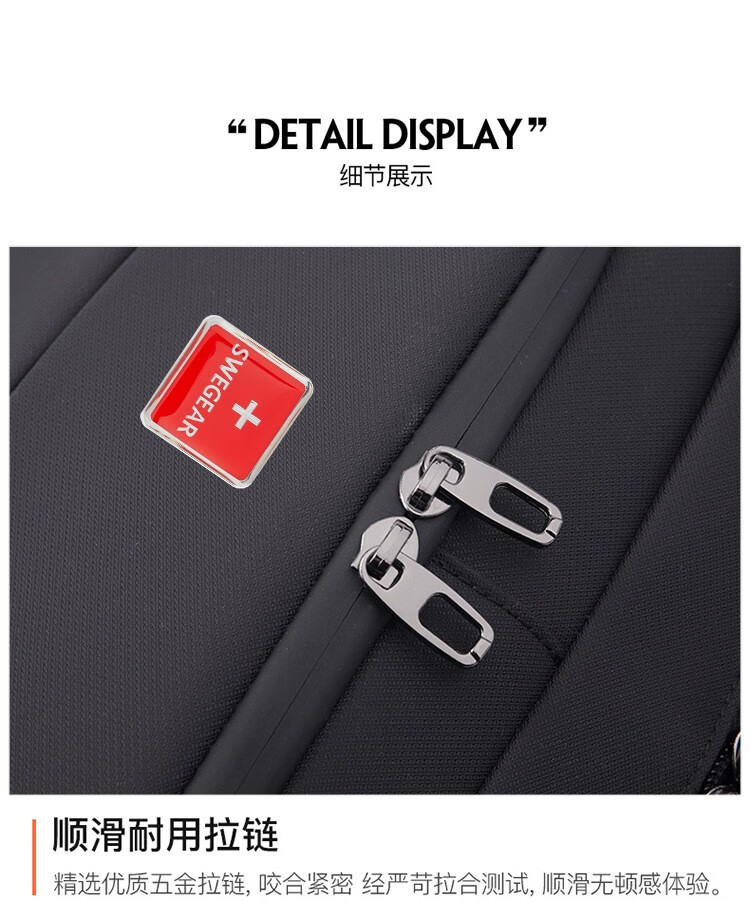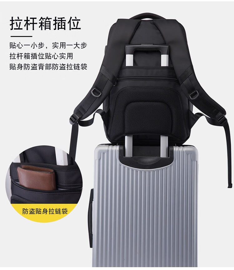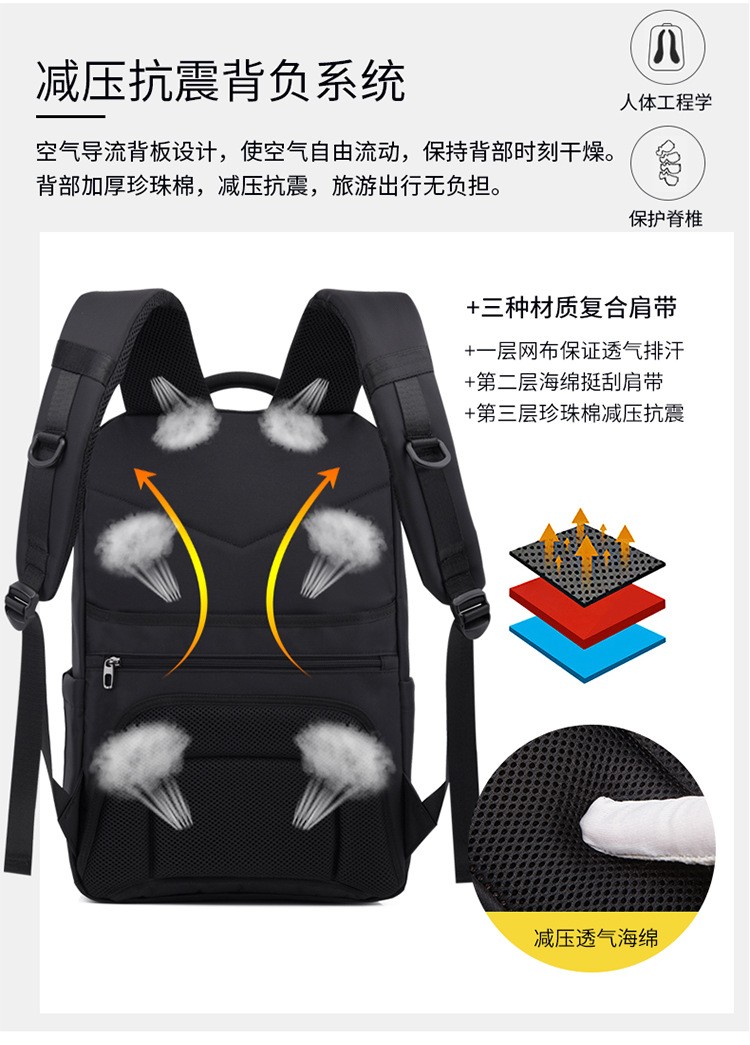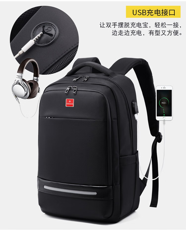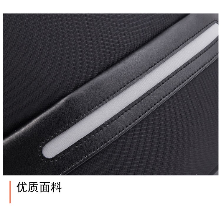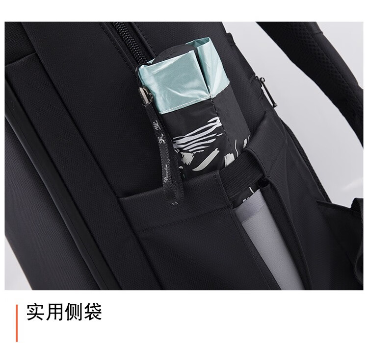 精选牛津布防水面料、人体工程学抗震背负系统;正面安全反光条、隐藏收纳侧袋; 耳机线/USB充电口/拉杆箱插袋设计