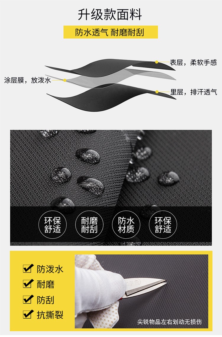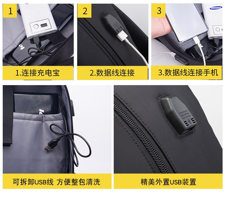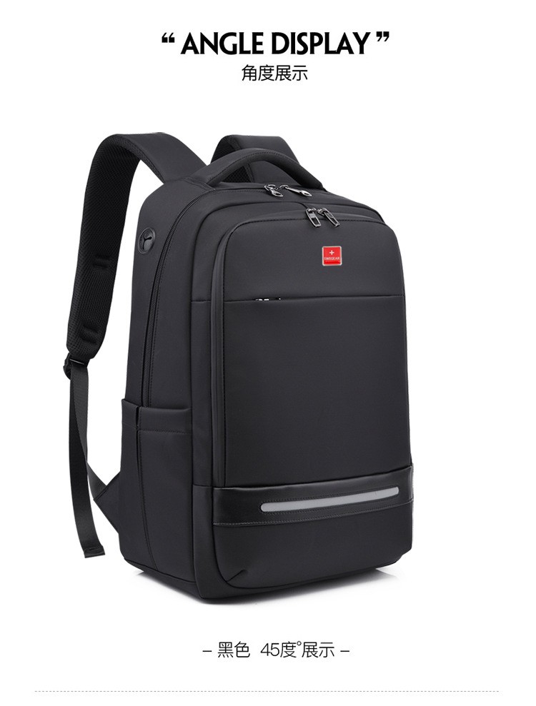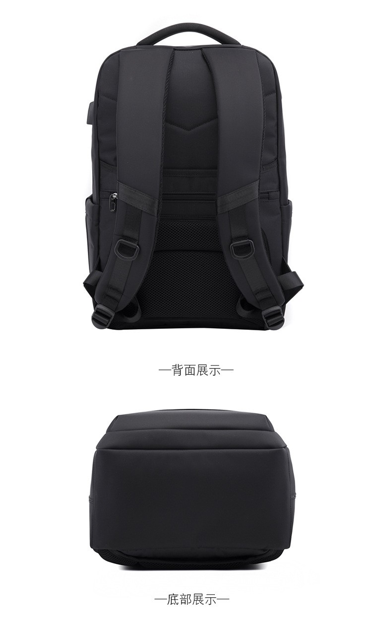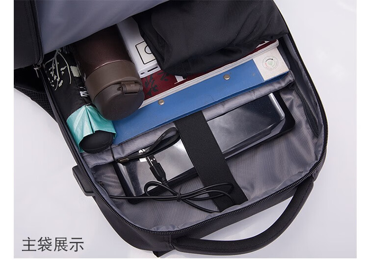 精选牛津布防水面料、人体工程学抗震背负系统;正面安全反光条、隐藏收纳侧袋; 耳机线/USB充电口/拉杆箱插袋设计