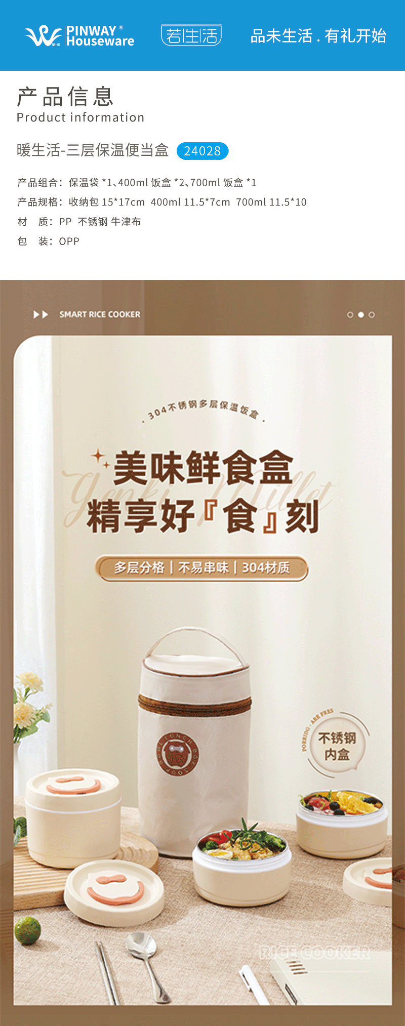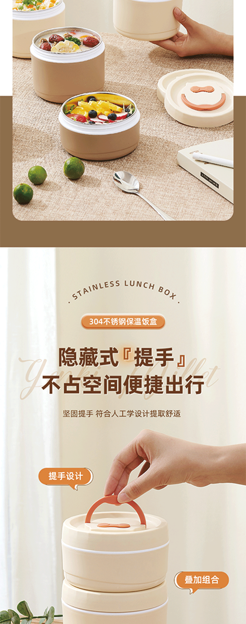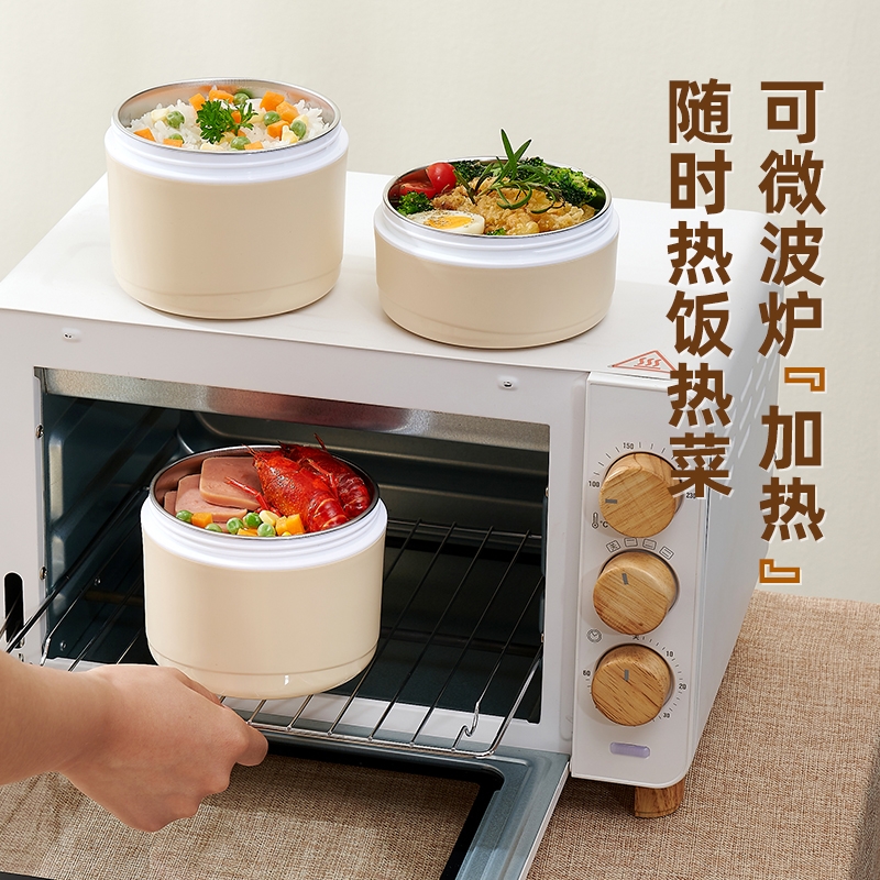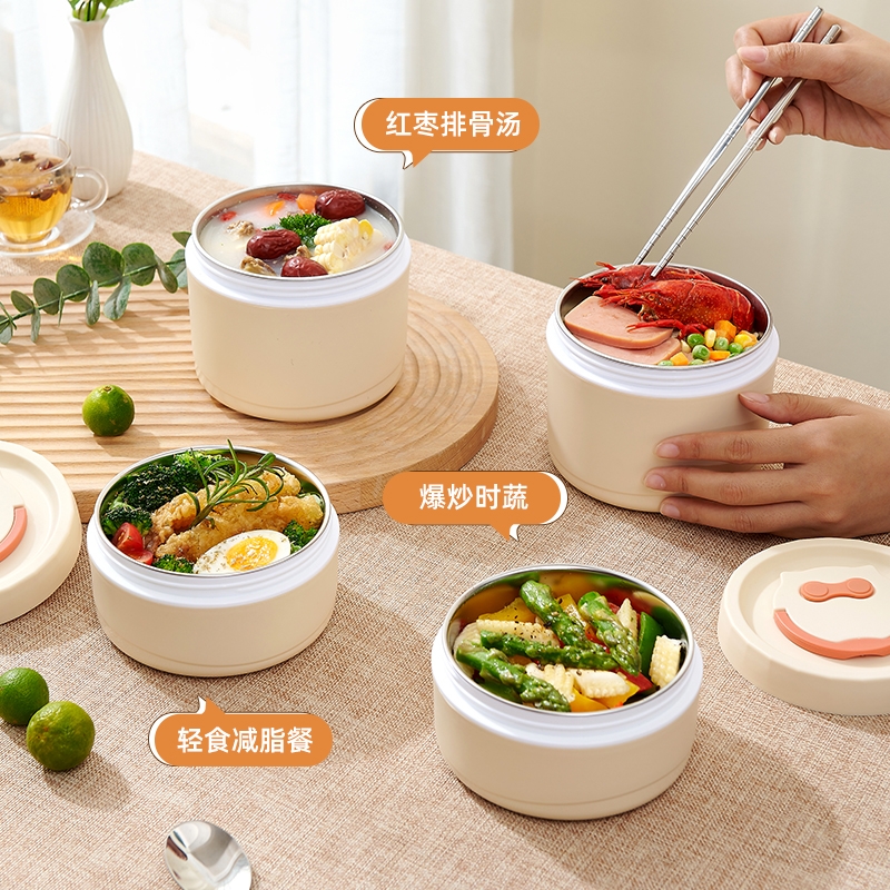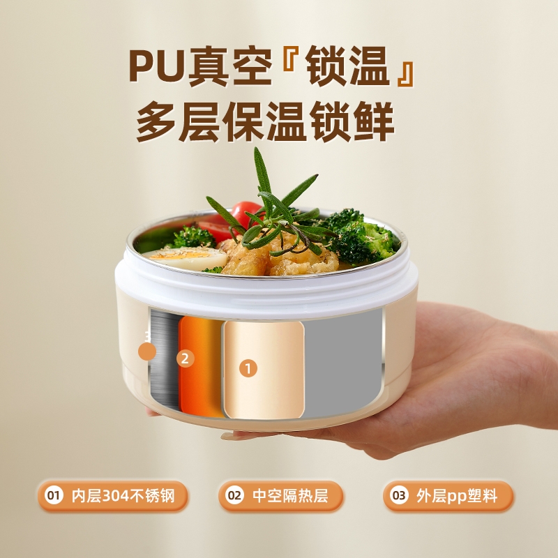 内胆不锈钢 + 外层保温,餐食安心又暖乎;三层分盒不串味,容量刚好适配一人餐;自带手提设计,拎着不勒手,装包里也不占地