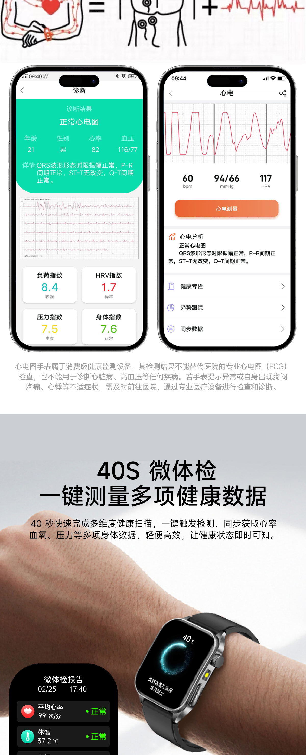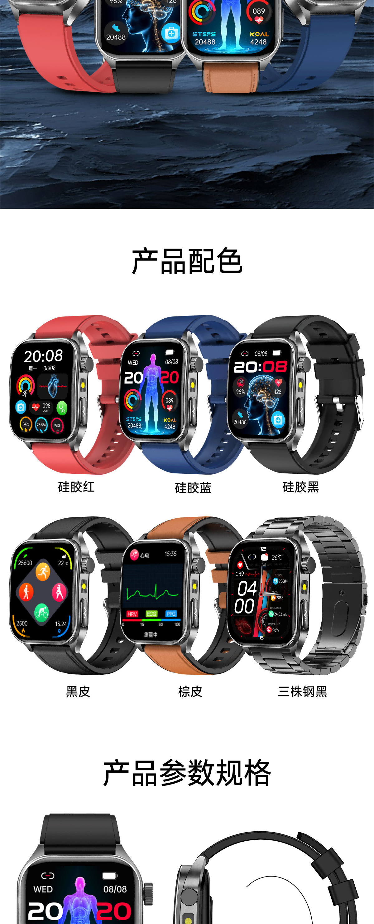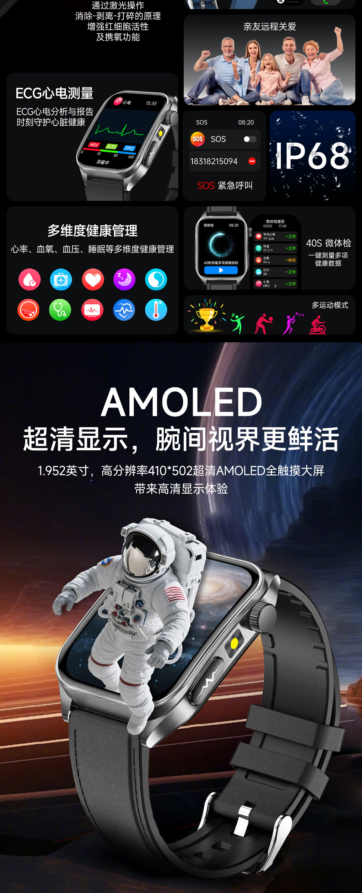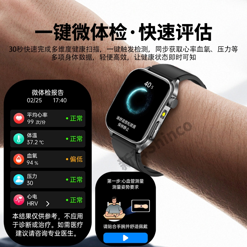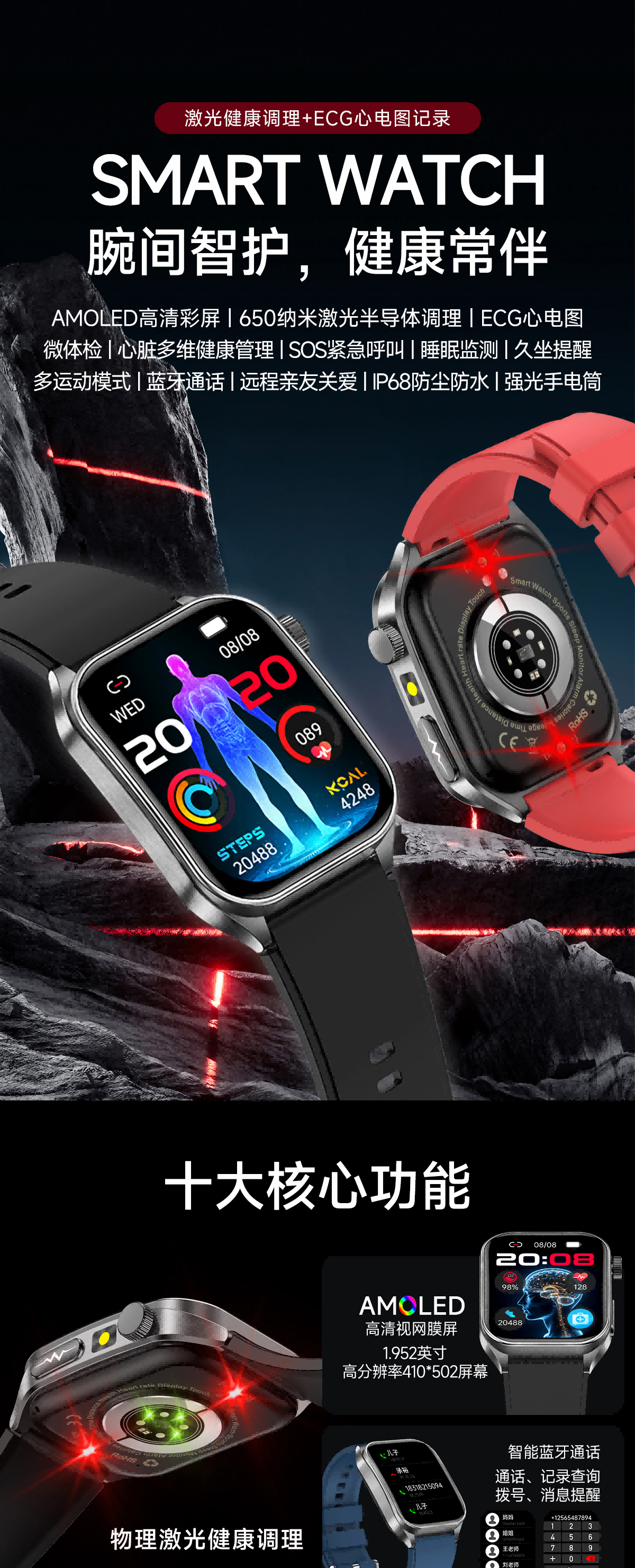 高清视网膜屏1.952英寸高分辨率410*502;ECG心电测量 心电分析与报告时刻守护心脏健康;多维度健康管理 心率、血氧、HRV、睡眠等多维度