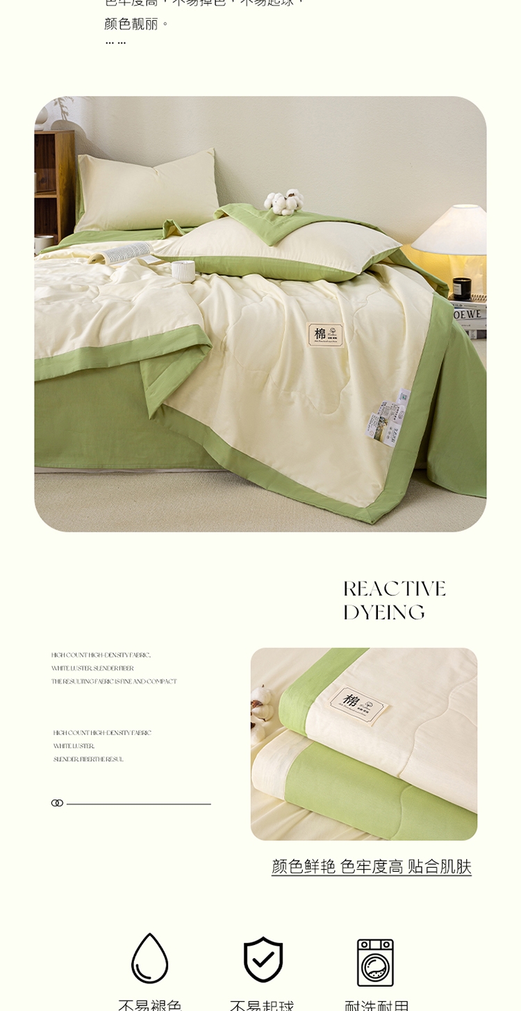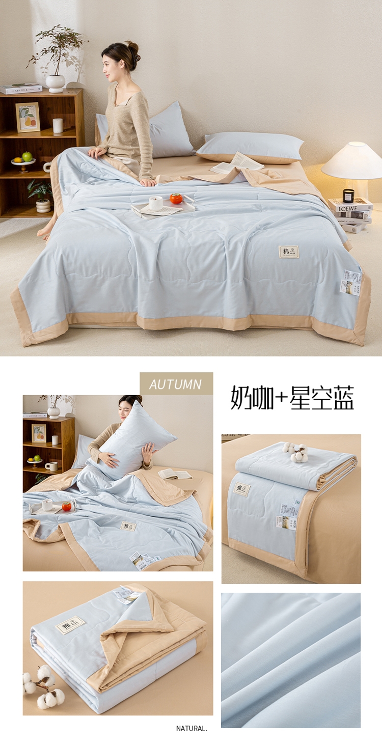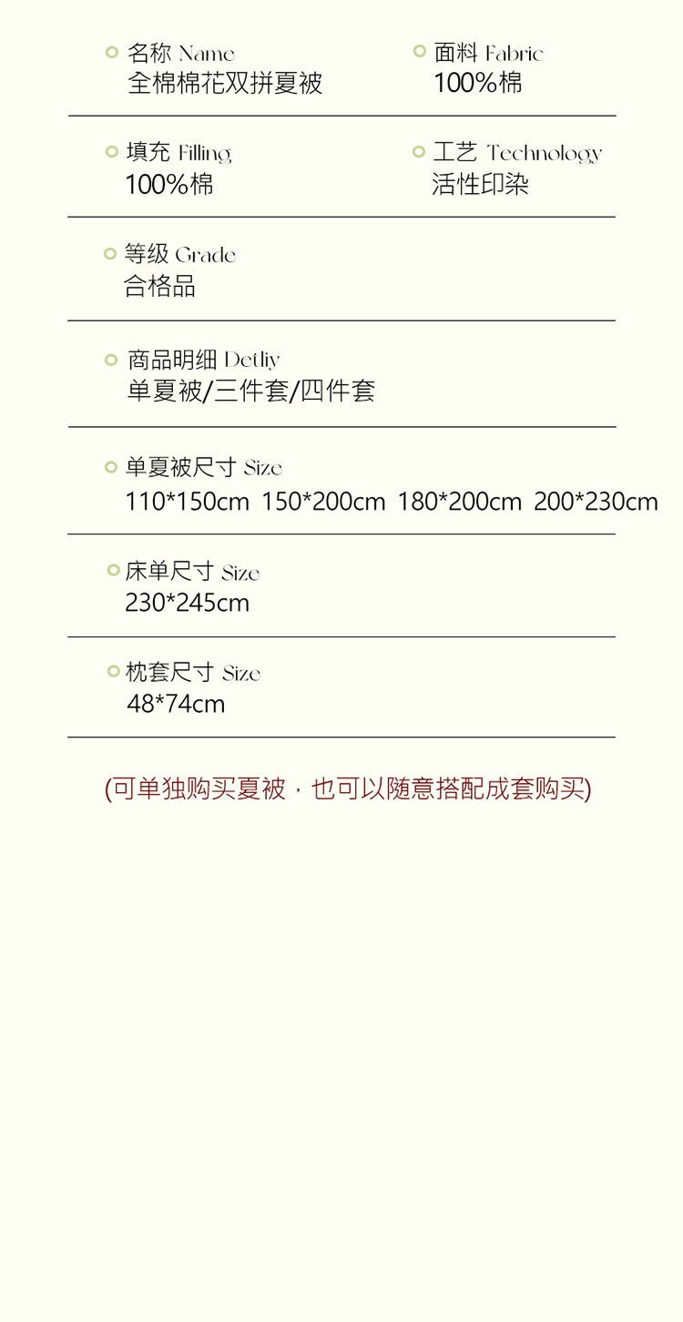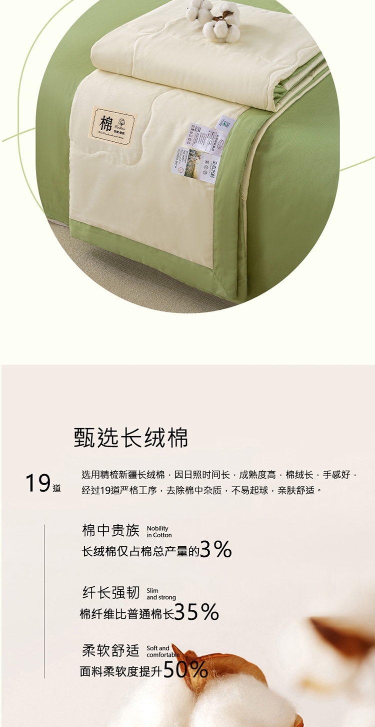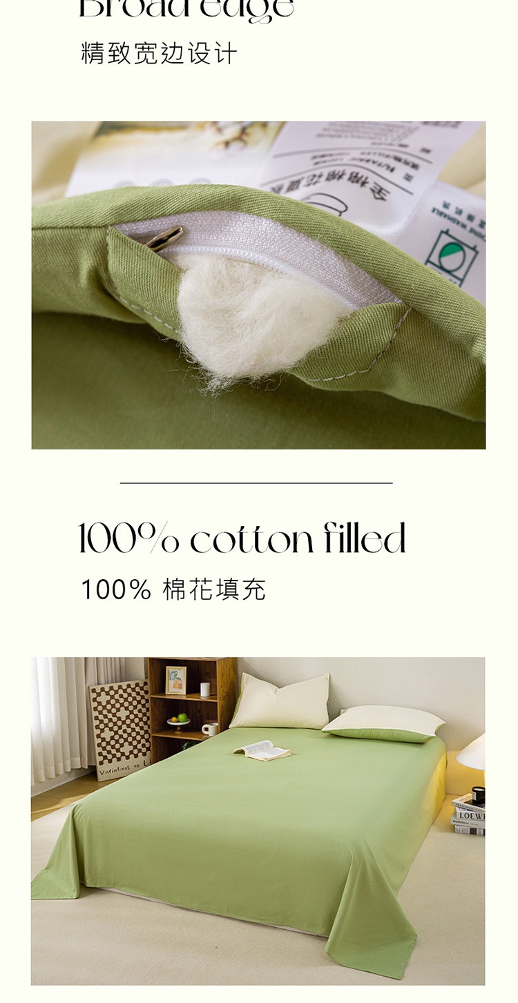 全棉面料,亲肤柔软,全棉高支高密工艺;100%新疆棉花填充,蓬松柔软,轻盈贴身,柔软舒适;撞色A/B面设计,为睡眠带来无尽的优雅与品位,