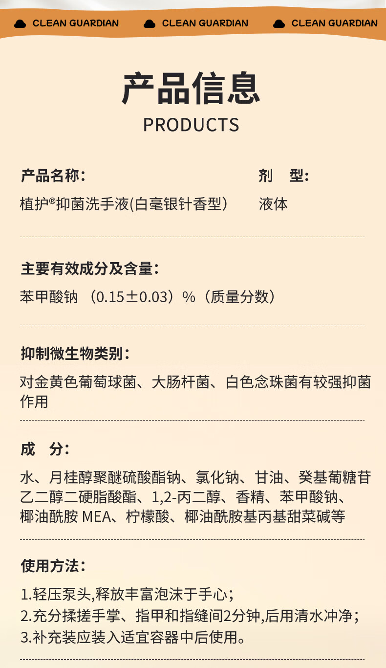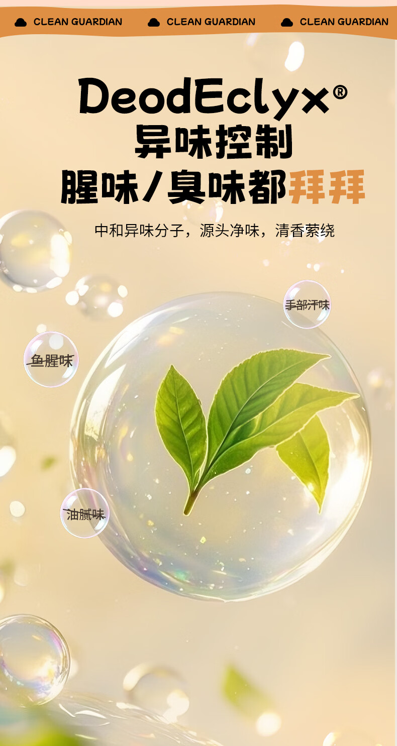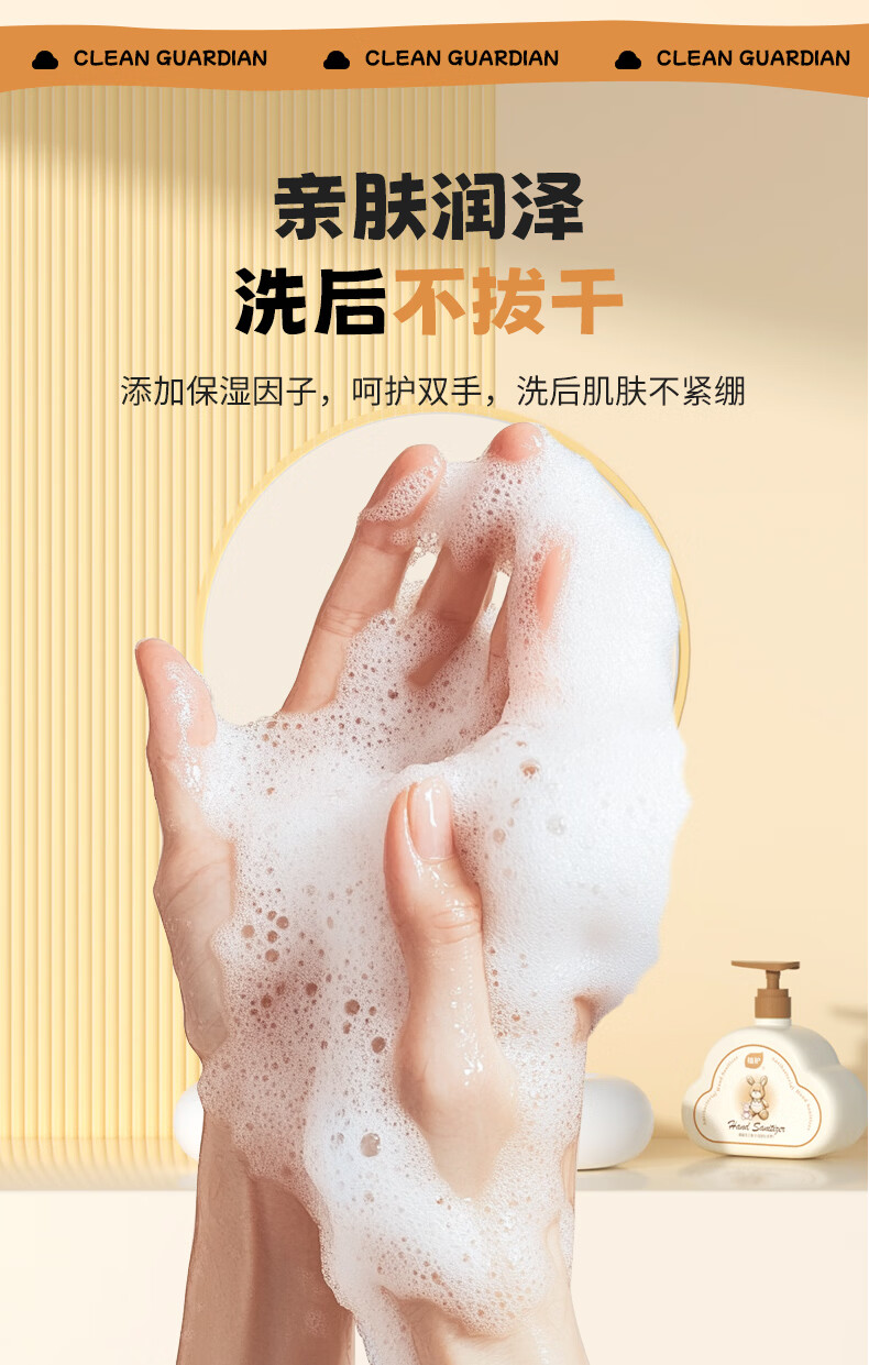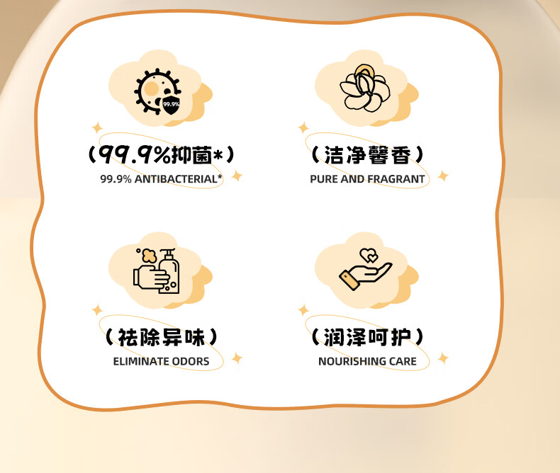 99.9%*抑菌,清洁手部肌肤,能有效抑制细菌滋生;中和异味分子,源头净味,清香萦绕;添加保湿因子,亲肤润泽,呵护双手,洗后肌肤不紧绷;温和弱酸性,不破环肌肤屏障