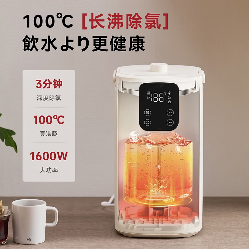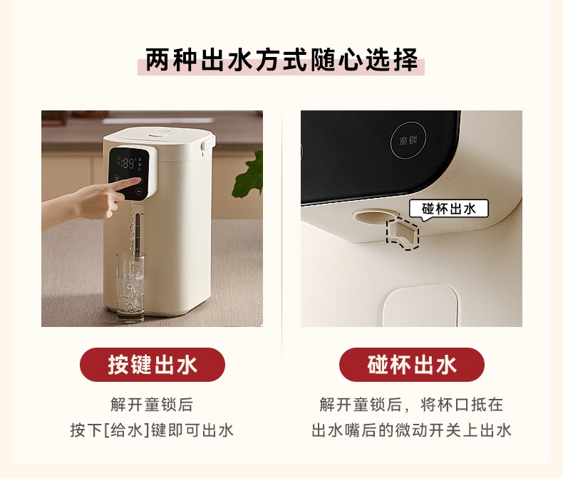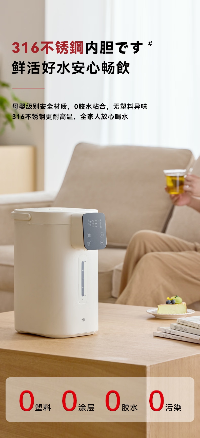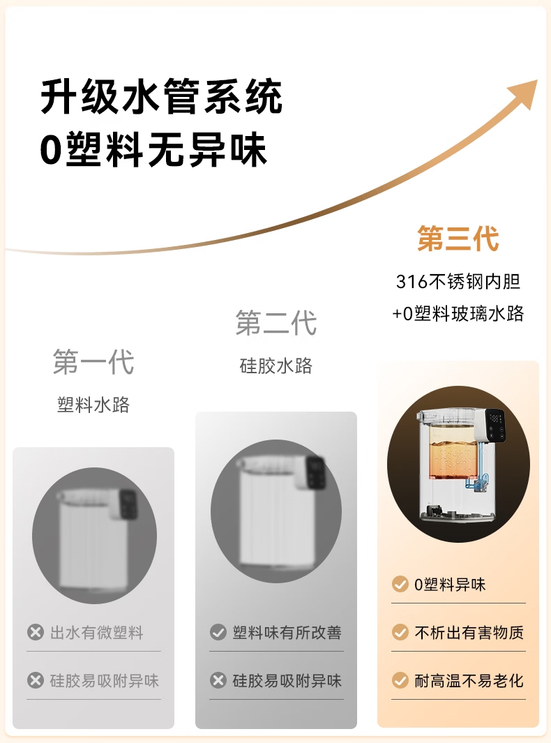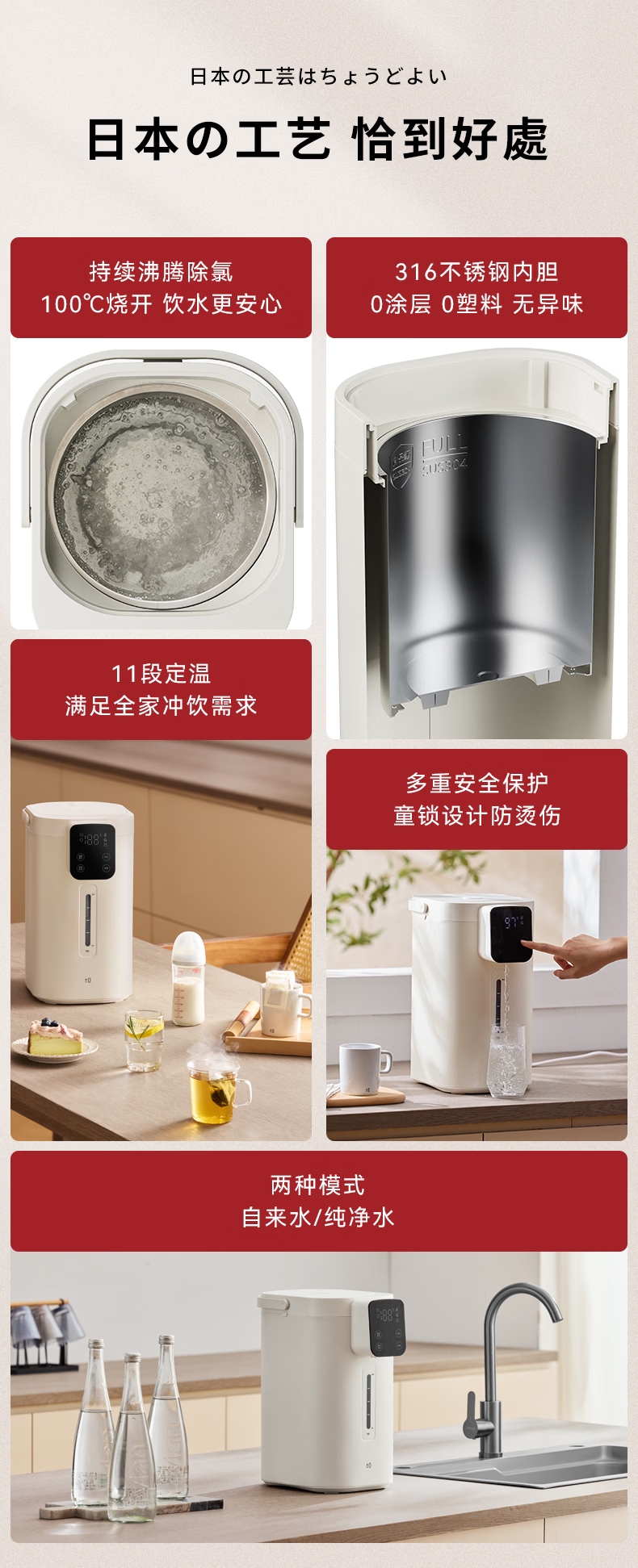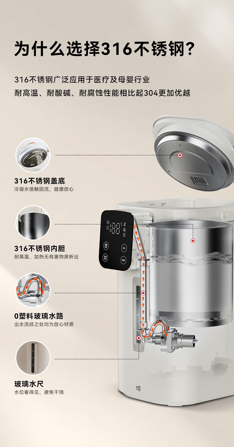 316 不锈钢内胆0,涂层 0 塑料 无异味;1600W 大功率真沸腾;两种模式,自来水 / 纯净水 11 段定温;多重安全保护,童锁设计防烫伤