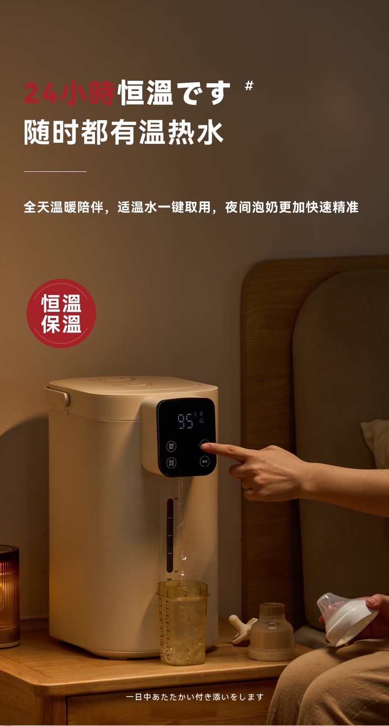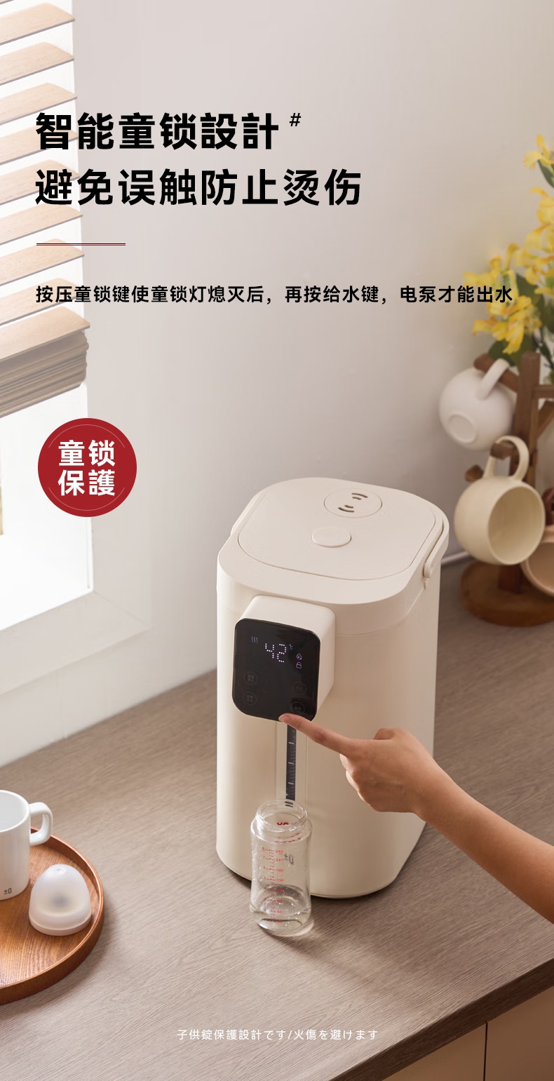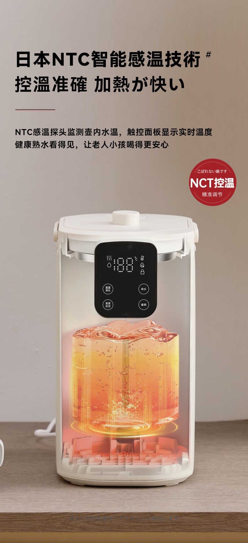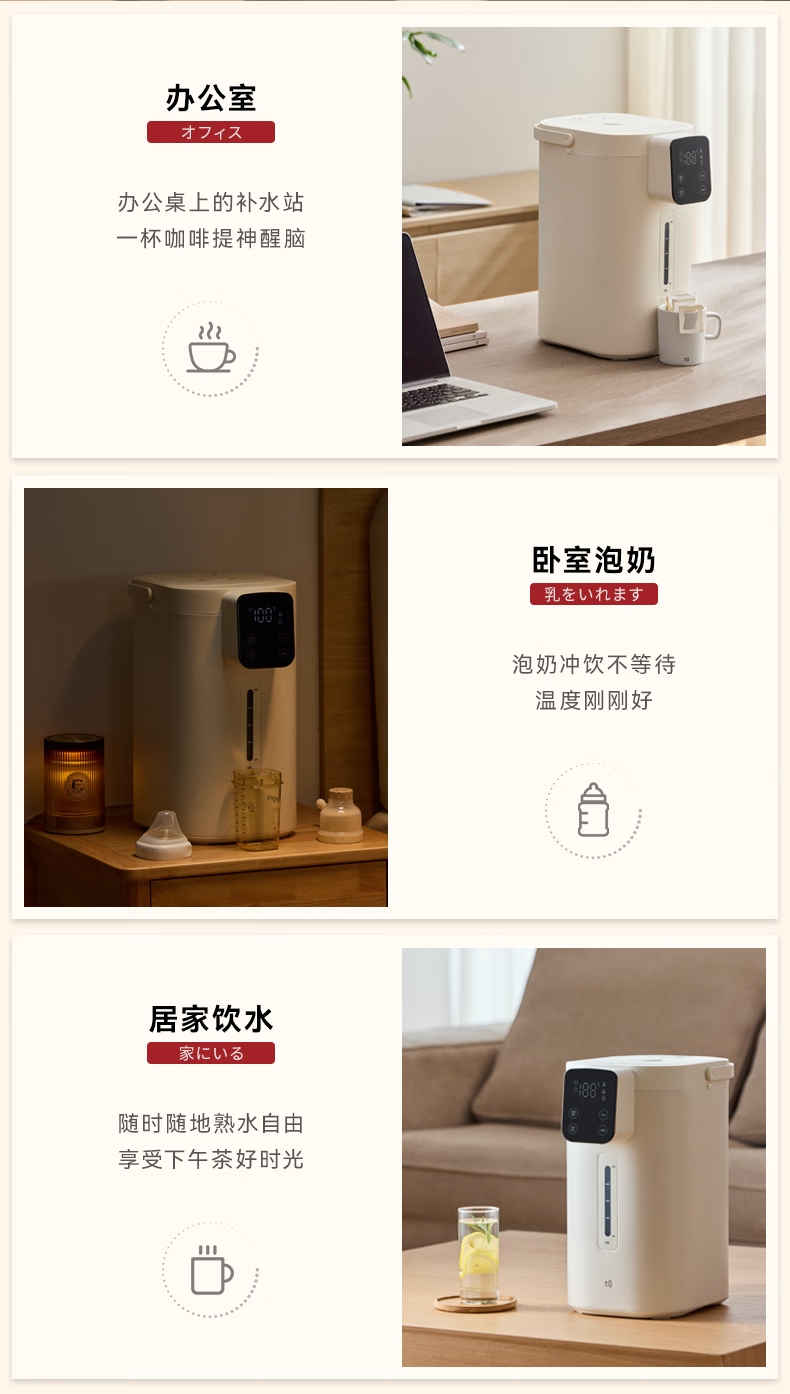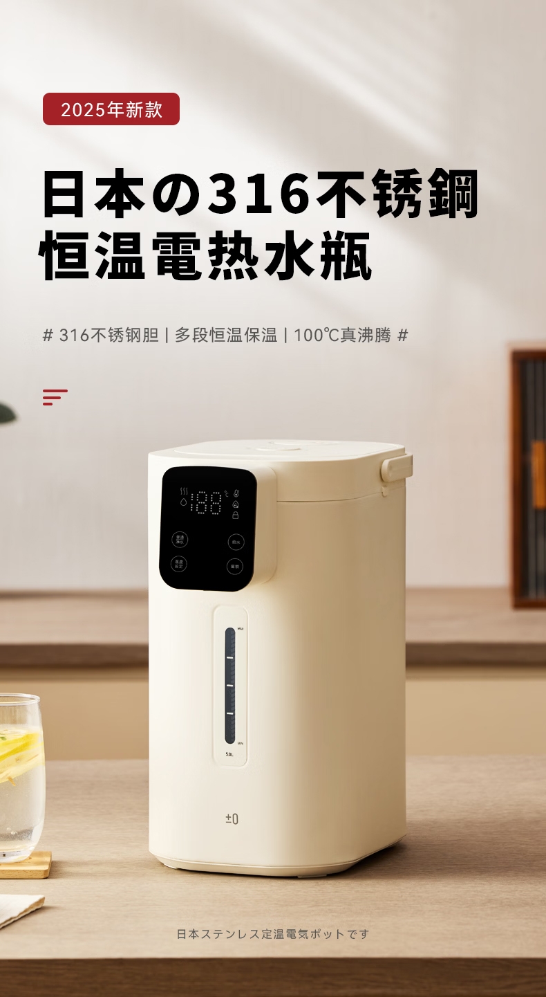 316 不锈钢内胆0,涂层 0 塑料 无异味;1600W 大功率真沸腾;两种模式,自来水 / 纯净水 11 段定温;多重安全保护,童锁设计防烫伤