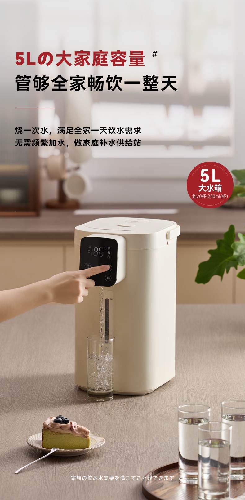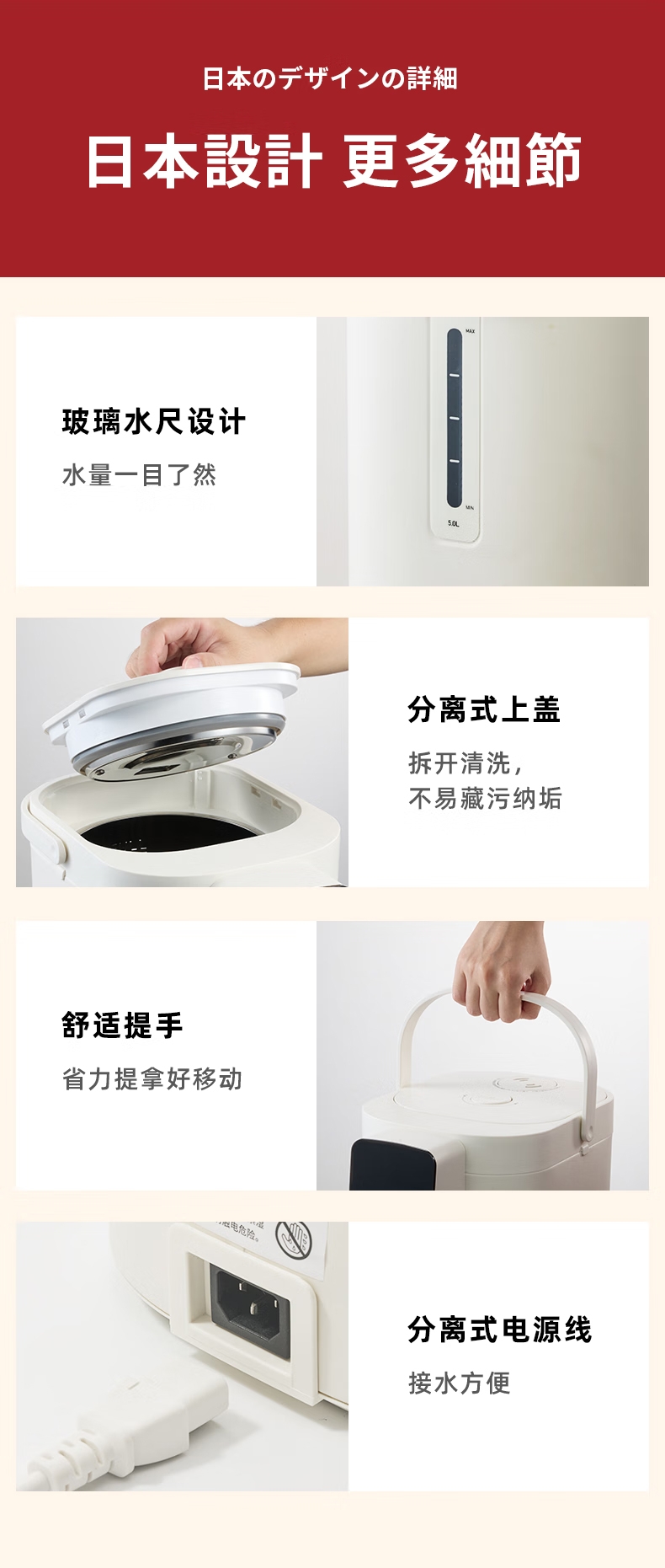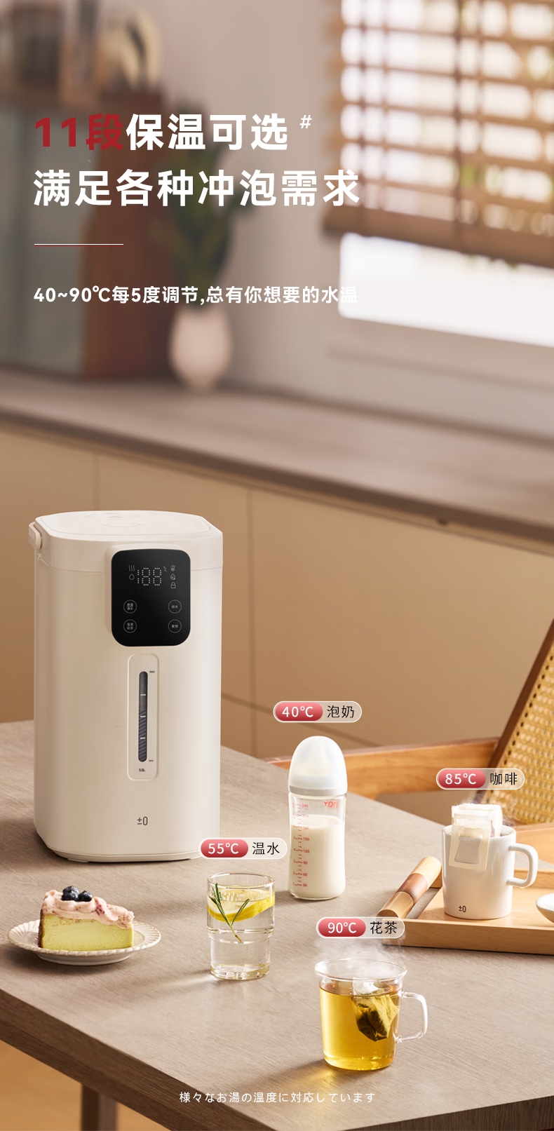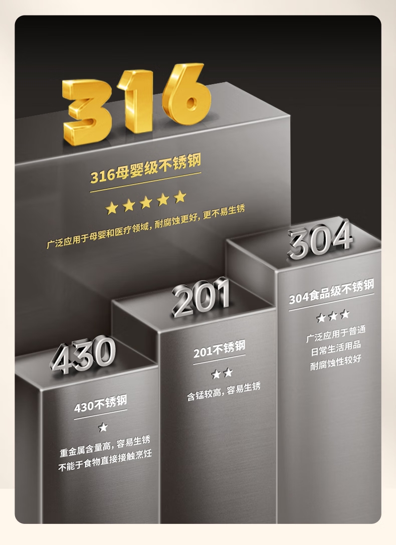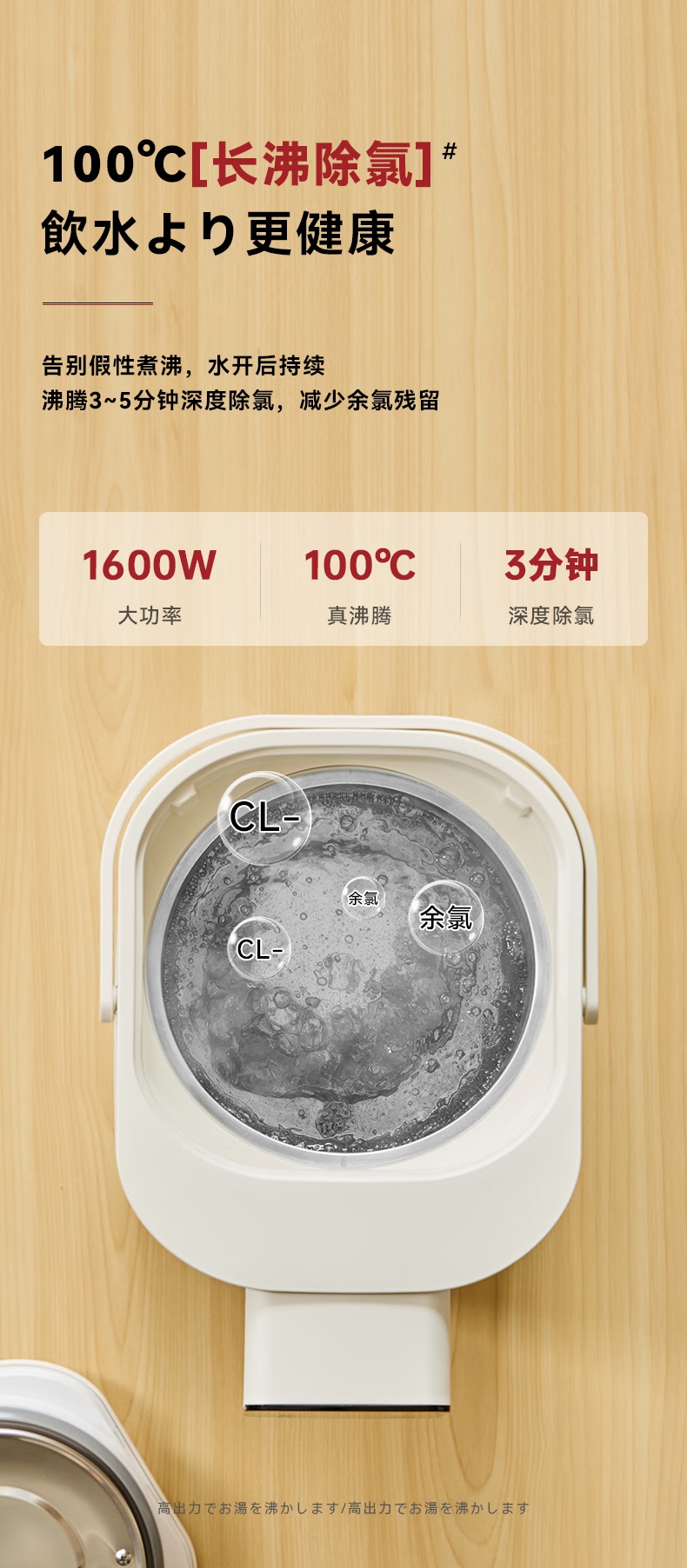 316 不锈钢内胆0,涂层 0 塑料 无异味;1600W 大功率真沸腾;两种模式,自来水 / 纯净水 11 段定温;多重安全保护,童锁设计防烫伤