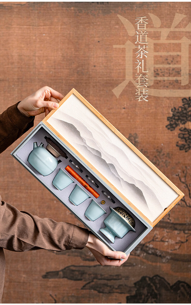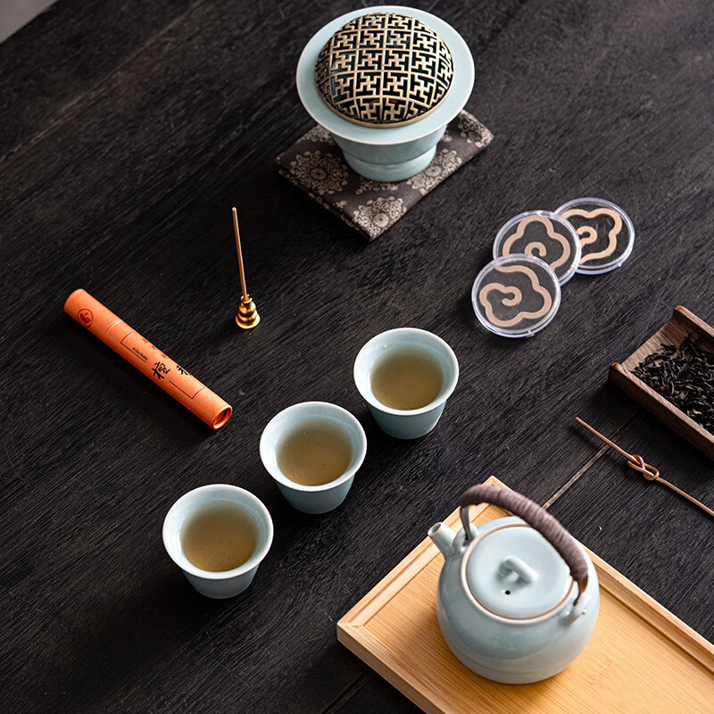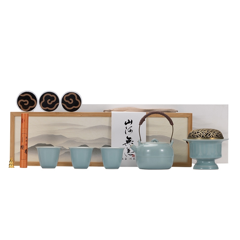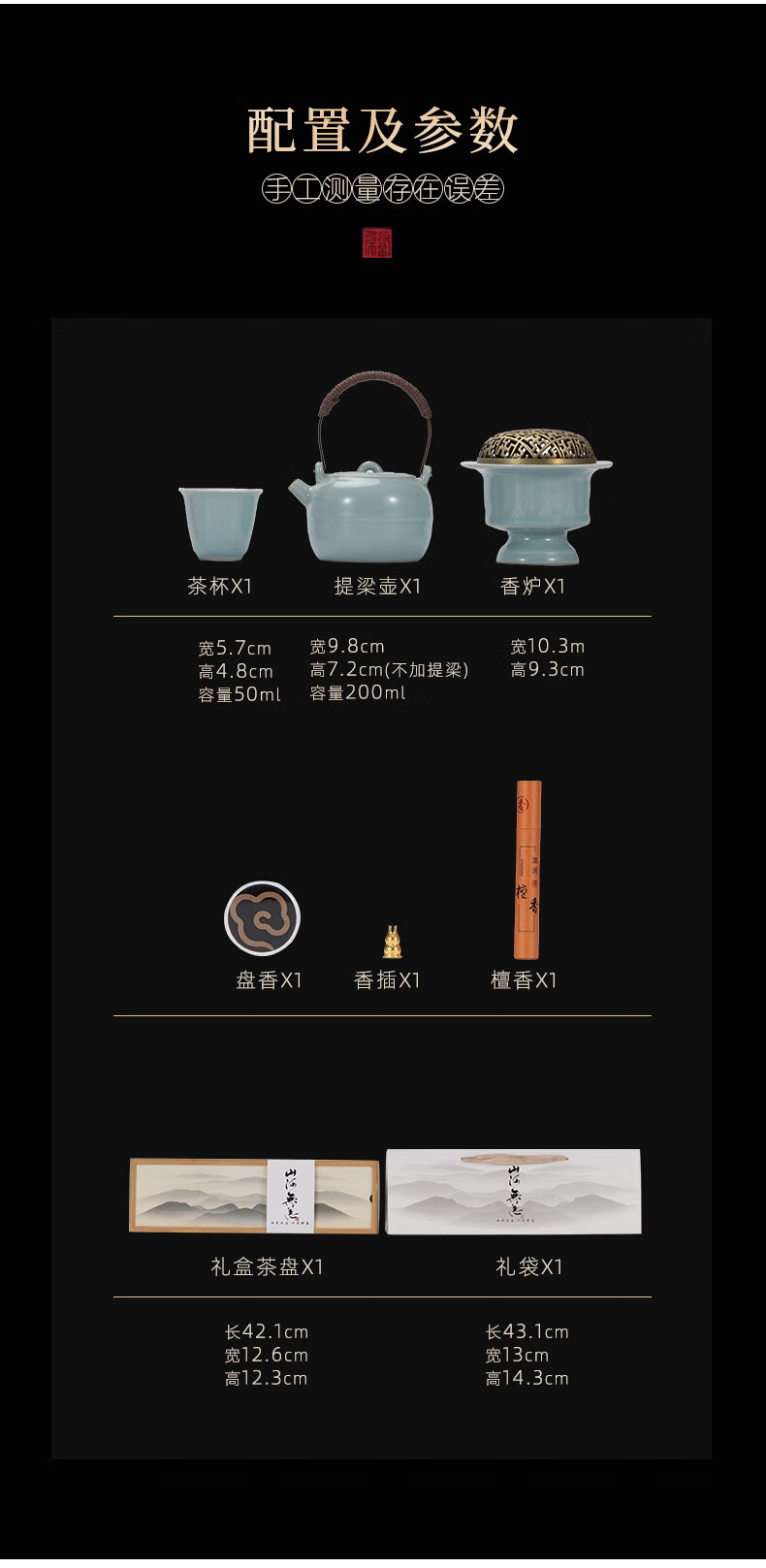 配置:1壶,3杯,1 香炉,3盘香,1香插,1檀香,1礼盒茶盘礼盒