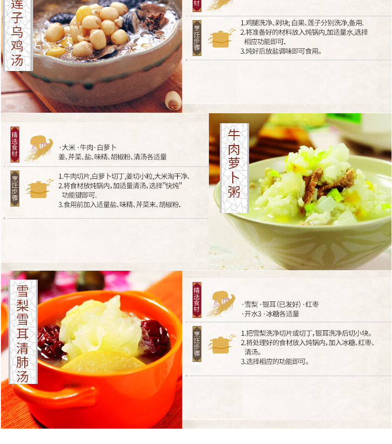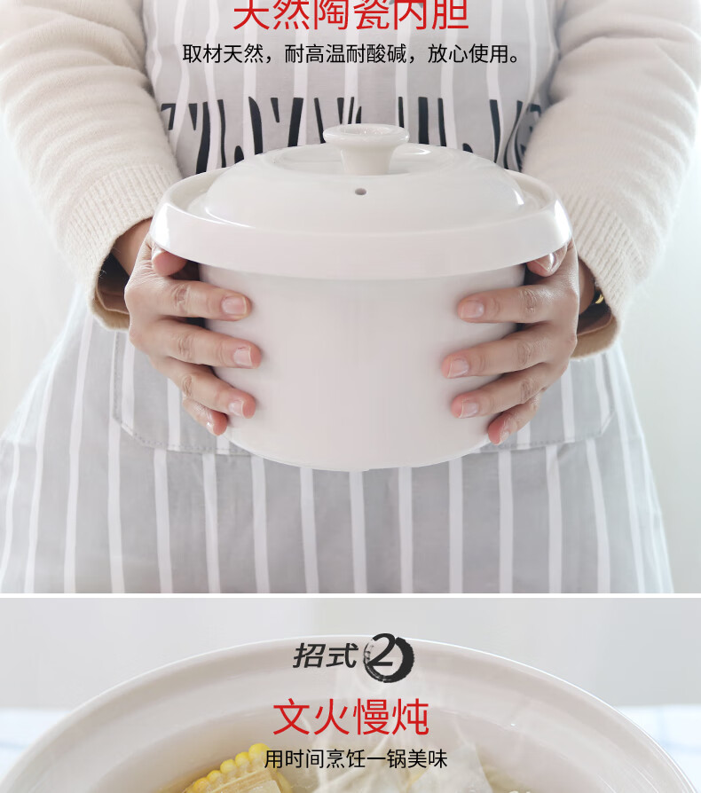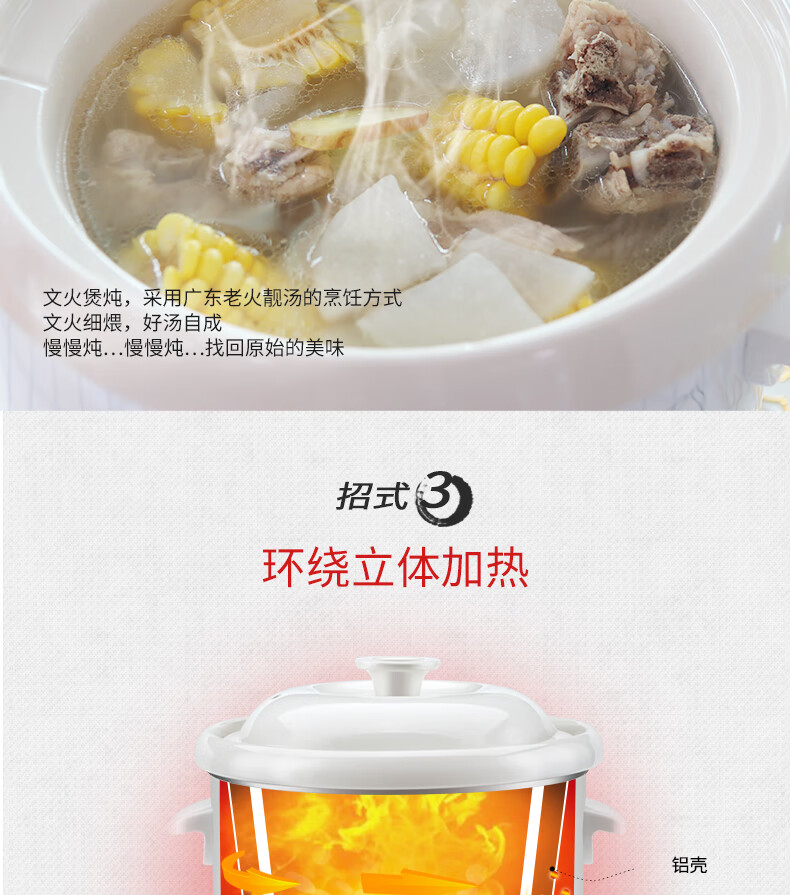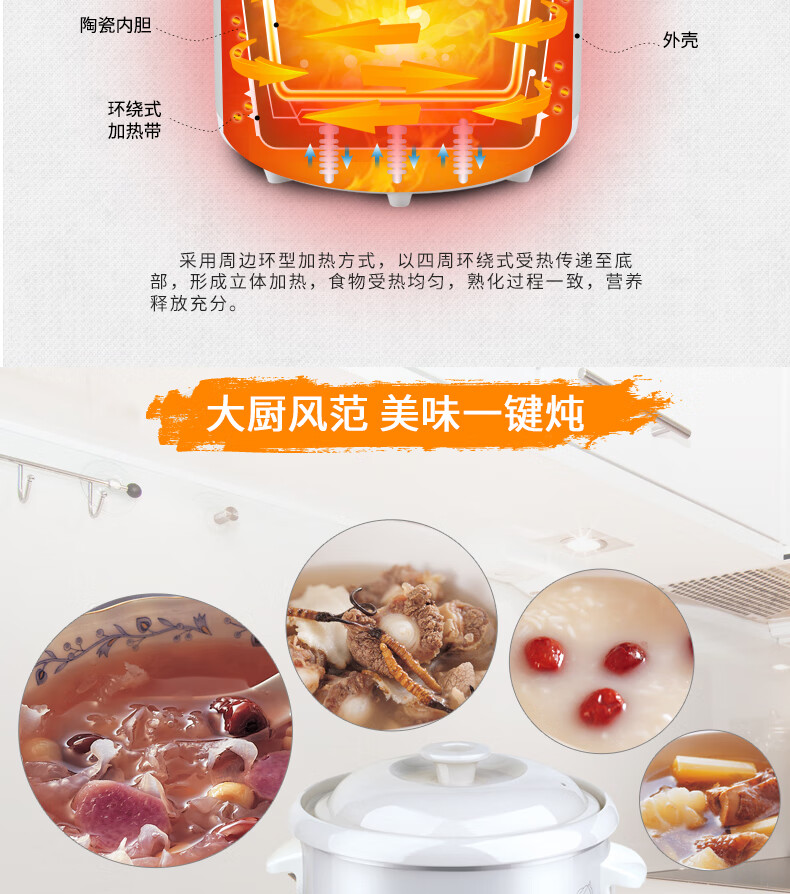 陶瓷内胆, 煮食营养健康;文火煲炖, 食物营养原汁原味;三档火力调节, 简单方便