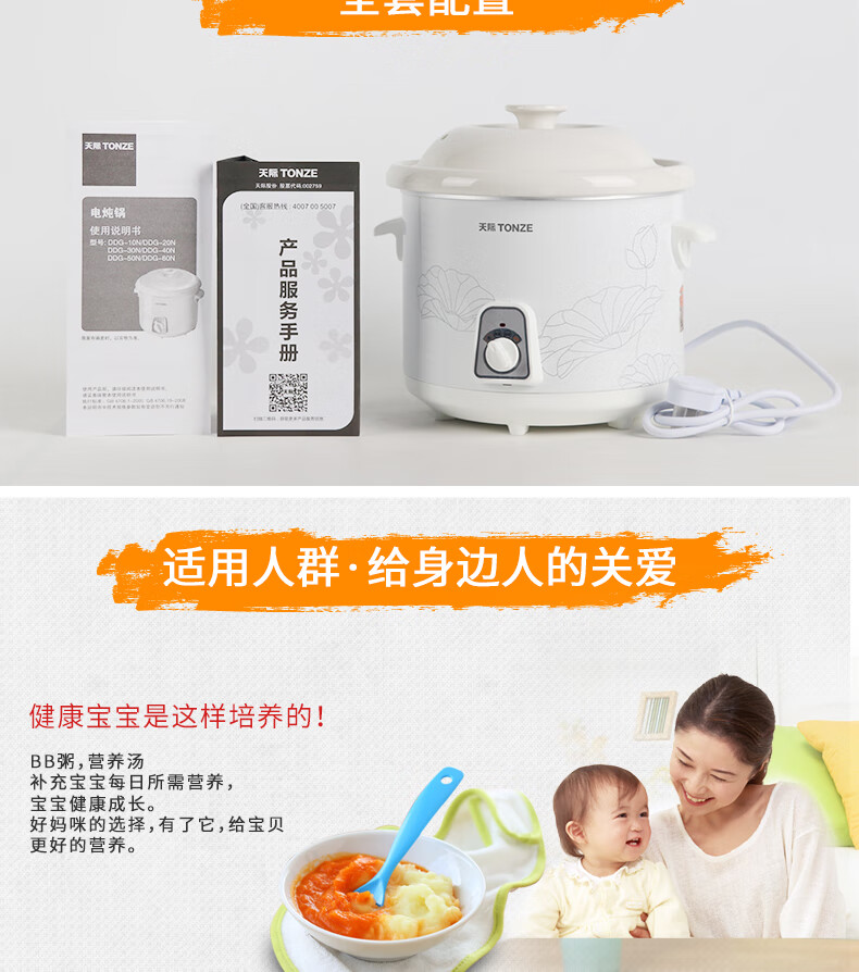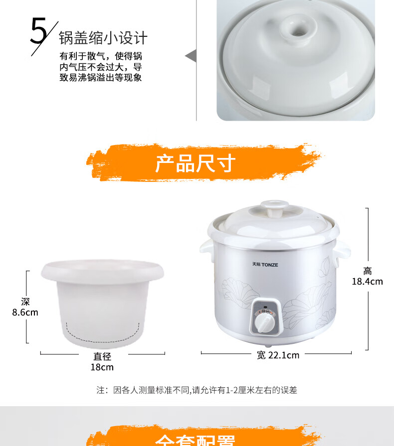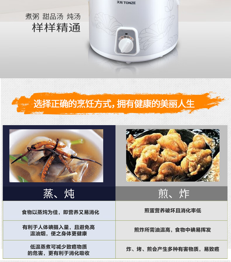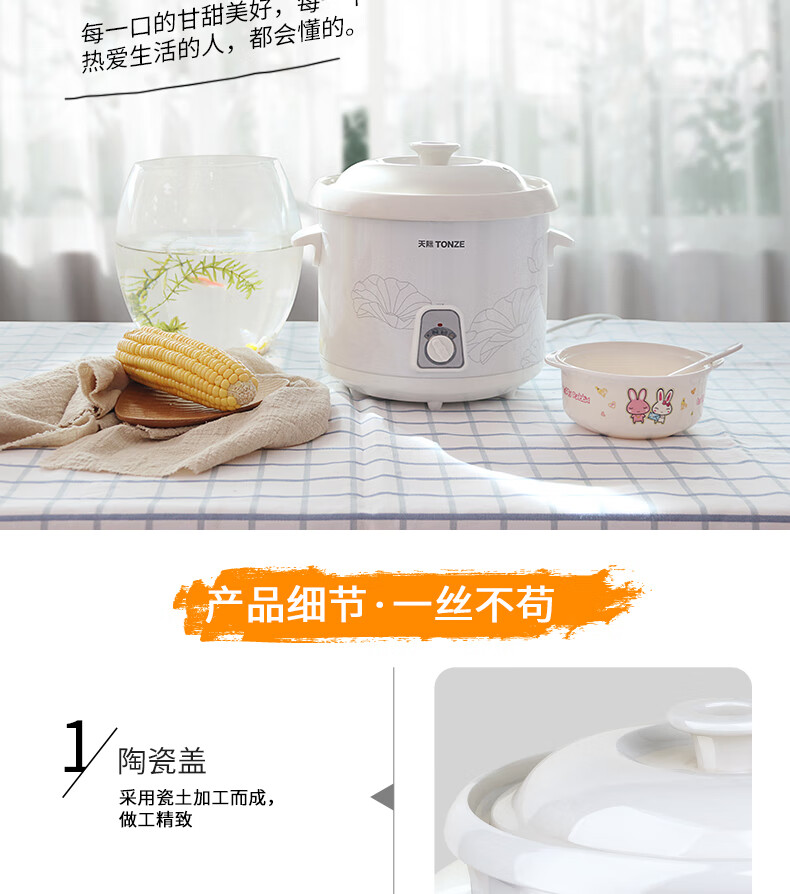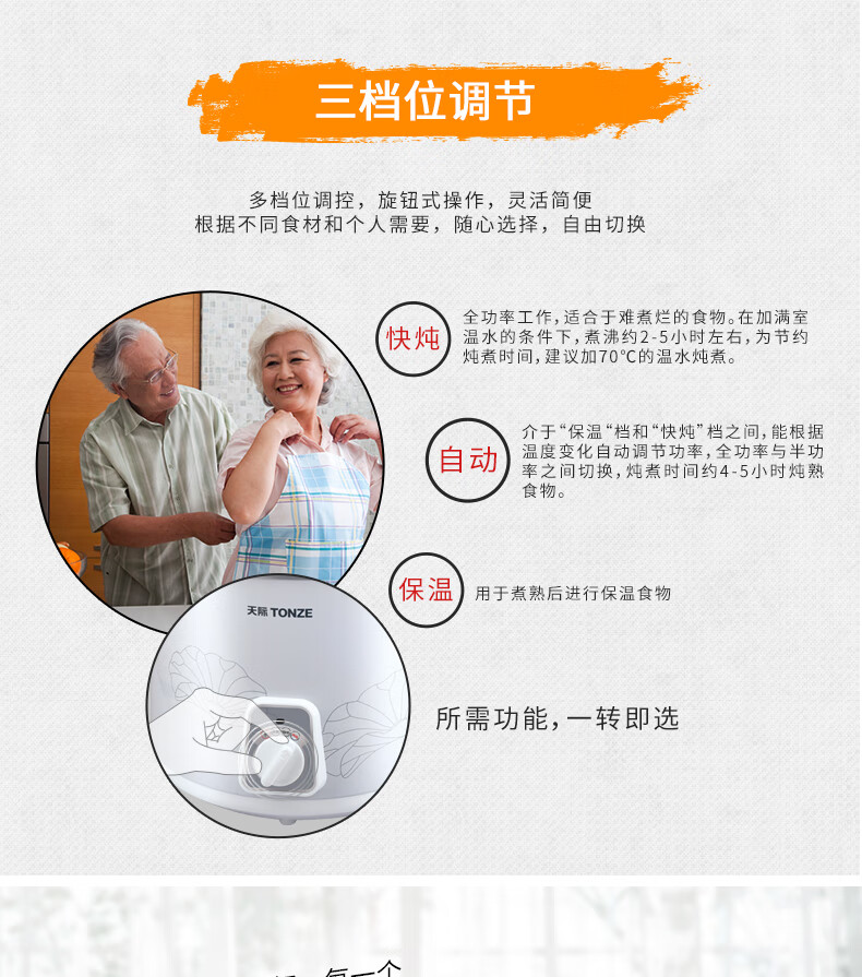 陶瓷内胆, 煮食营养健康;文火煲炖, 食物营养原汁原味;三档火力调节, 简单方便