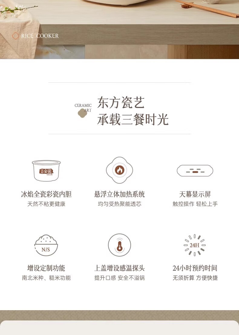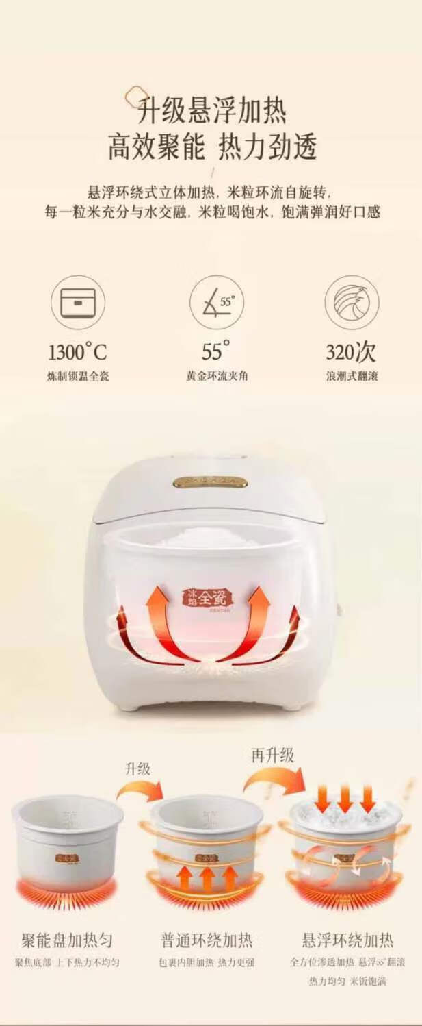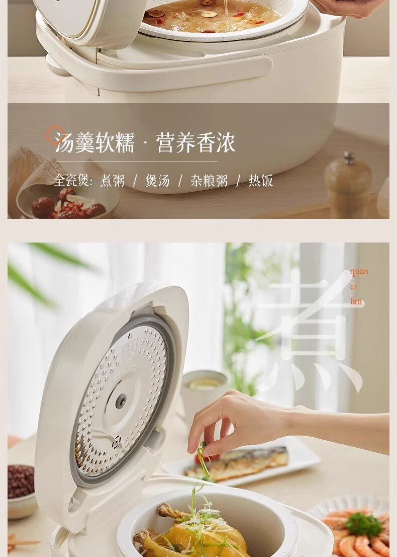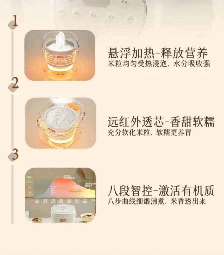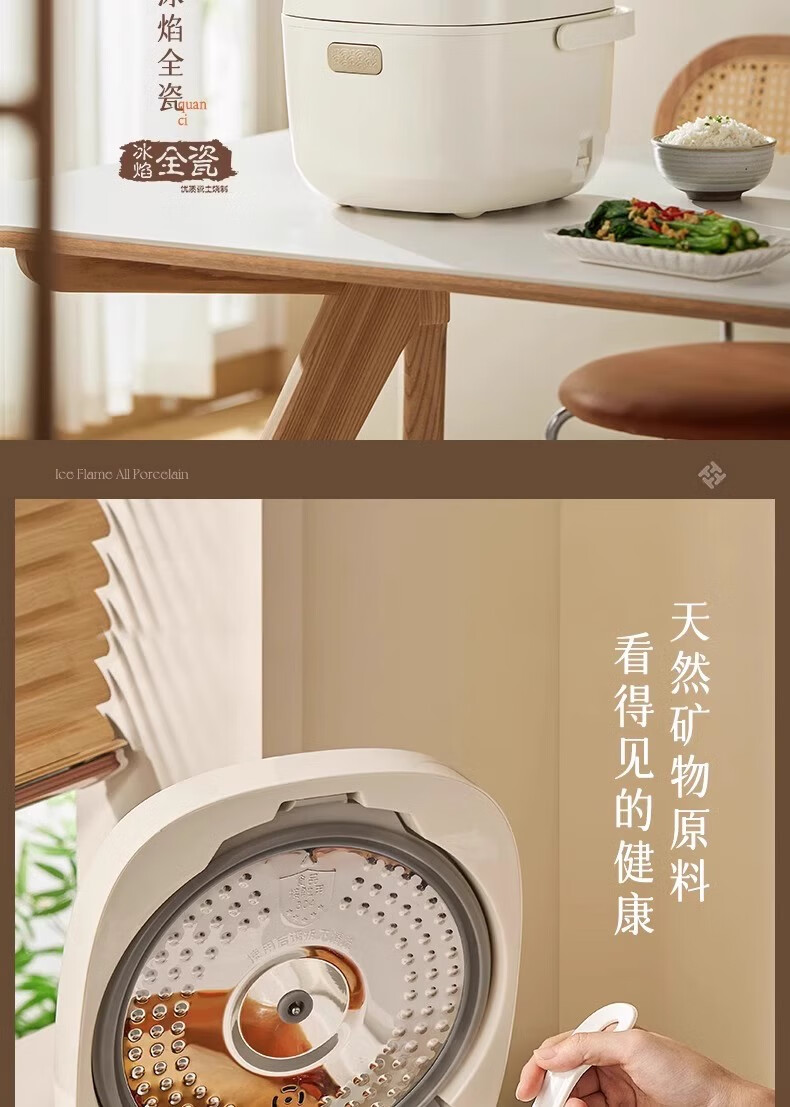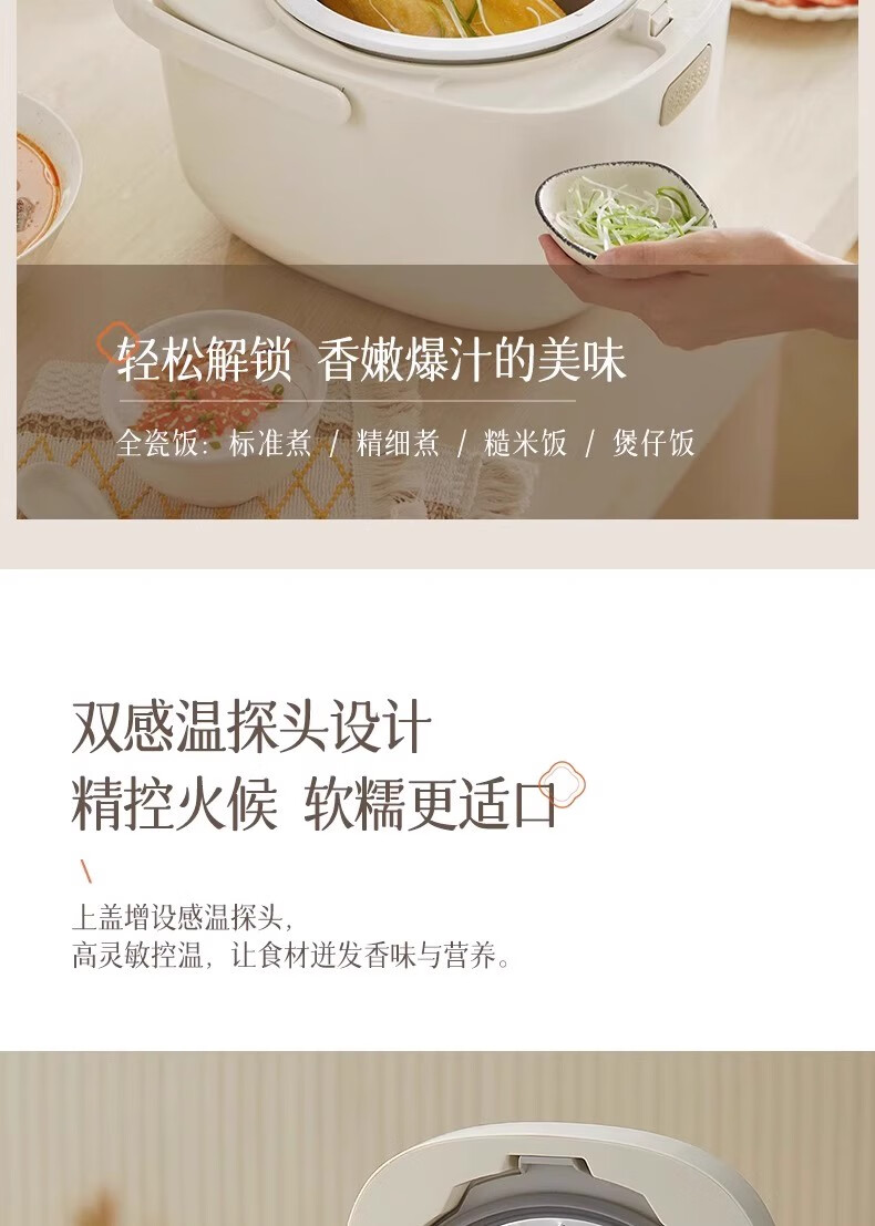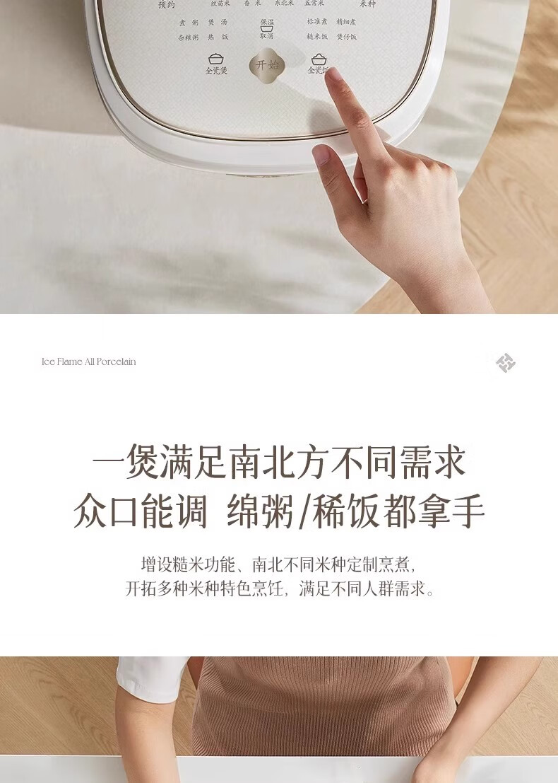 冰焰全瓷内胆, 健康不沾, 清洗方便;全方位精准探温系统, 免看管, 粥汤不溢;特设4大米种程序, 定制您的专属口感