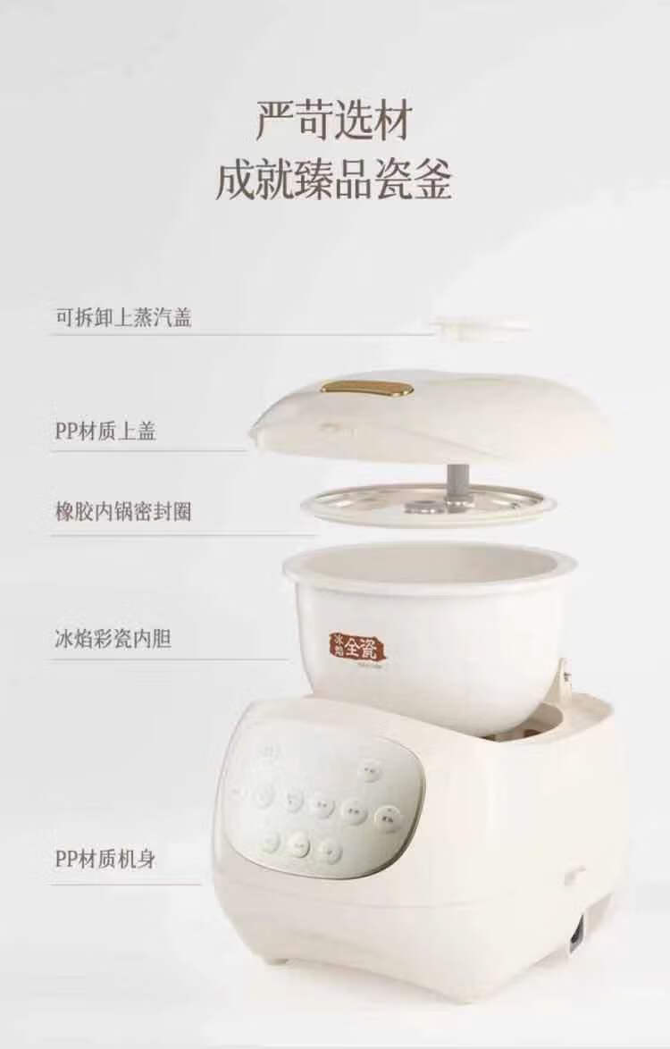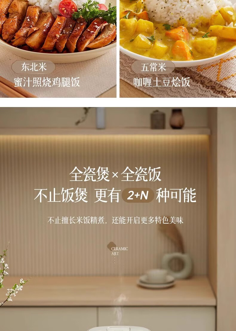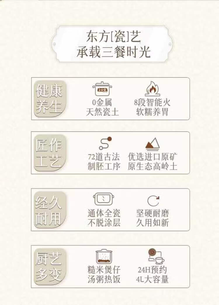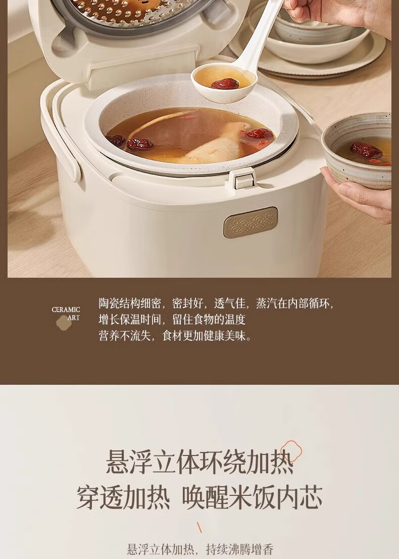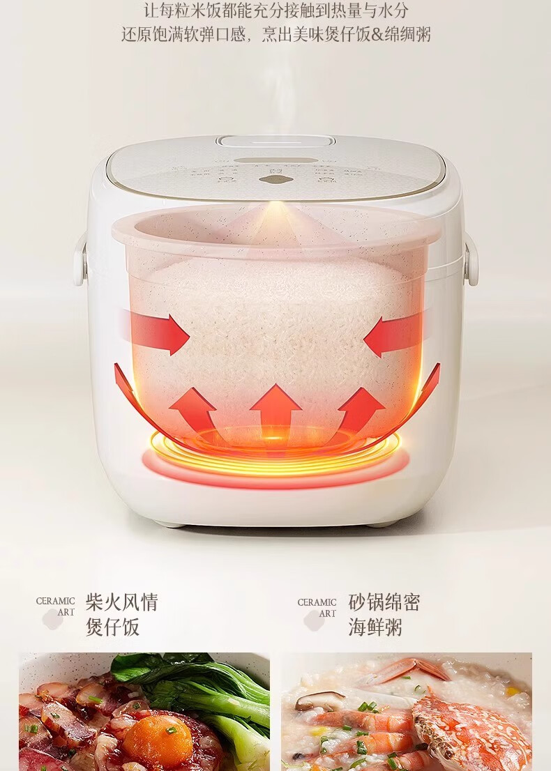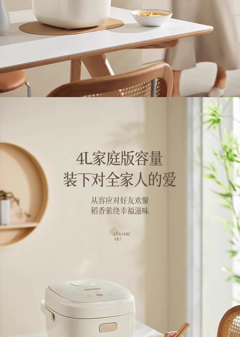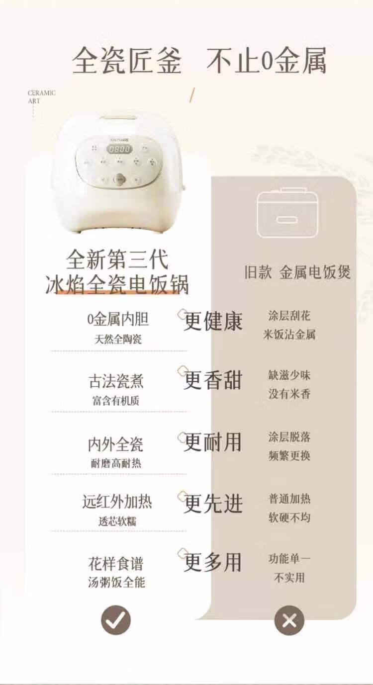 冰焰全瓷内胆, 健康不沾, 清洗方便;全方位精准探温系统, 免看管, 粥汤不溢;特设4大米种程序, 定制您的专属口感