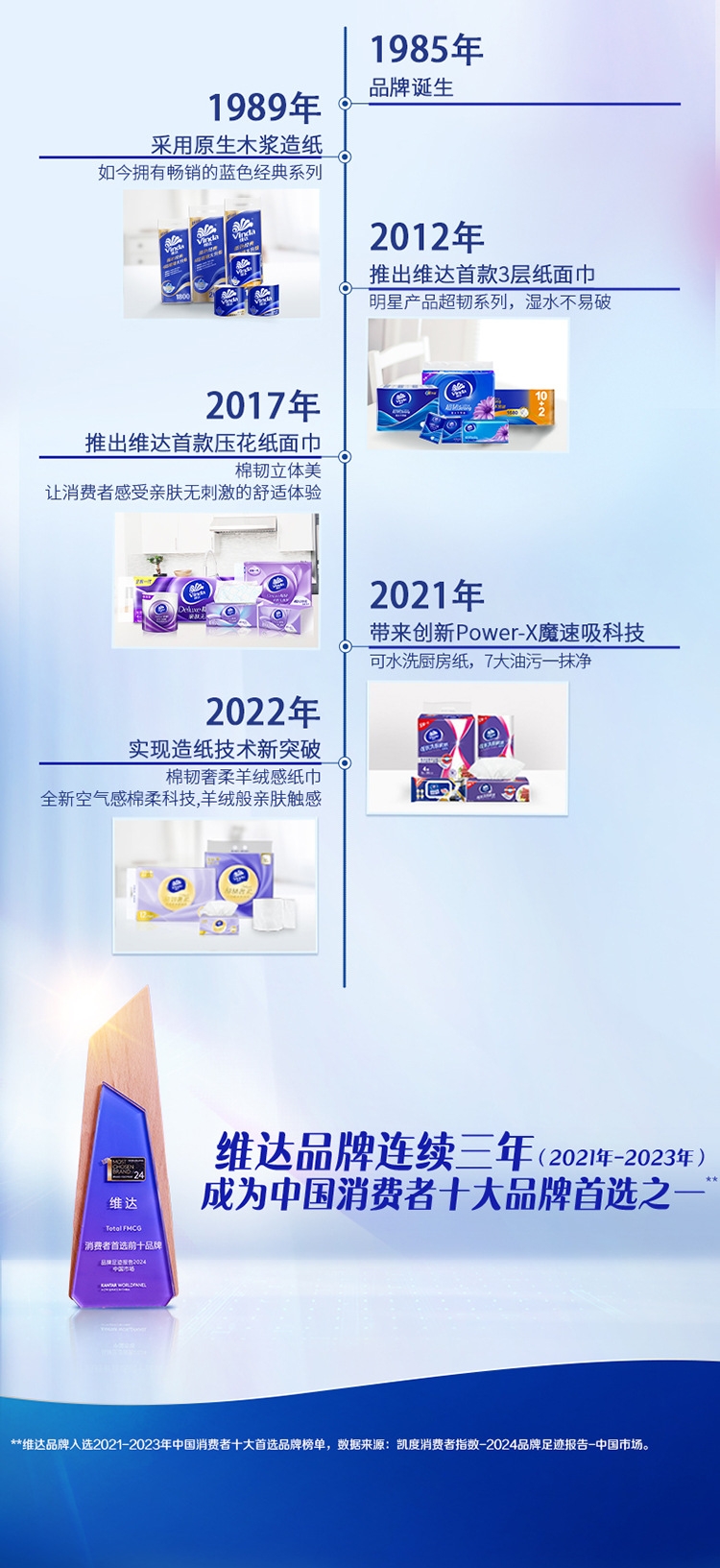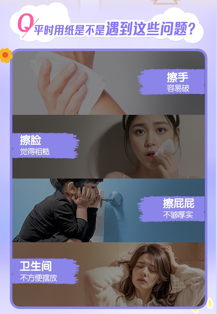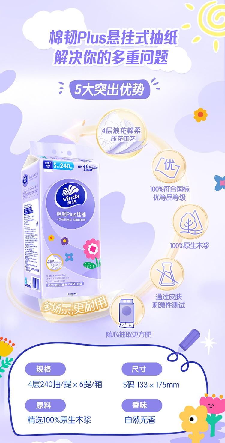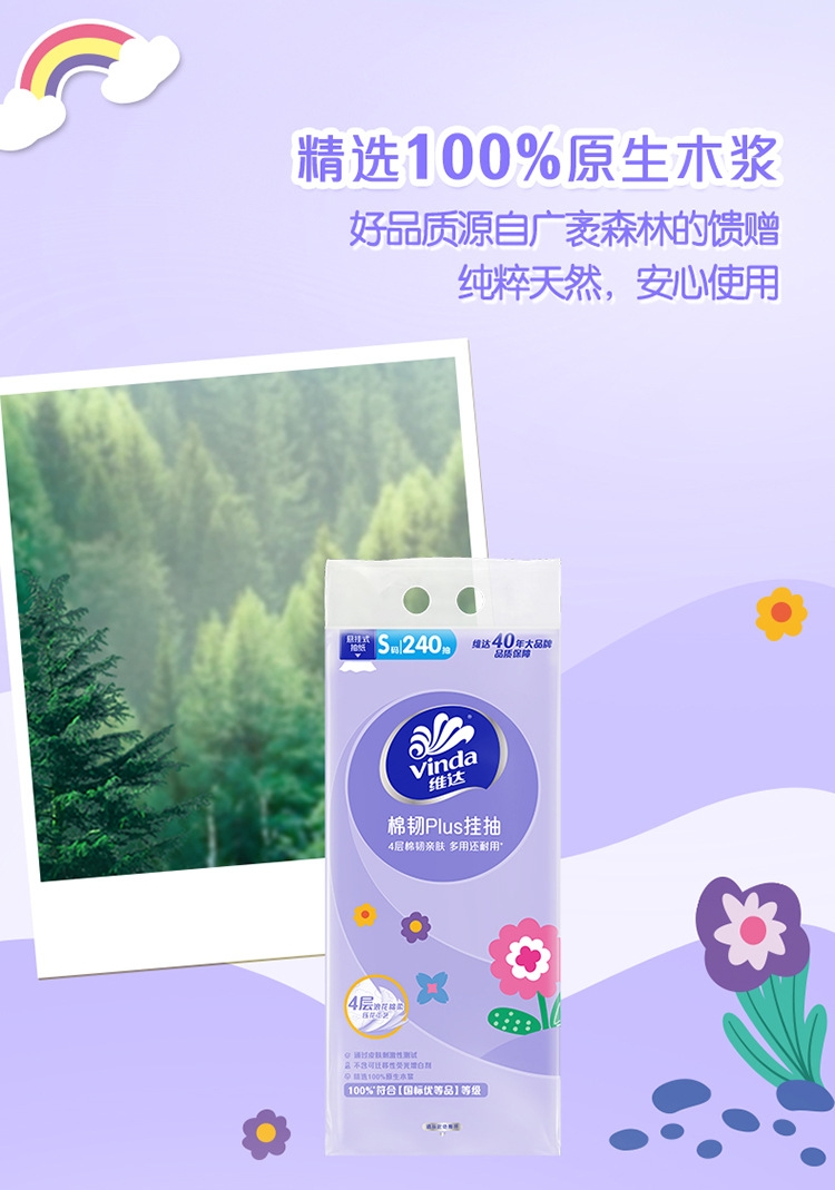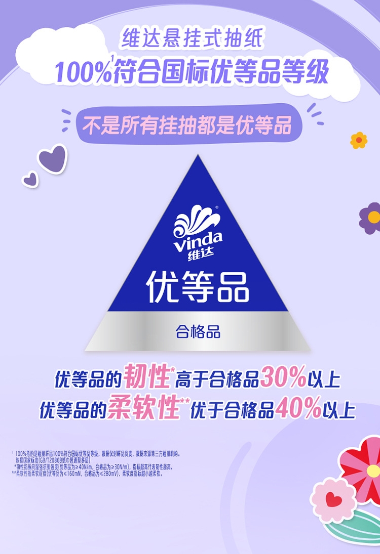 4层压花浪花绵柔工艺;100%原生木浆;100%符合国家优等品质