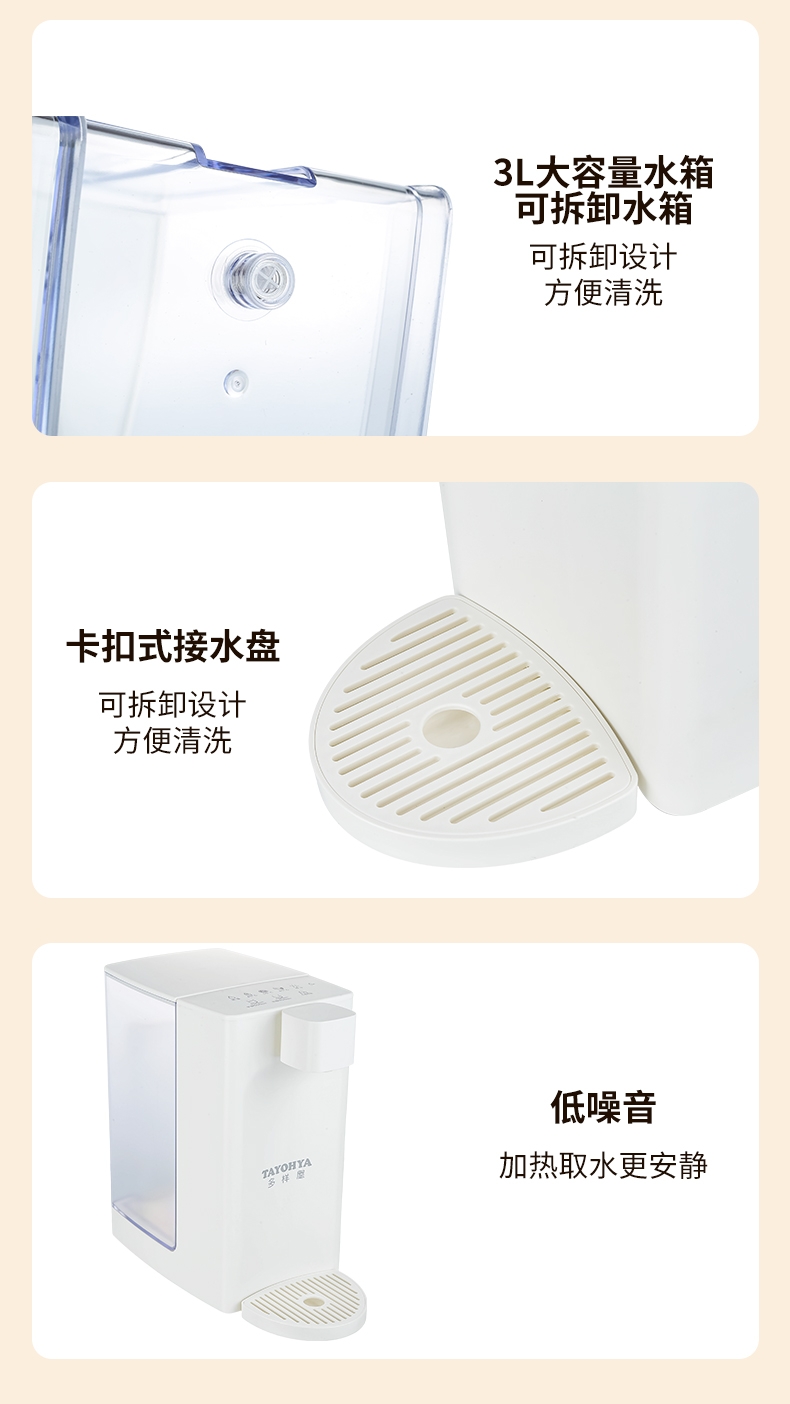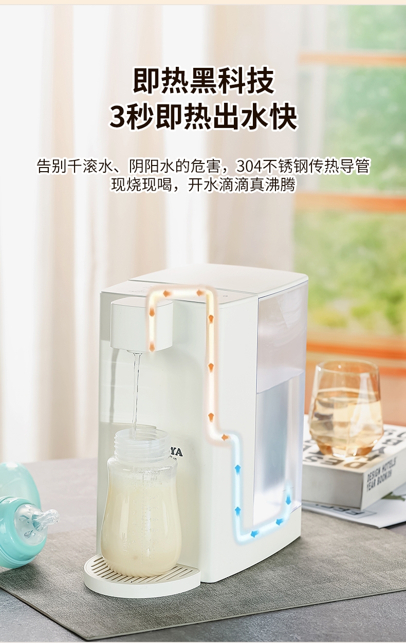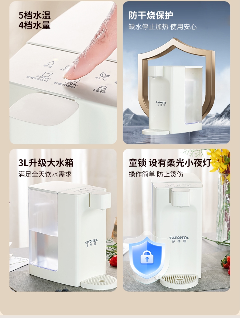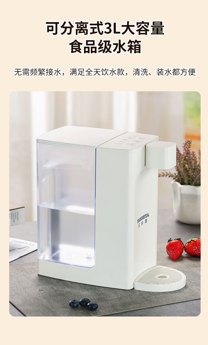 即热技术,喝水不等待,静享纯净鲜活水源;5档温度(常温/45℃/55℃/85℃/开水);四段水量自由选择;可分离式3L大容量食品级水箱, 清洗、装水都方便;防干烧保护,缺水停止加热,使用安心