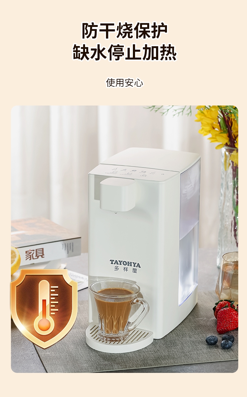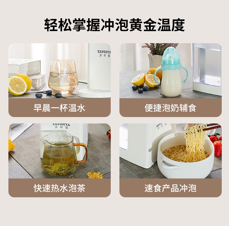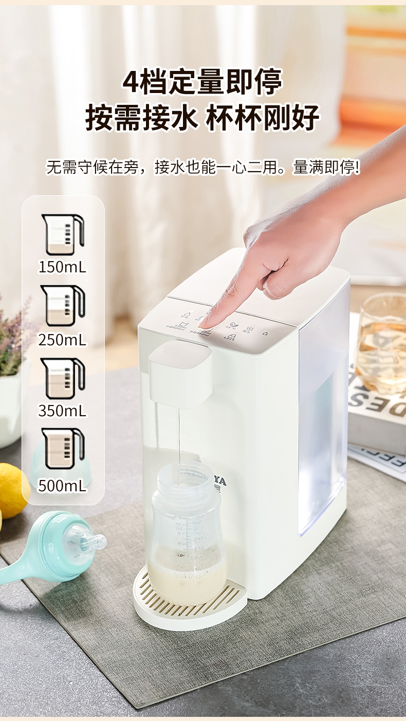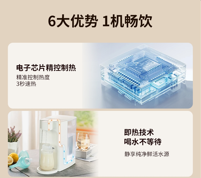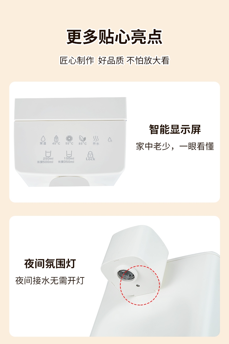 即热技术,喝水不等待,静享纯净鲜活水源;5档温度(常温/45℃/55℃/85℃/开水);四段水量自由选择;可分离式3L大容量食品级水箱, 清洗、装水都方便;防干烧保护,缺水停止加热,使用安心