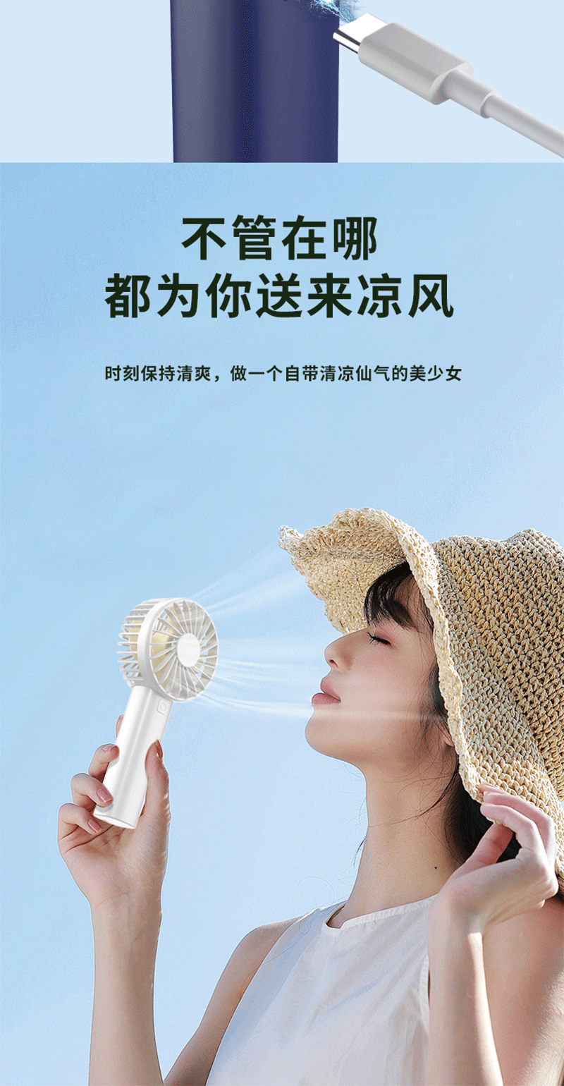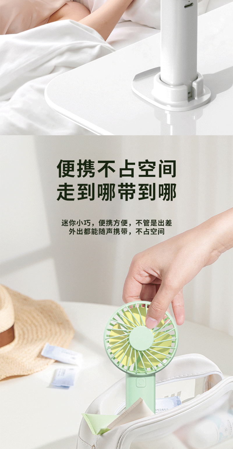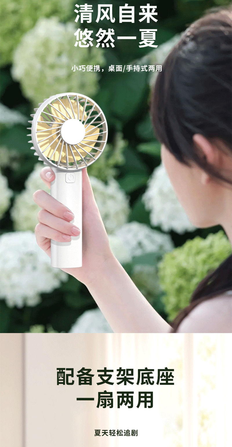便携风扇:手持 / 立放两用;风扇续航持久、雨伞轻量便携;风力柔和静音,走哪都能吹走闷热
