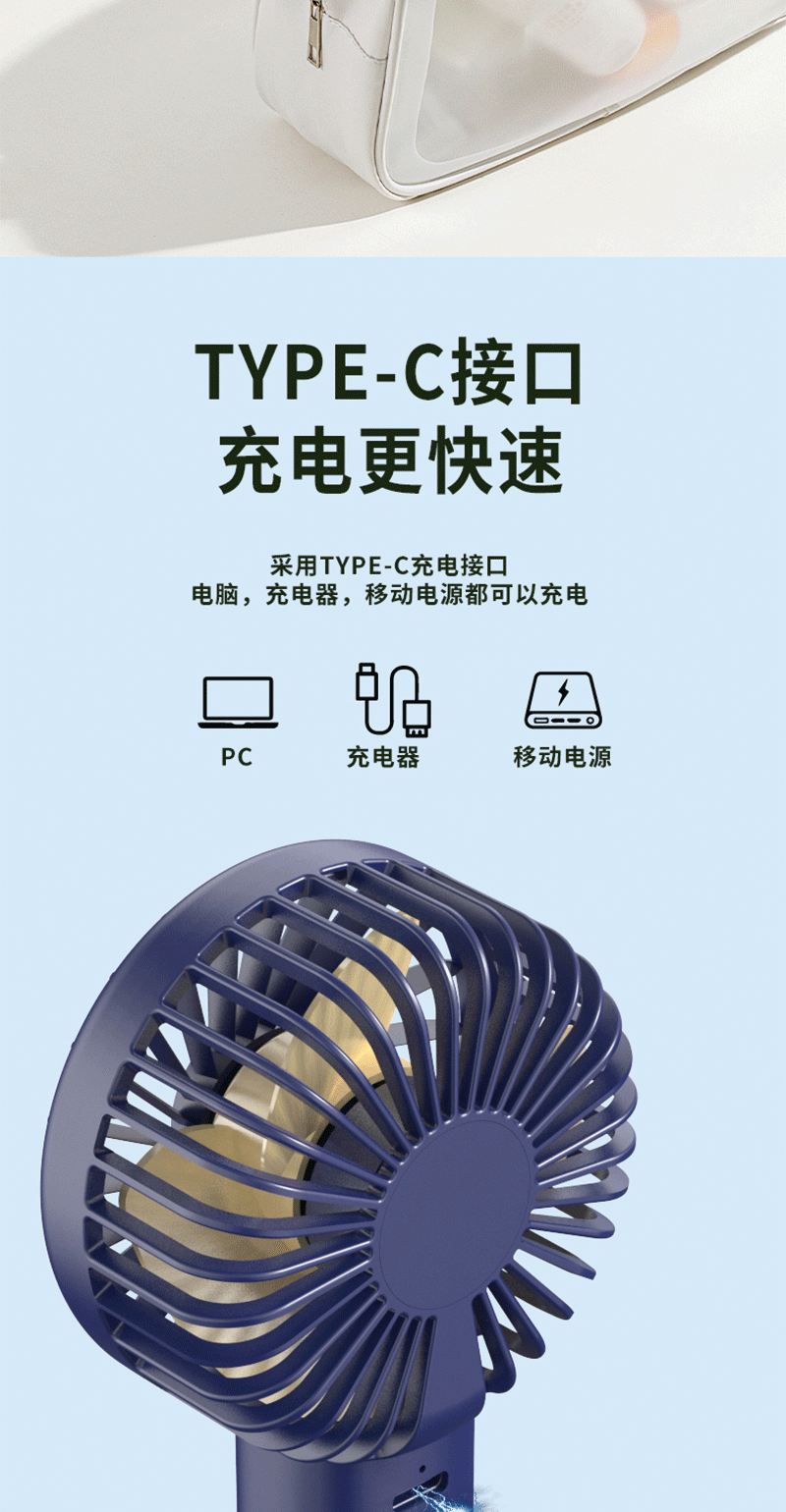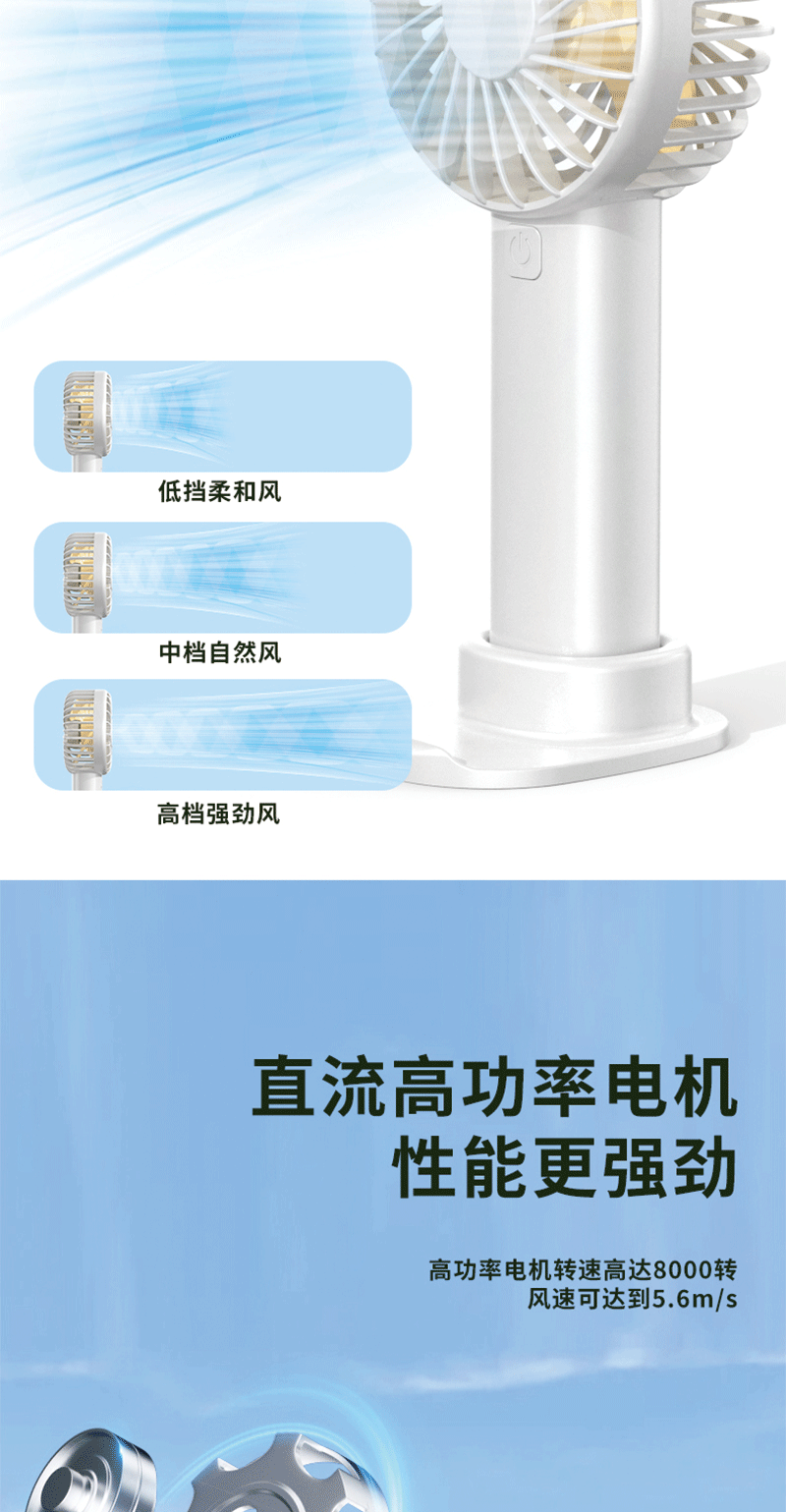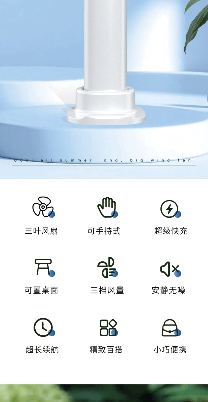 便携风扇:手持 / 立放两用;风扇续航持久、雨伞轻量便携;风力柔和静音,走哪都能吹走闷热