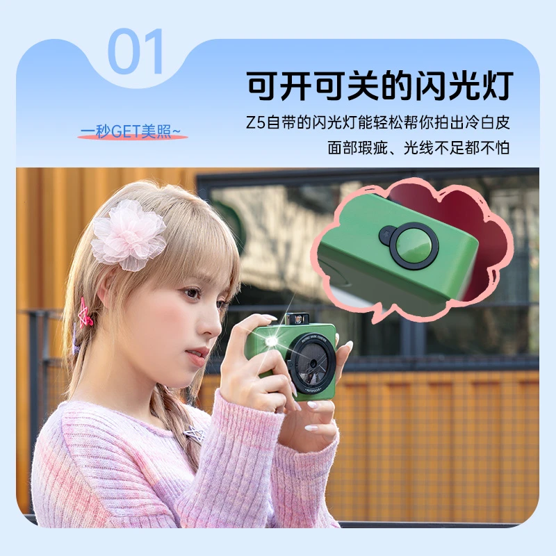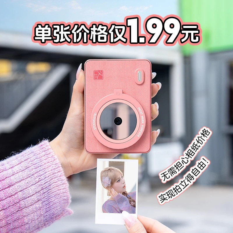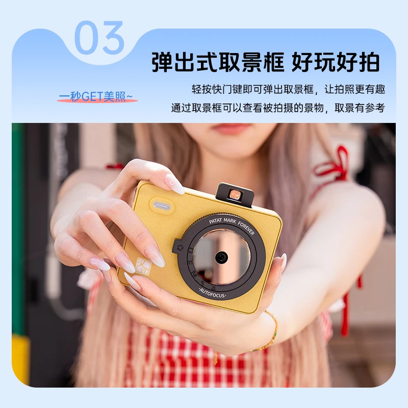 全视角大屏,五档无级滤镜按钮体验趣味玩法;闪光灯无惧换环境,弾单出式取景器鲜活色彩;精准还厡即拍即得