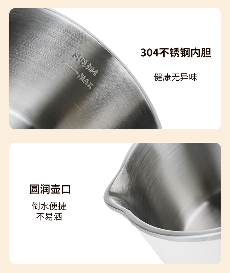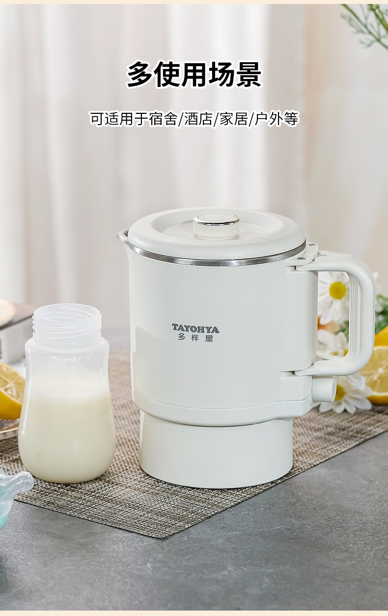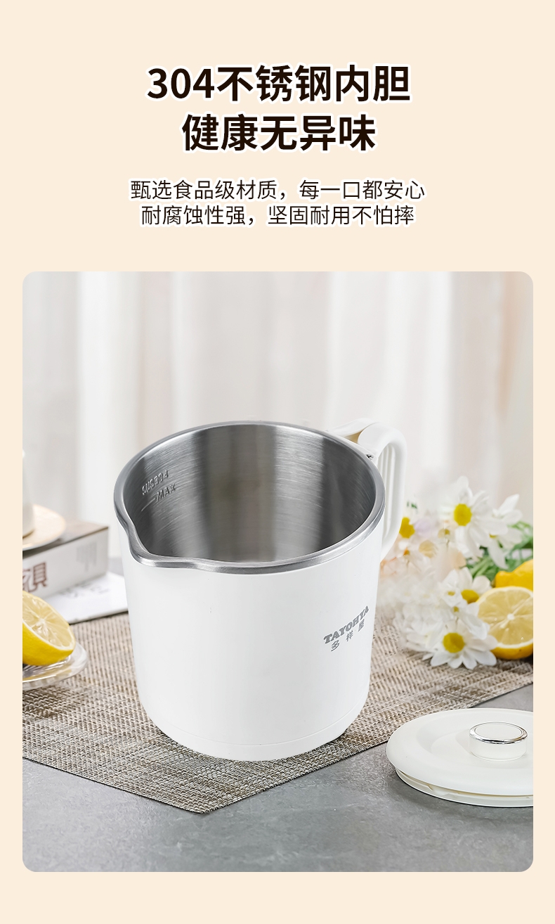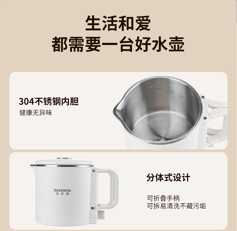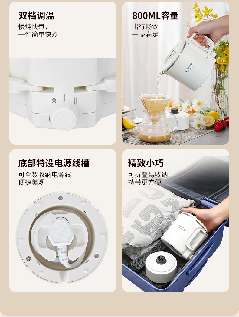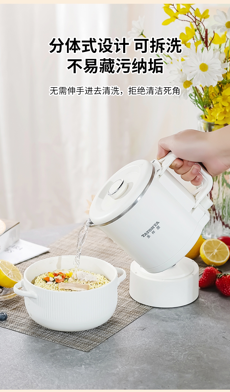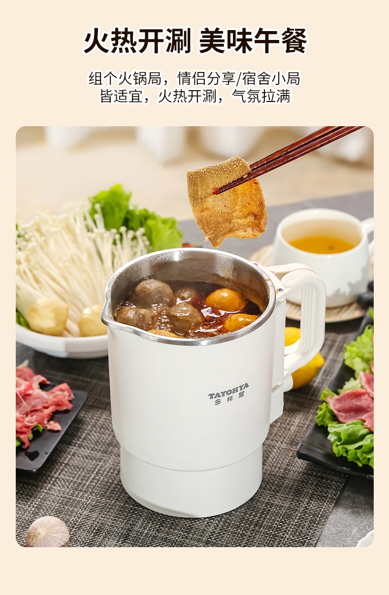 分体式设计,可折叠手柄可拆易清洗不藏污垢;精致小巧,可折叠易收纳携带更方便;304不锈钢内胆,健康无异味;双档调温,慢炖快煮,一件简单快煮;可适用于宿舍/酒店/家居/户外等多使用场景