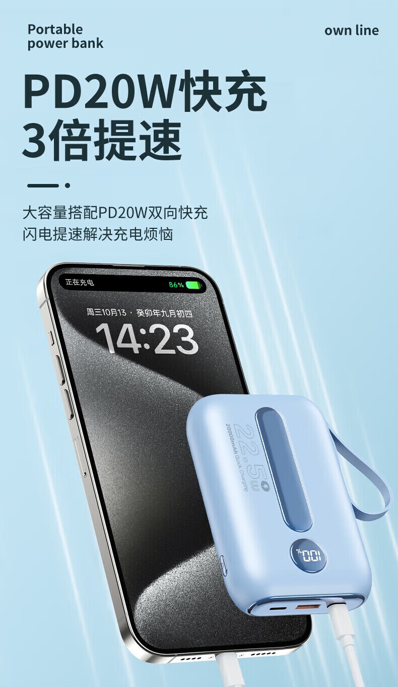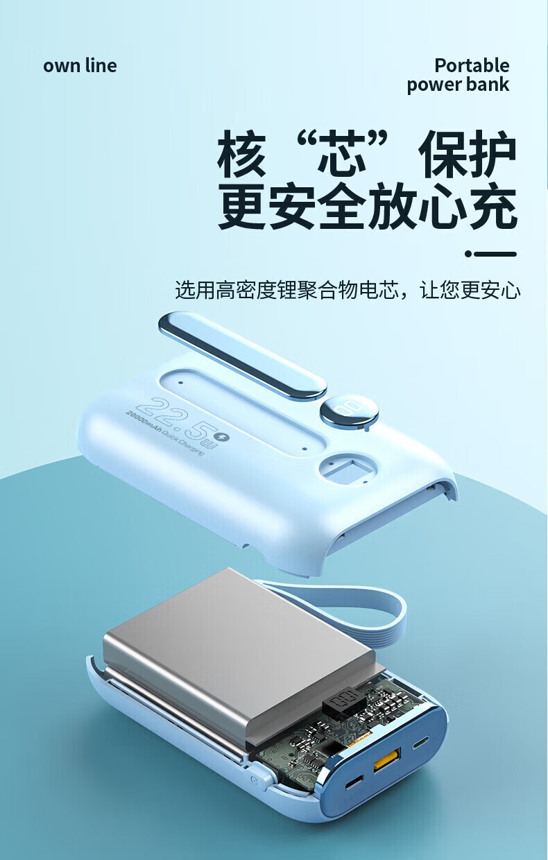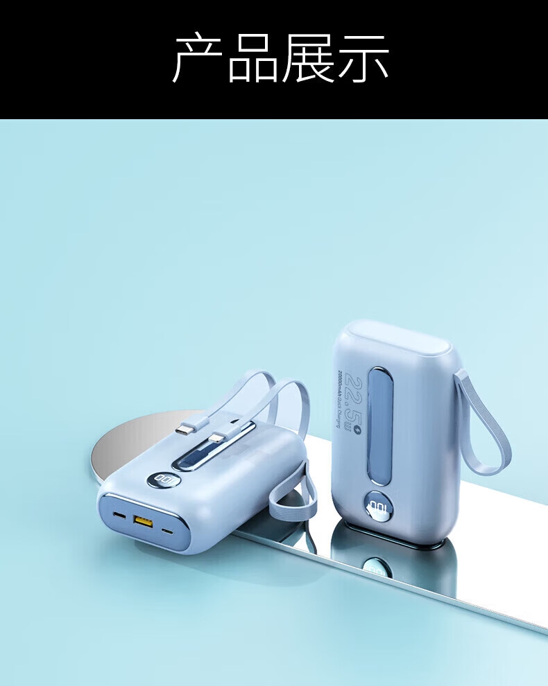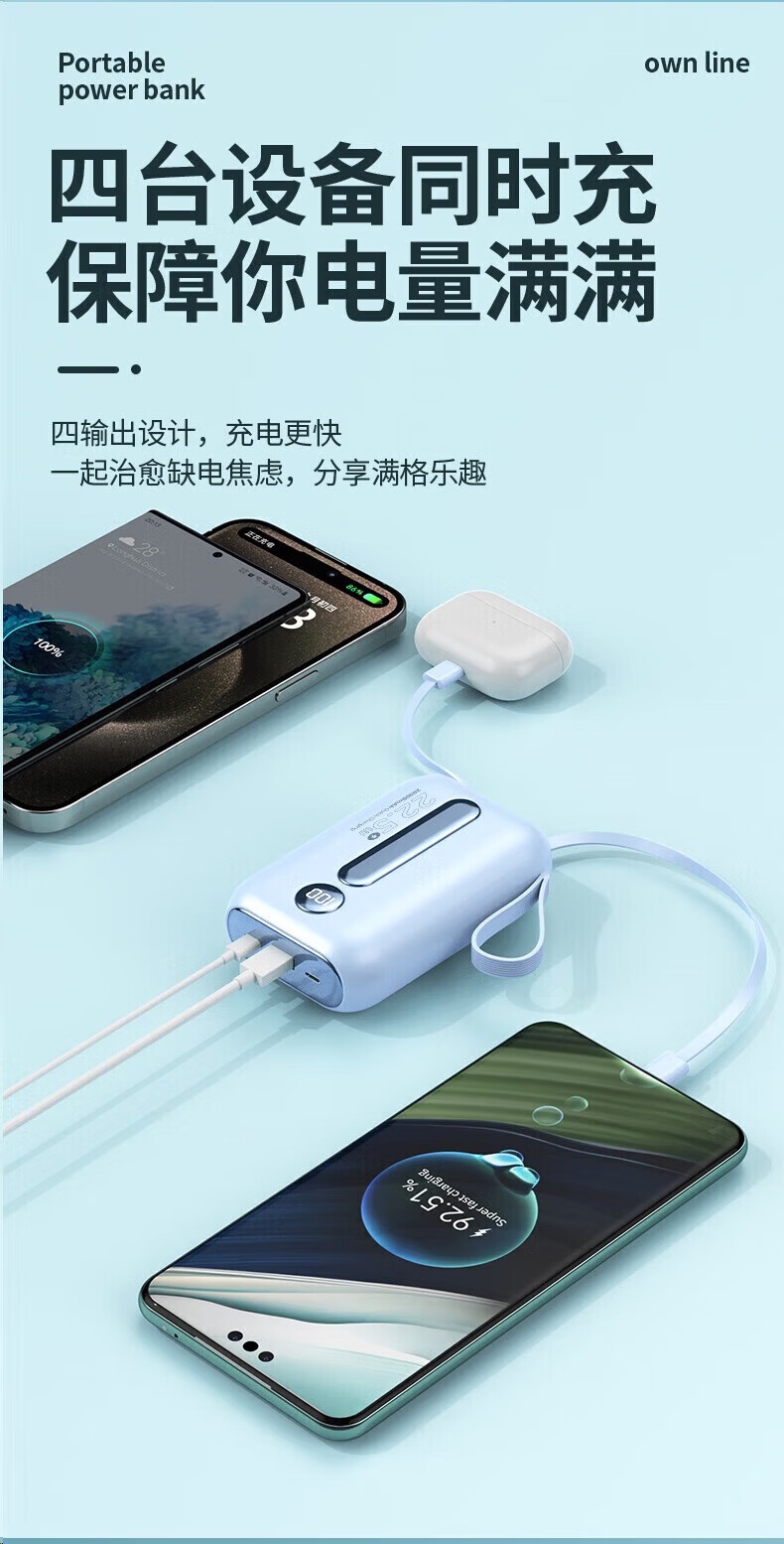 自带线,多口输出,可多手机同时充电;智能数显,电量一目了然;多重安全保护,充电的同时更保护电池
