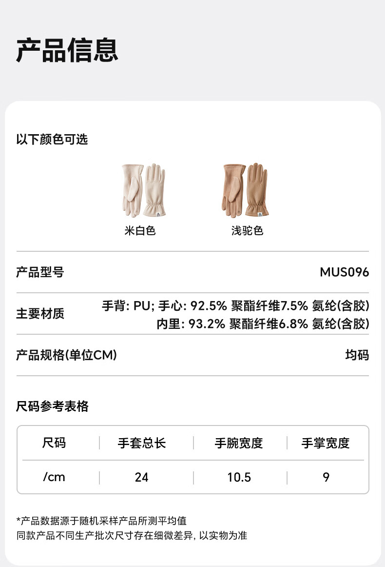 材质:手背:PU手心面料:92.5% 聚酯纤维7.5% 氨纶(含胶) 内里:93.2% 聚酯纤维6.8% 氨纶(含胶)