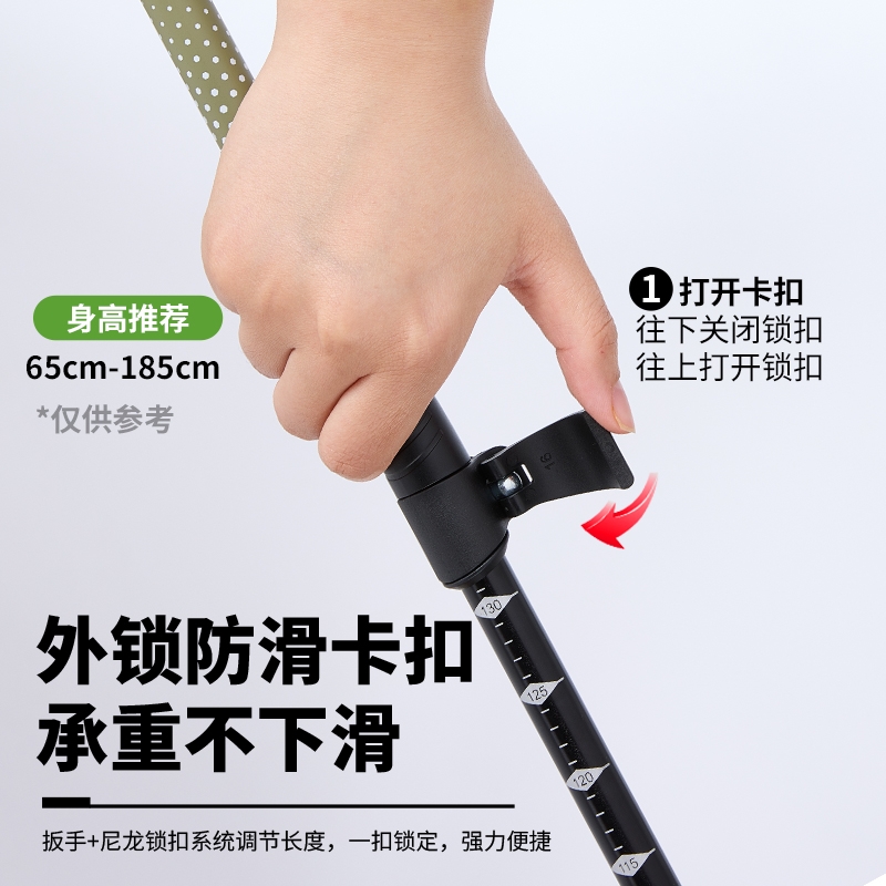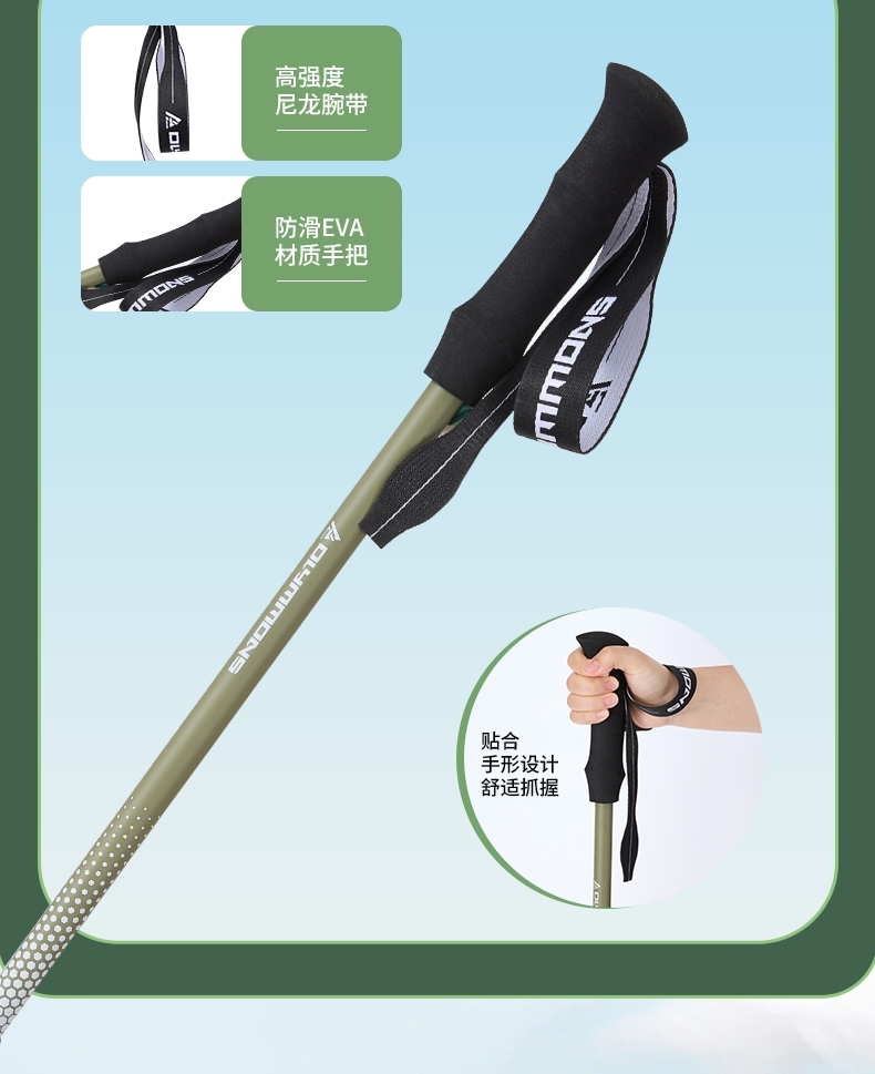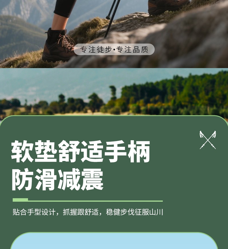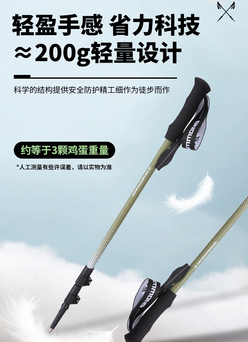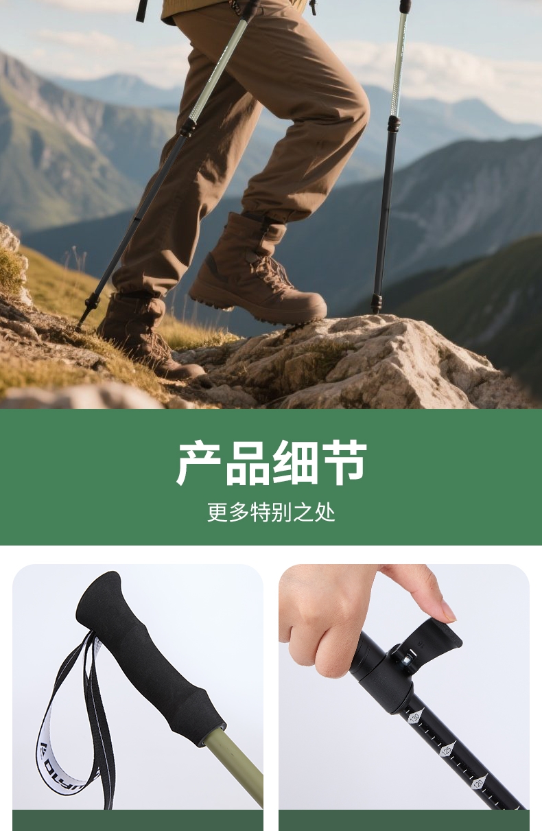 专为户外探险设计,登山杖能有效提升行走稳定性;减轻膝盖和关节压力,适合山地、崎岖地形或长途徒步;配备可调节高度、防滑腕带和减震系统