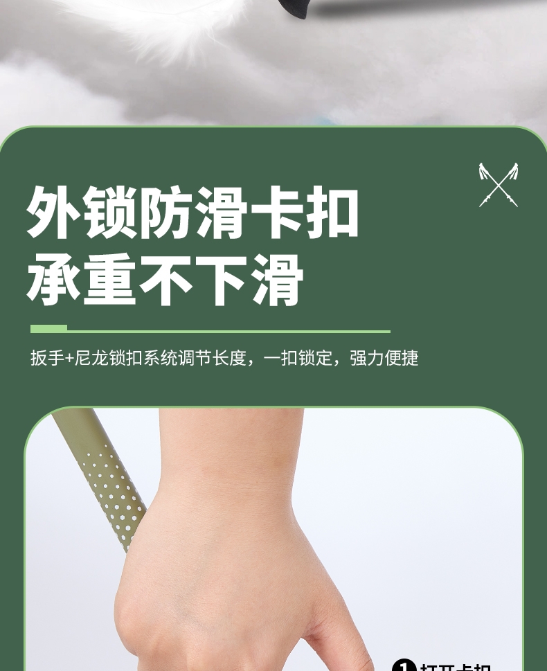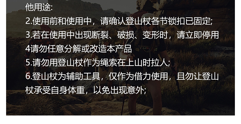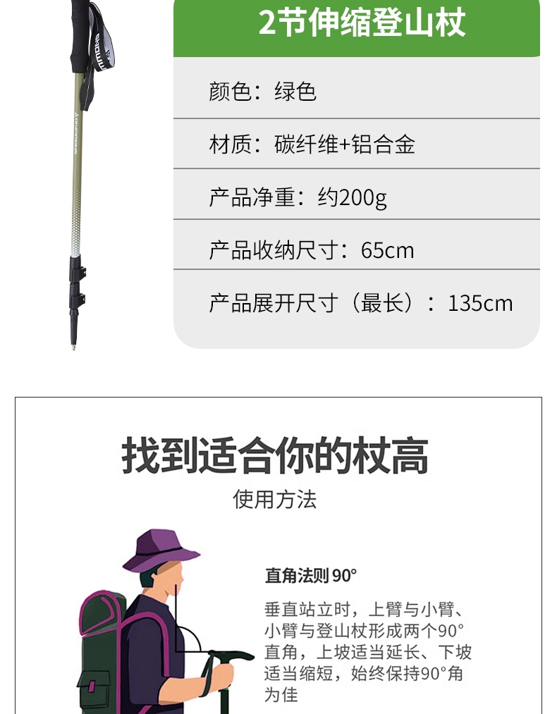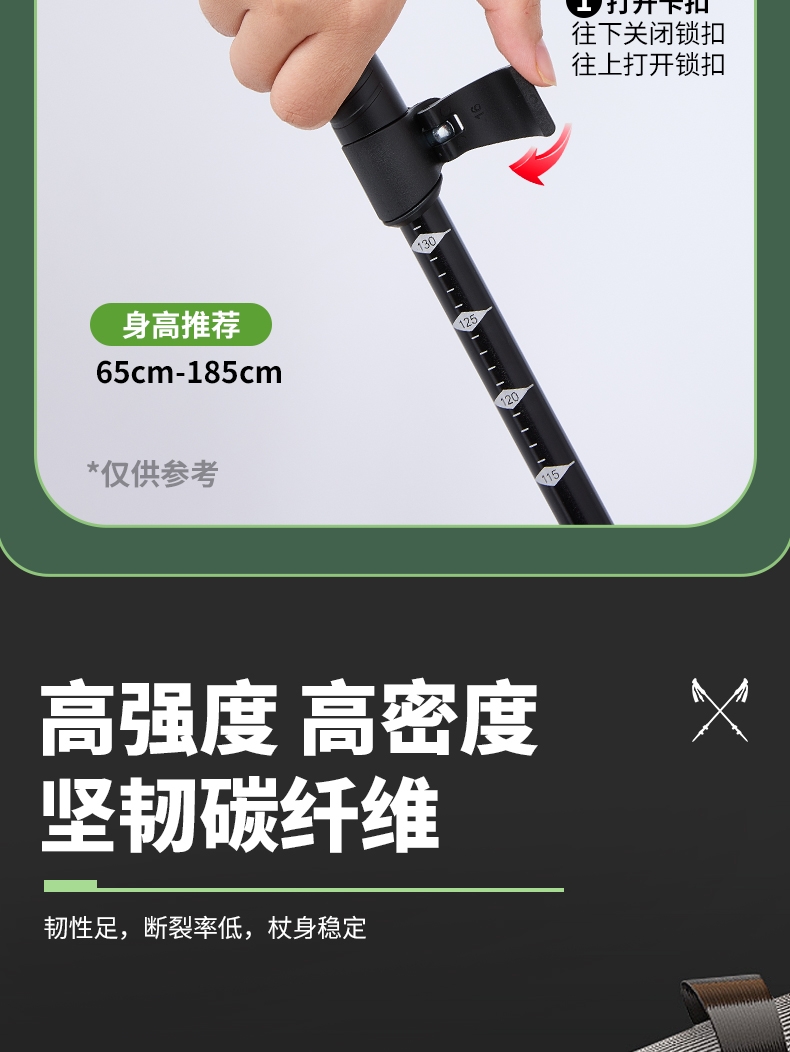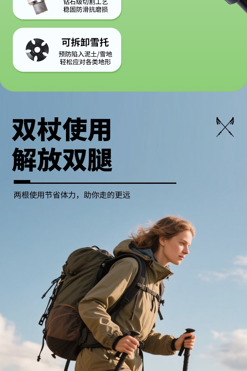 专为户外探险设计,登山杖能有效提升行走稳定性;减轻膝盖和关节压力,适合山地、崎岖地形或长途徒步;配备可调节高度、防滑腕带和减震系统