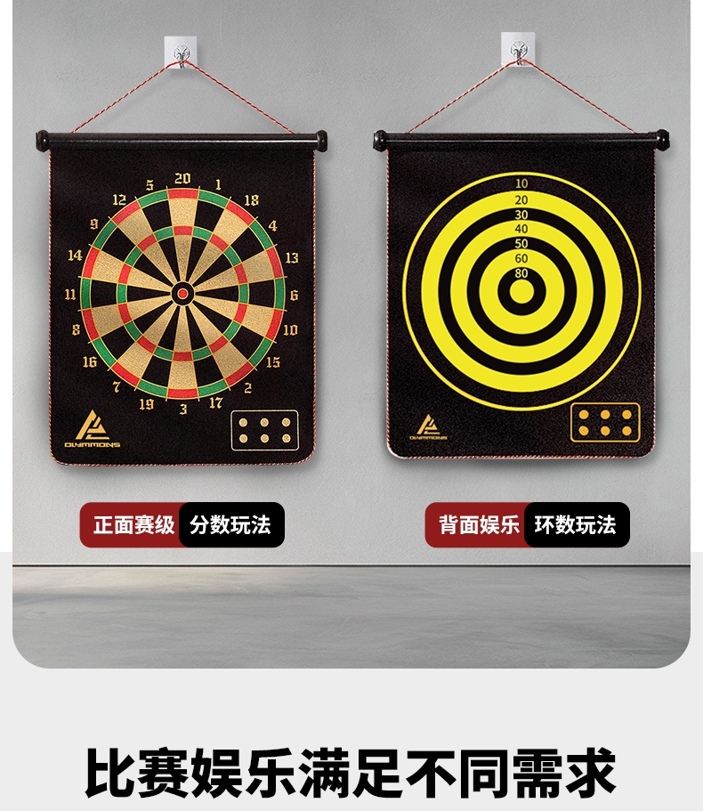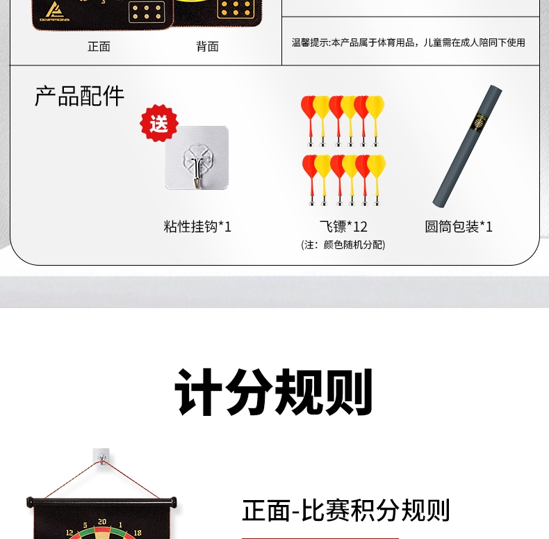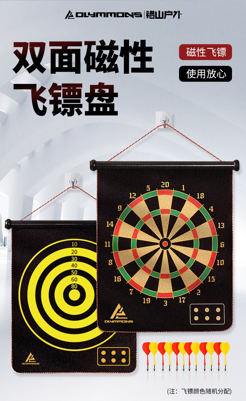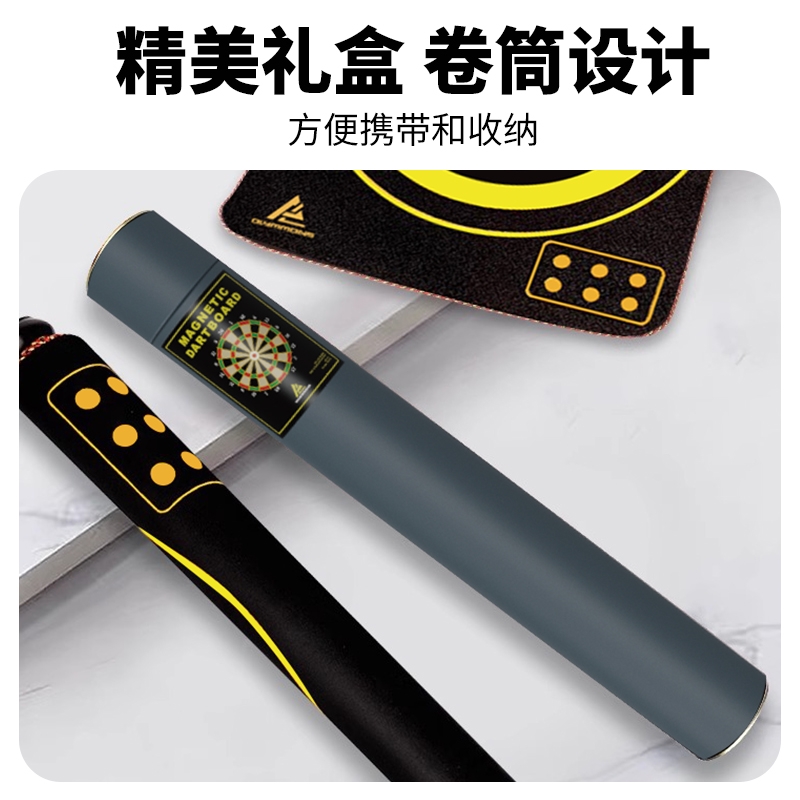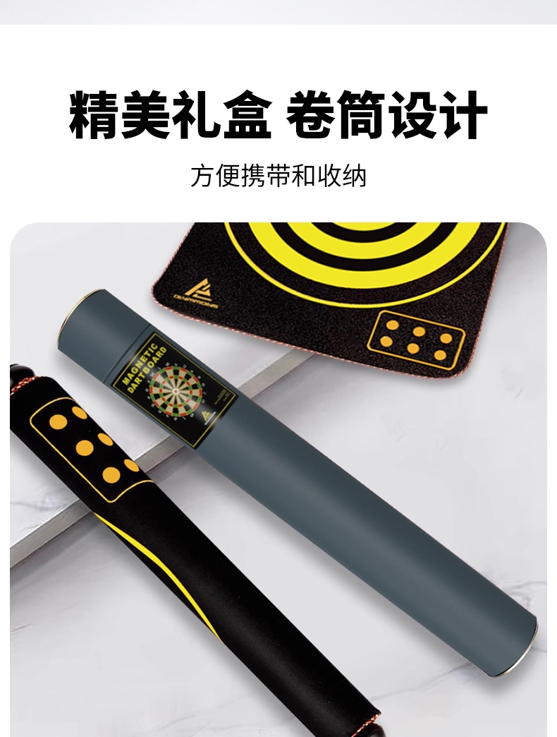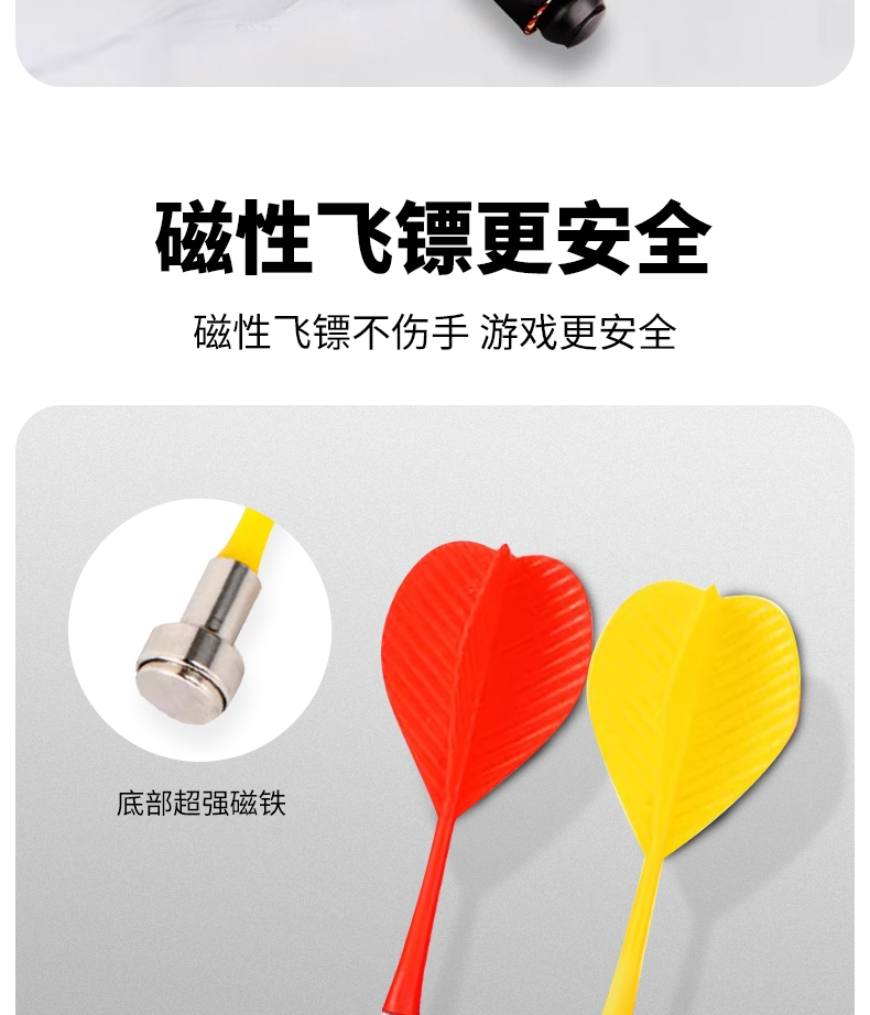 精选磁性镖头,配以防滑纹路握柄;确保投掷稳定性和精准度;绒布+ 磁性金属板靶盘;分区清晰,耐扎耐用,轻松还原赛场体验