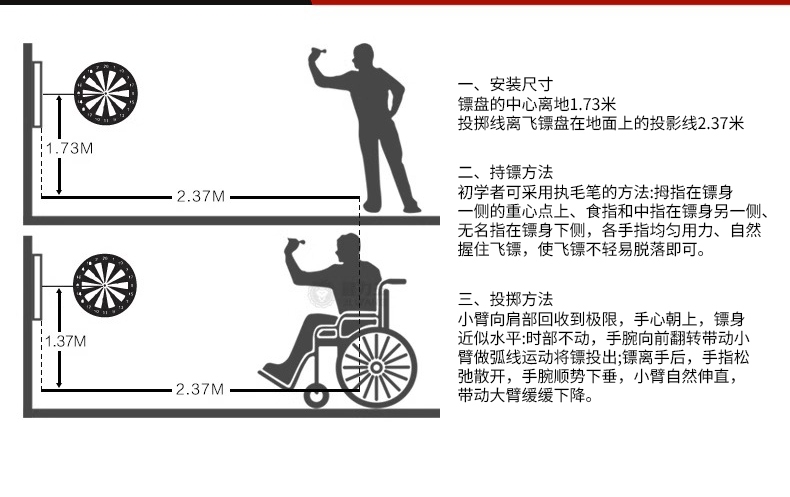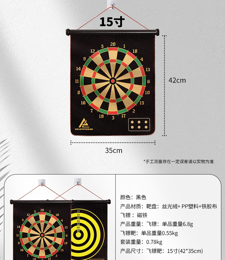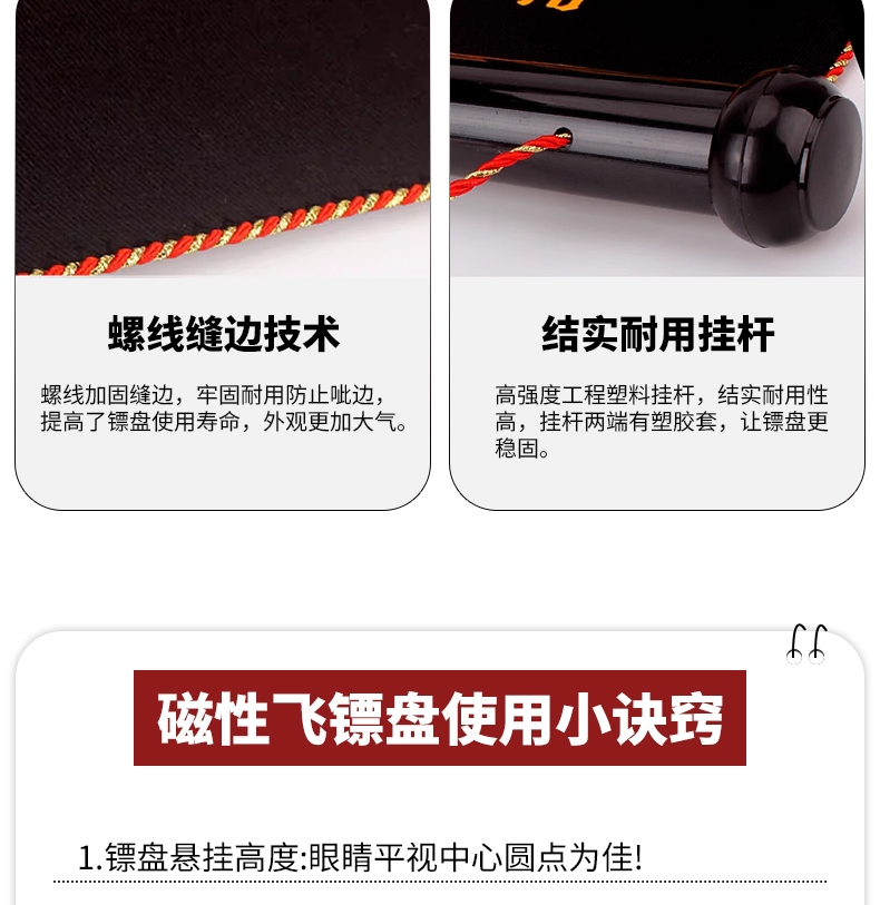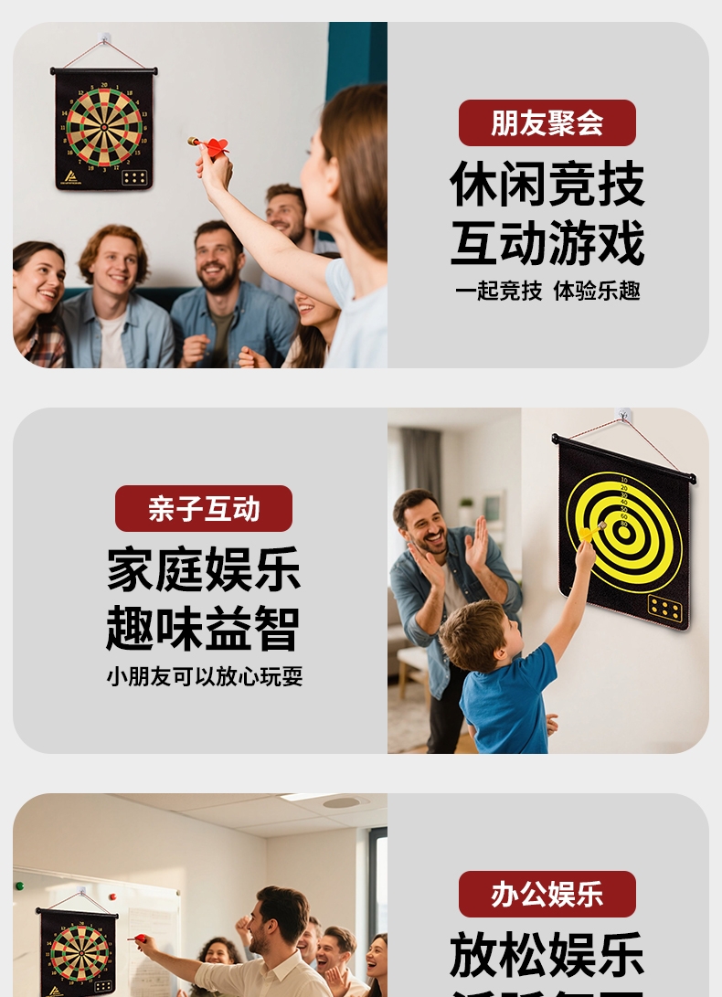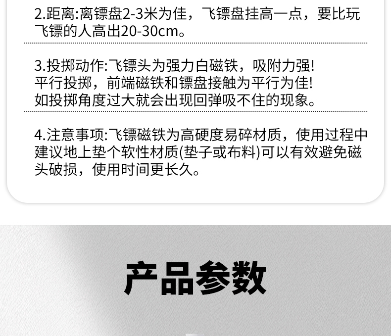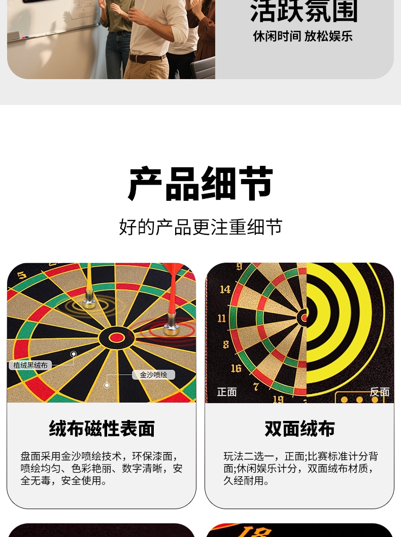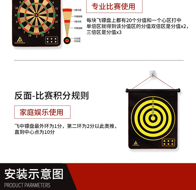 精选磁性镖头,配以防滑纹路握柄;确保投掷稳定性和精准度;绒布+ 磁性金属板靶盘;分区清晰,耐扎耐用,轻松还原赛场体验