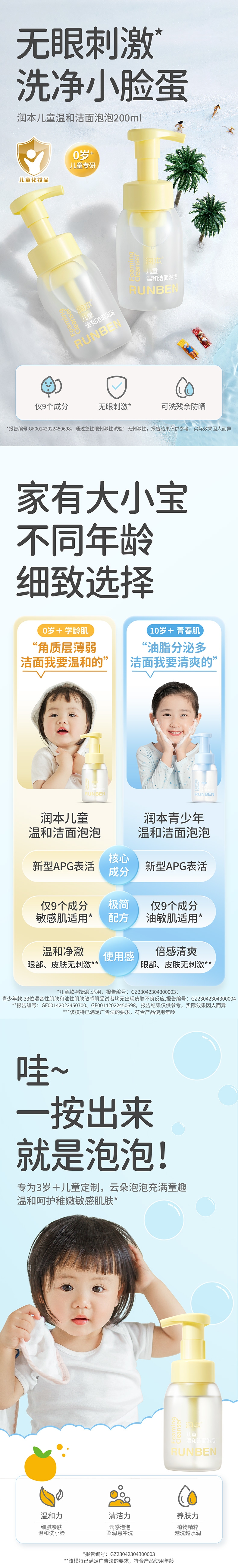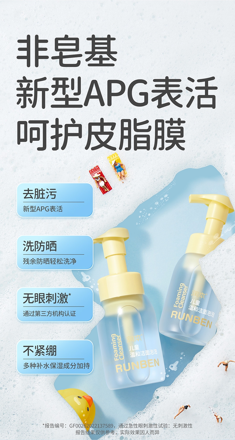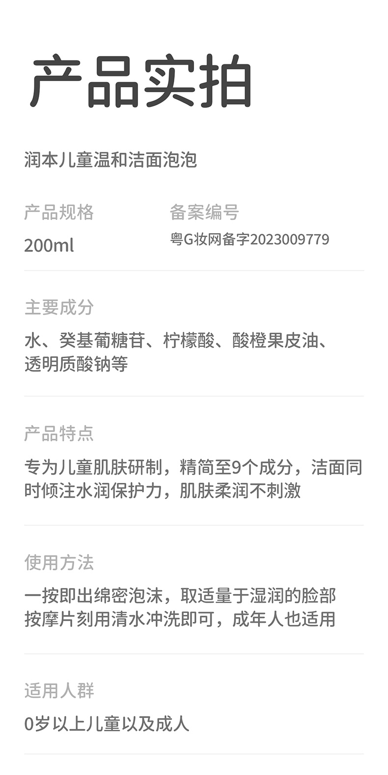 专为儿童肌肤研制;洁面同时倾注水润保护力;肌肤柔润不刺激