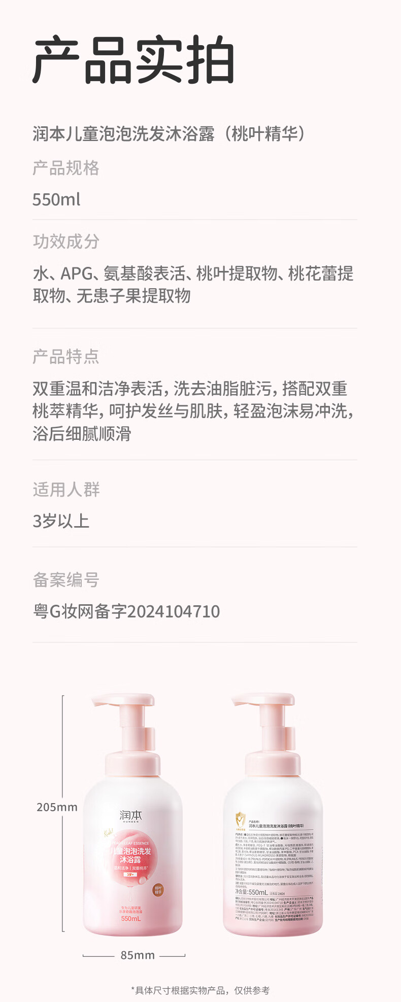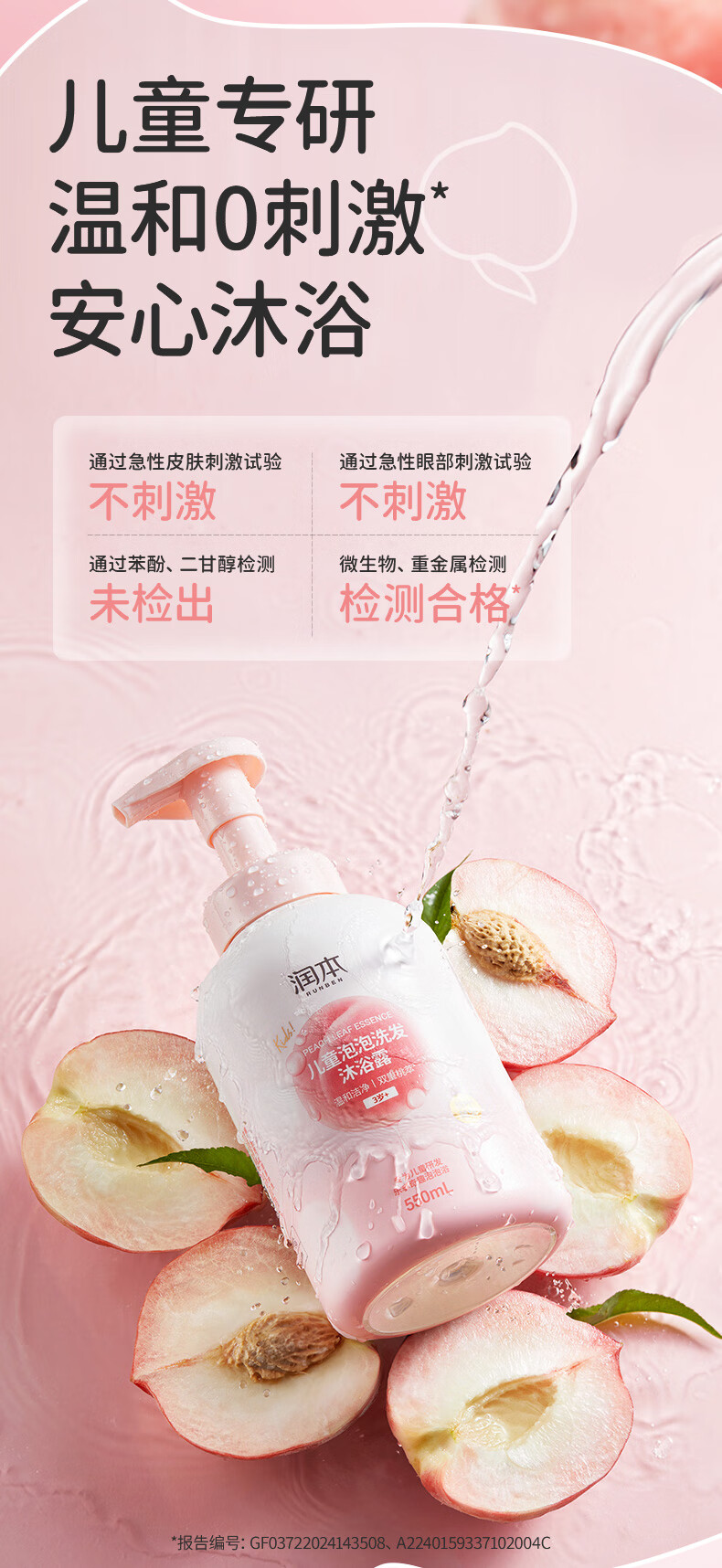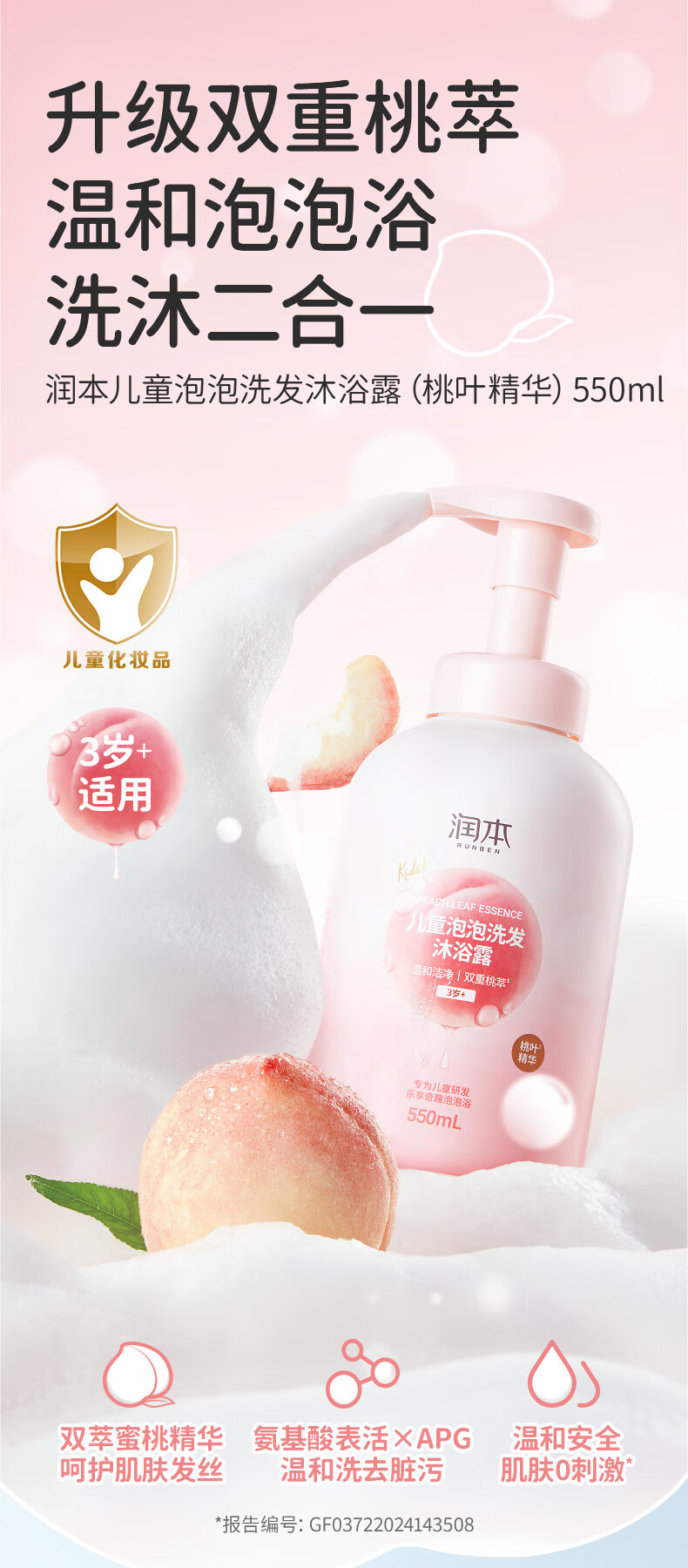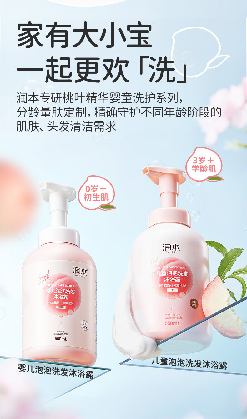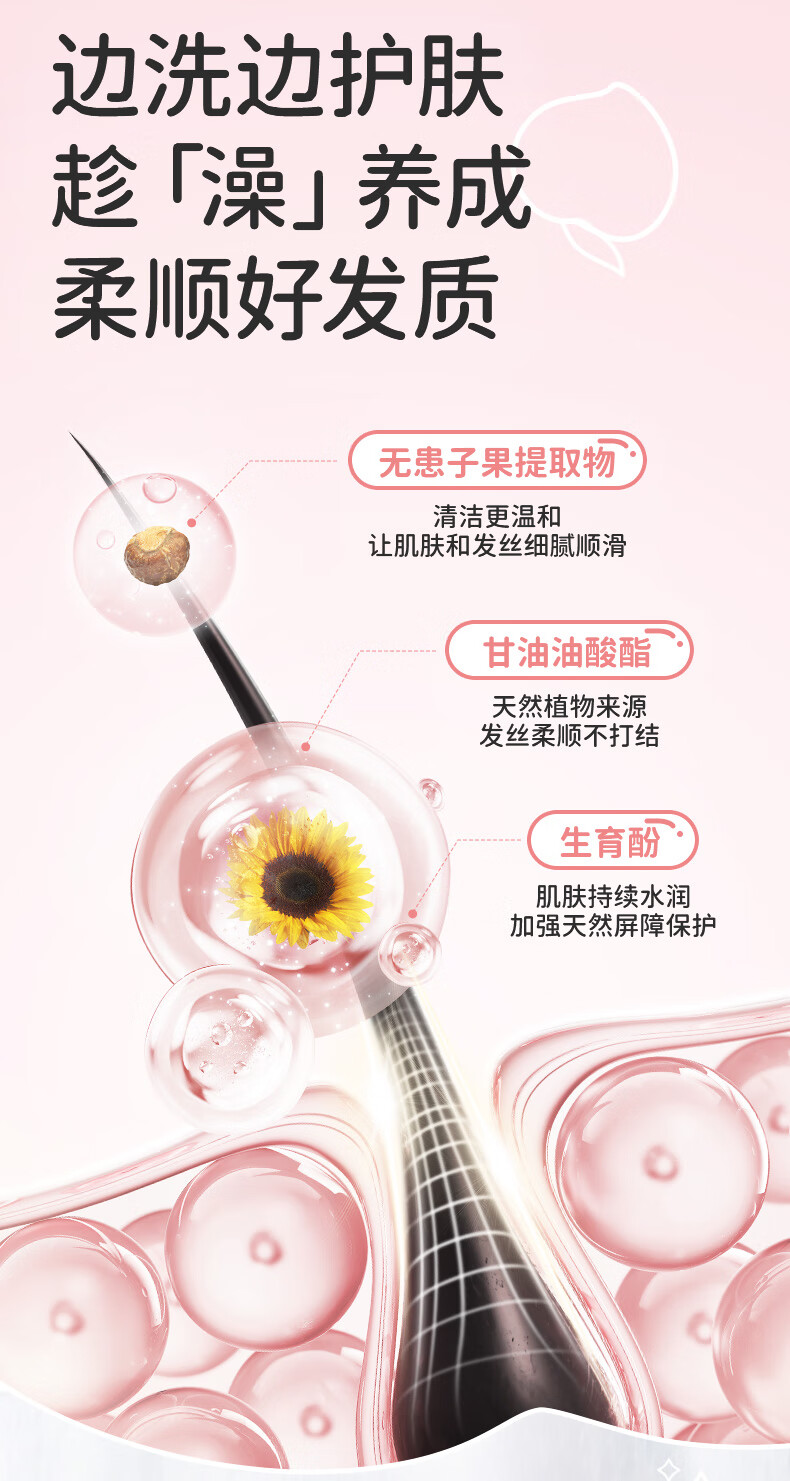 双重温和洁净表活;洗去油脂脏污,搭配双重桃萃精华;呵护发丝与肌肤,轻盈泡沫易冲洗,浴后细腻顺滑