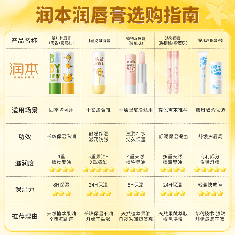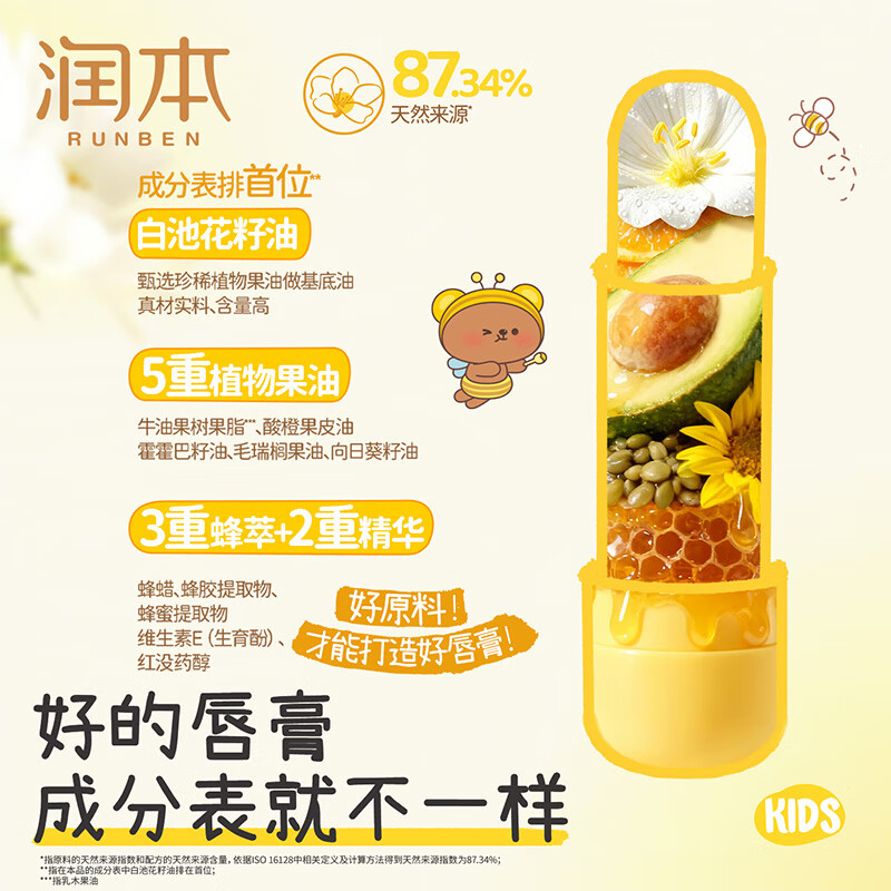 滋润保湿;舒缓干燥、紧绷、粗糙等唇肌问题;宝宝双唇持续细嫩,温和滋润宝宝双唇,无毒不刺激